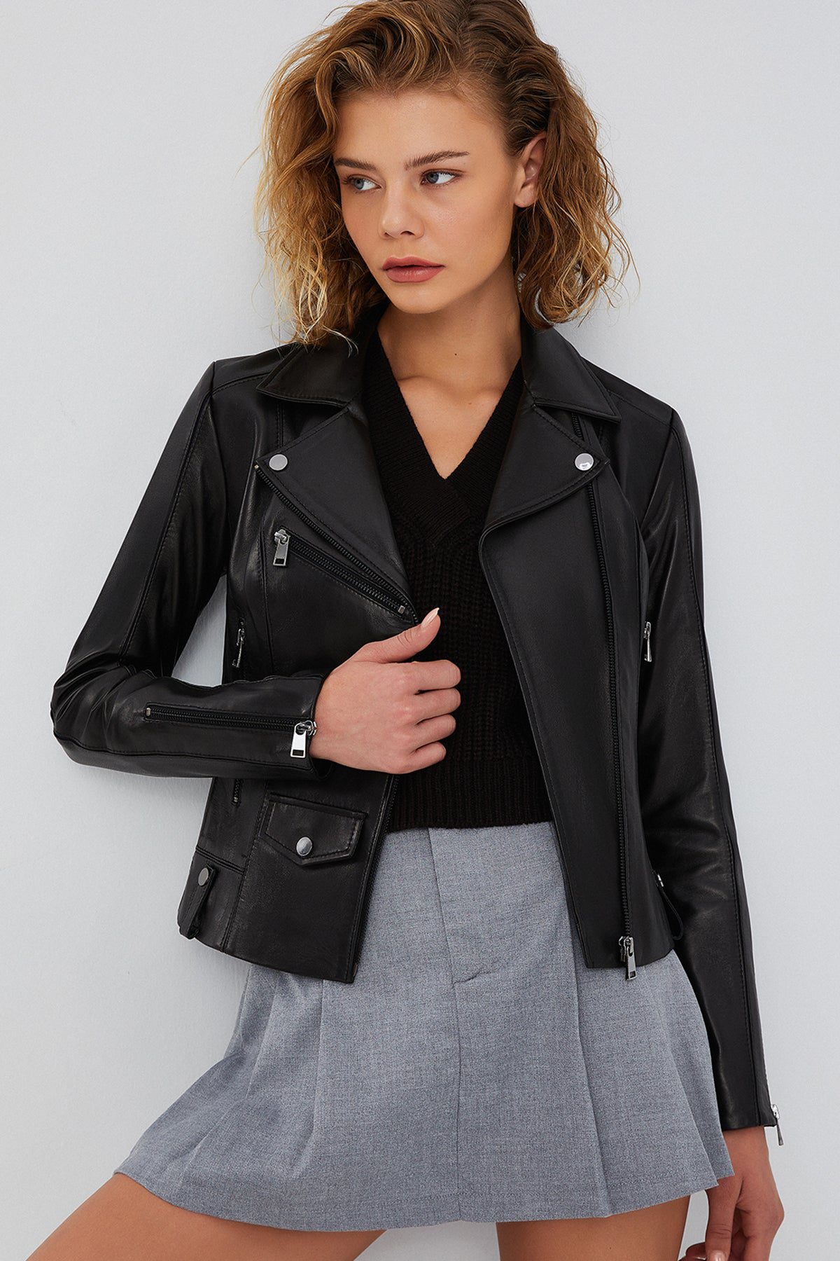 Bella Kadın Siyah Slim-Fit Biker Deri Ceket