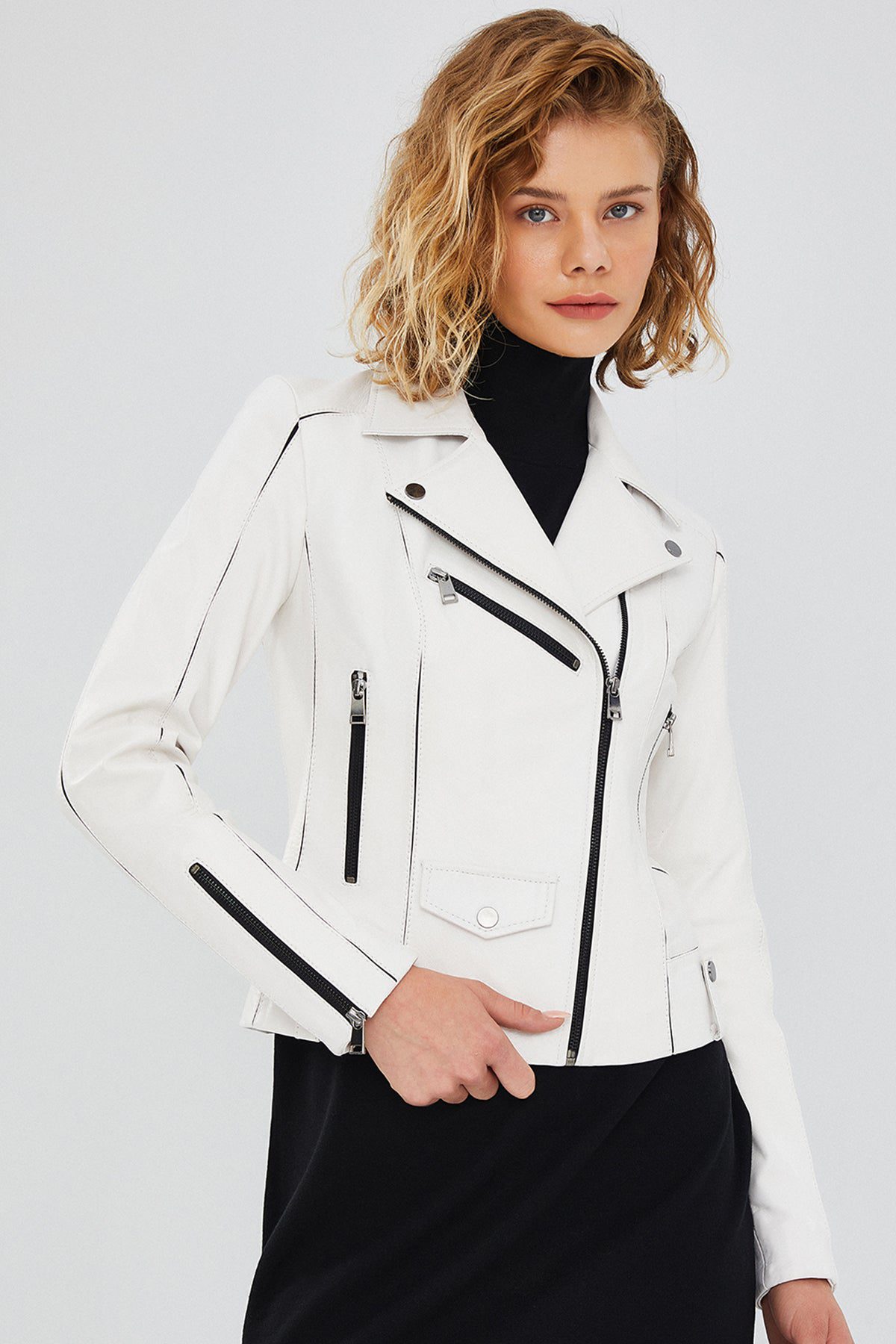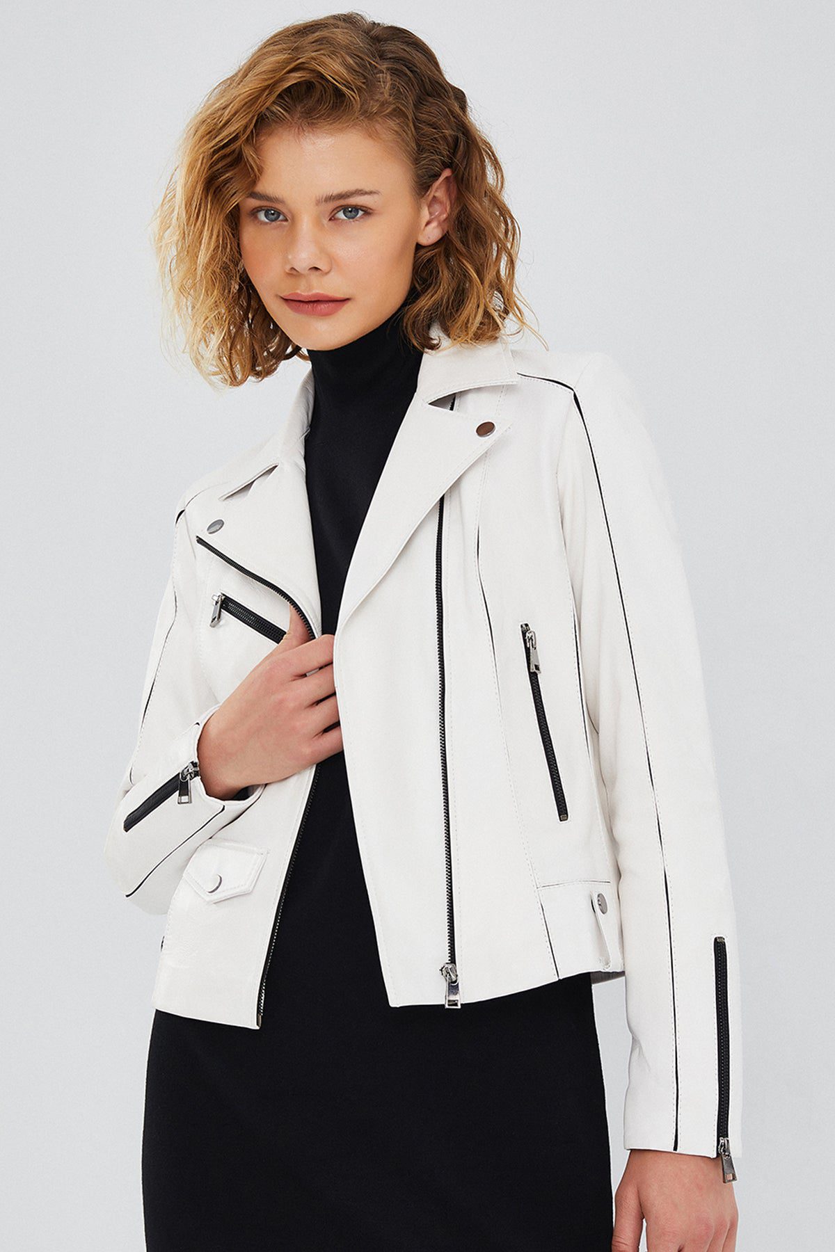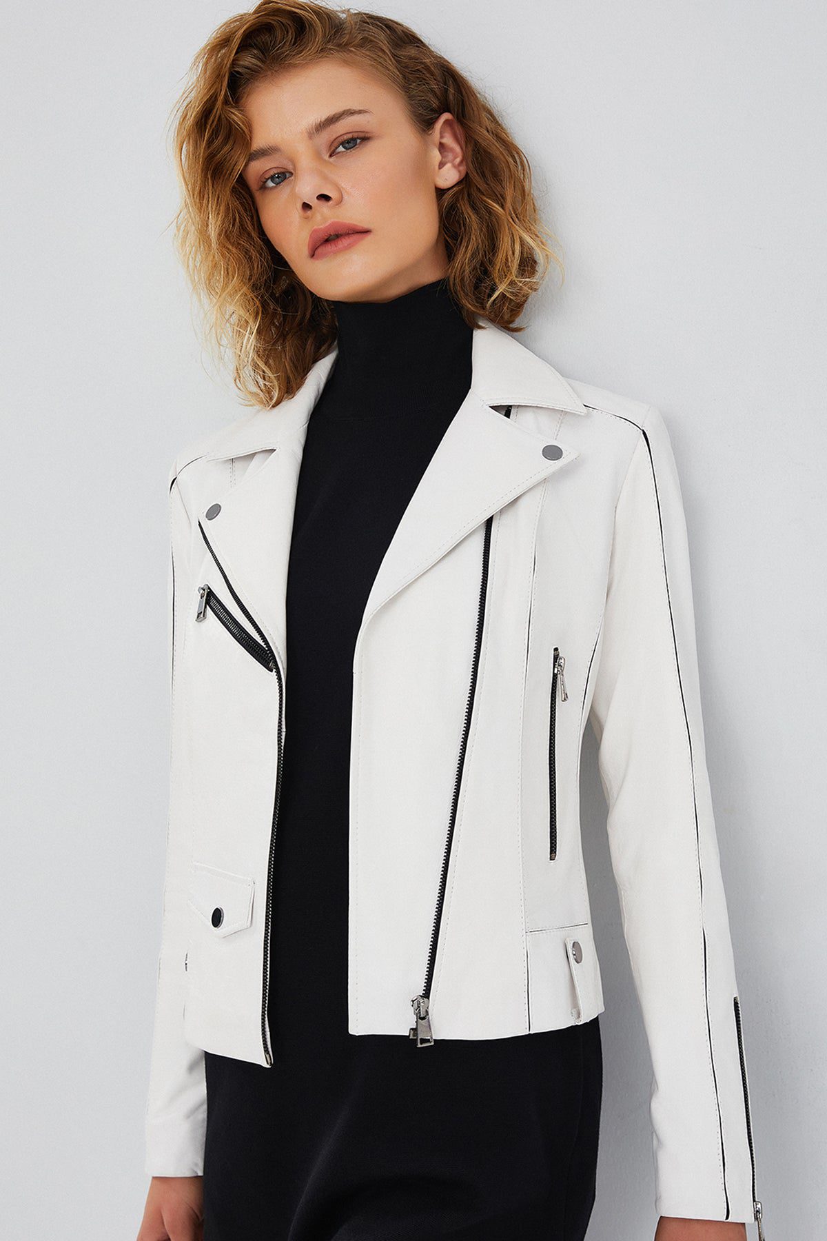 Bella Kadın Beyaz Slim-Fit Biker Deri Ceket