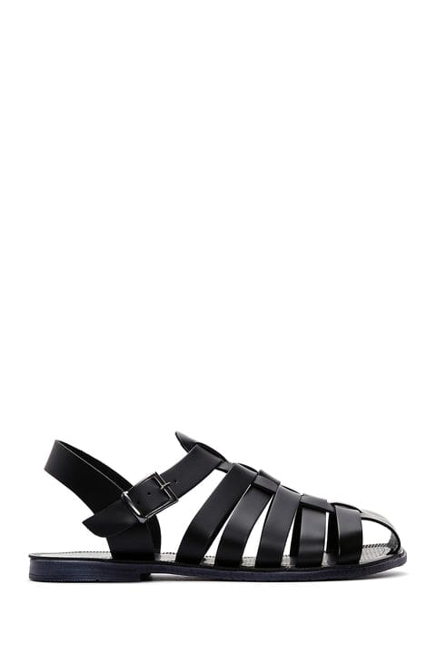 Erkek Siyah Deri Tokalı Düz Sandalet