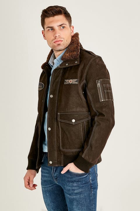 Air Force Erkek Kahverengi Yakası Kürklü Armalı Nubuk Deri Pilot Mont