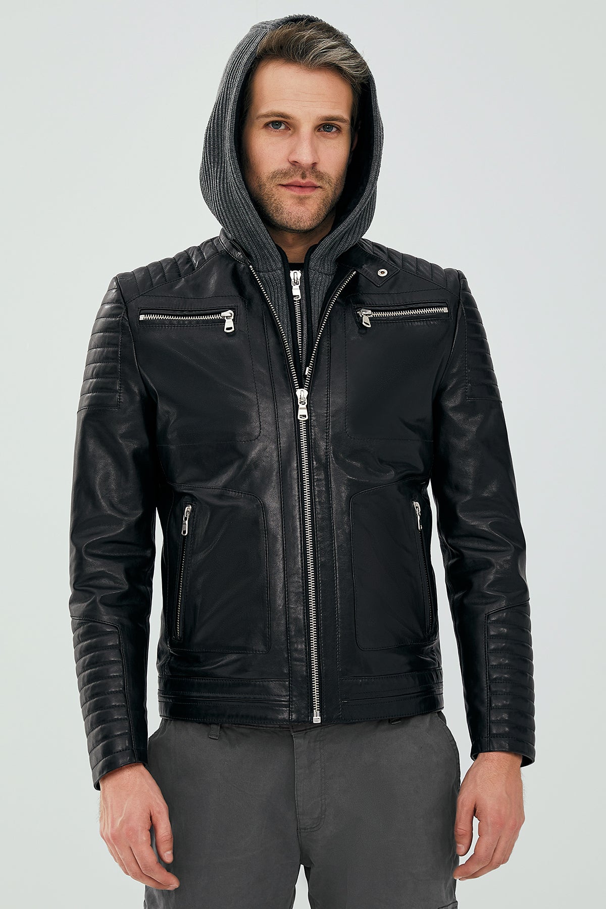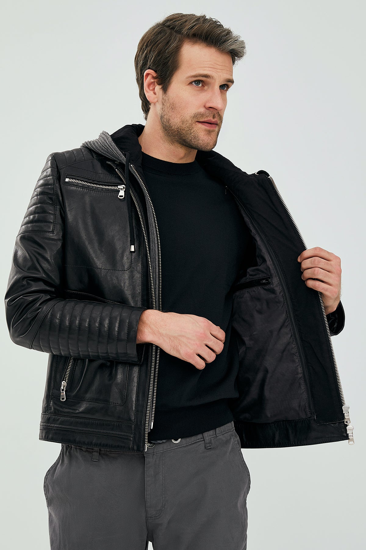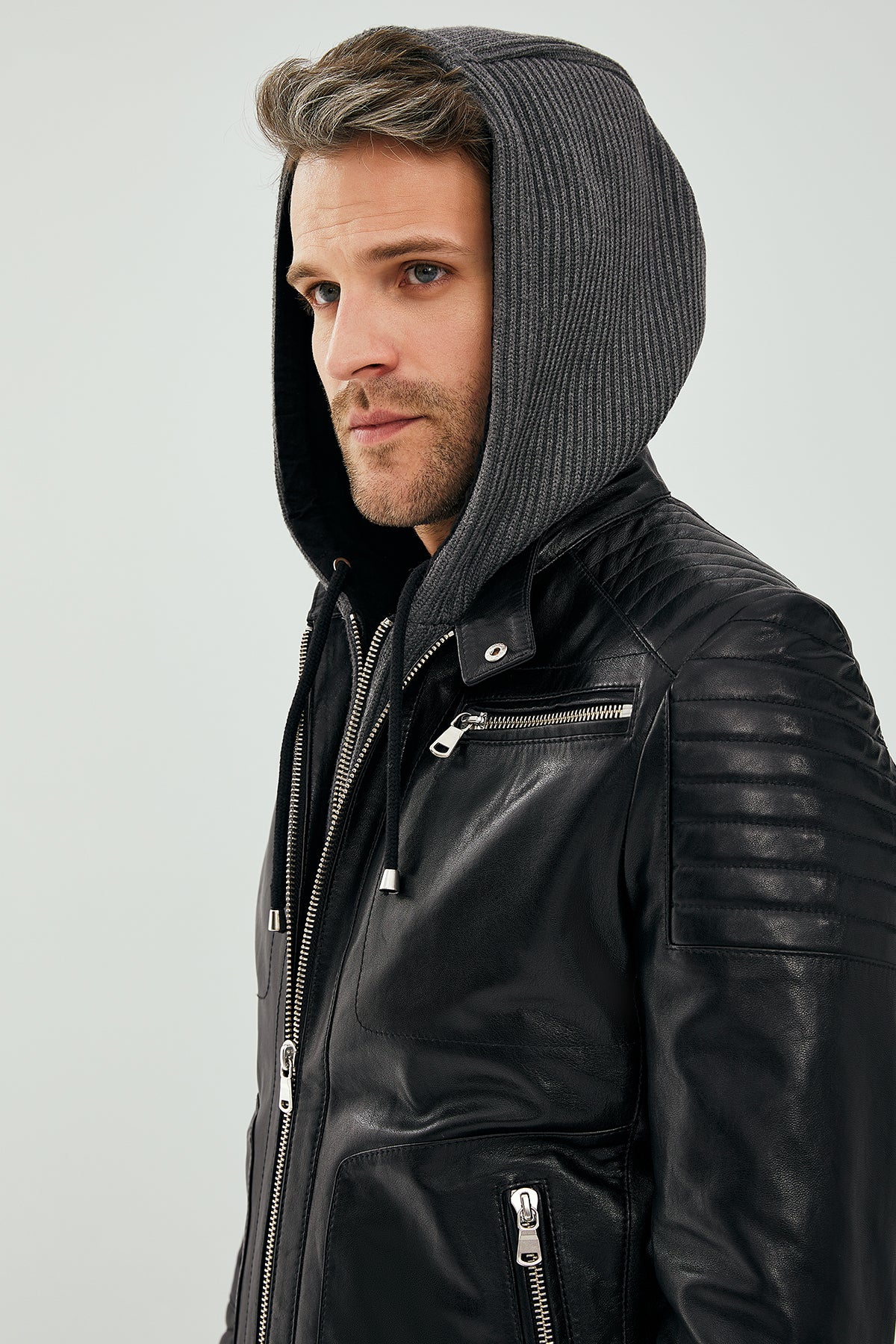 کاپشن چرم اسپرت کلاهدار مردانه مشکی دنجر دری مد