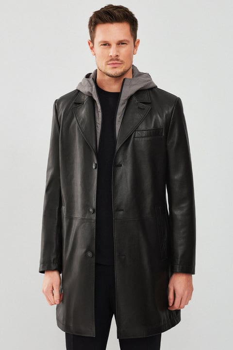 Dias Erkek Siyah Kapüşonlu Uzun Deri Ceket