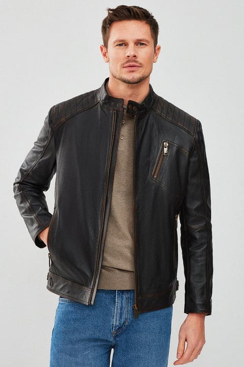 New Durant Erkek Siyah Slim-Fit Vintage Deri Mont