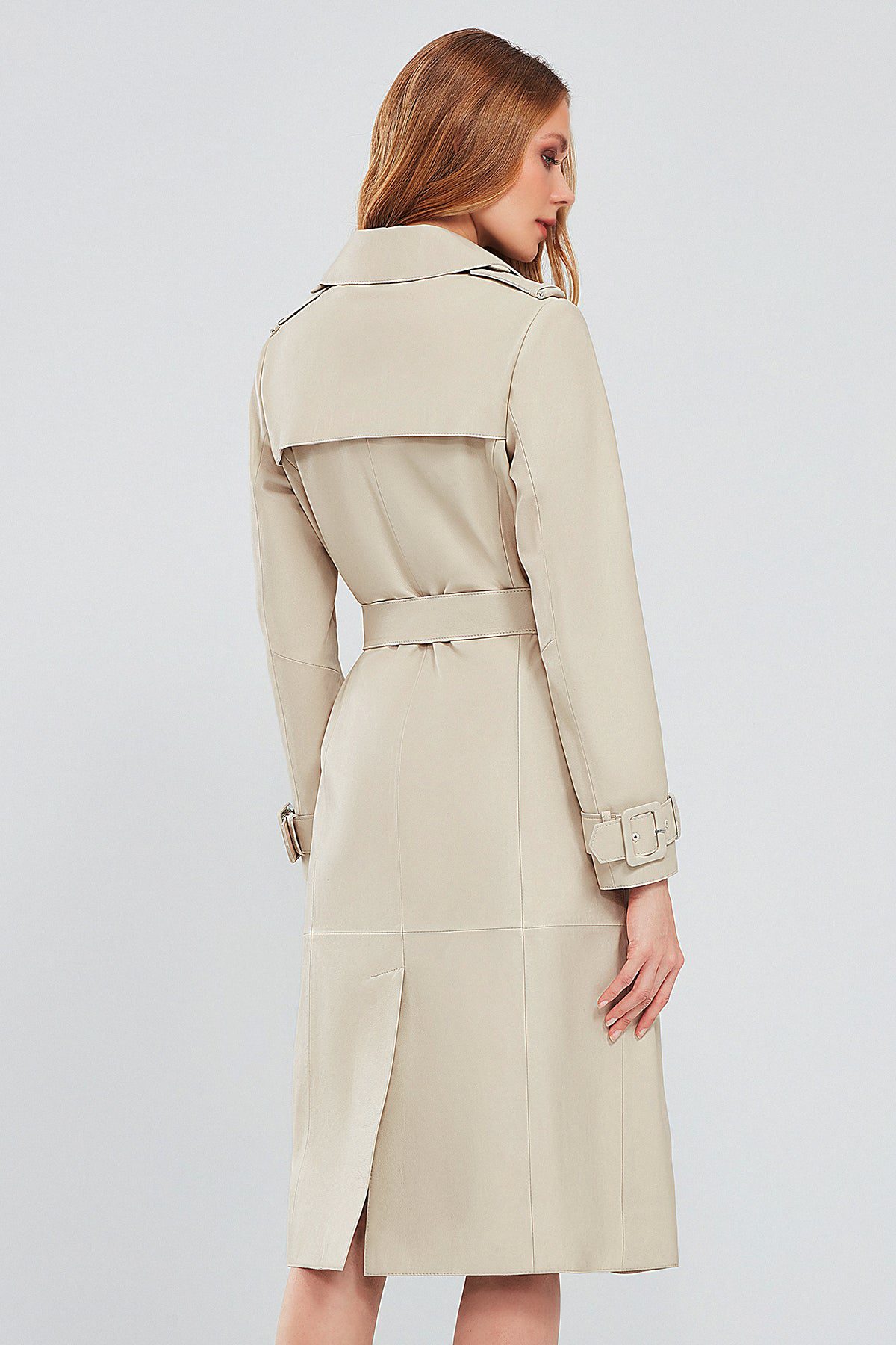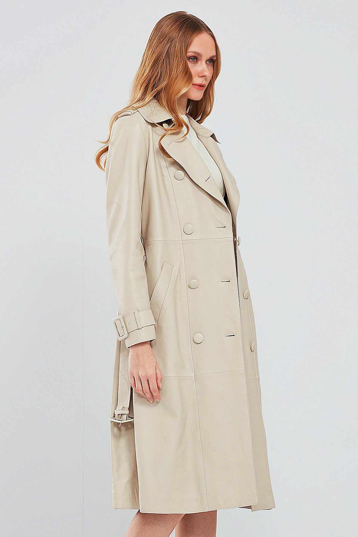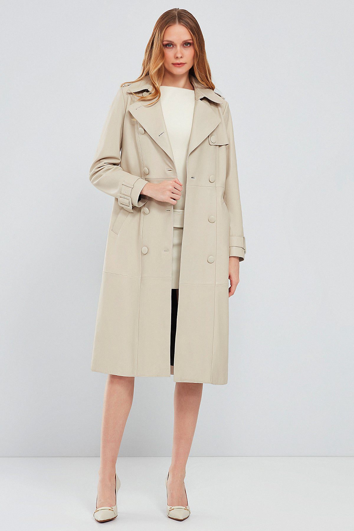 Fergie Kadın Bej Uzun Deri Trençkot