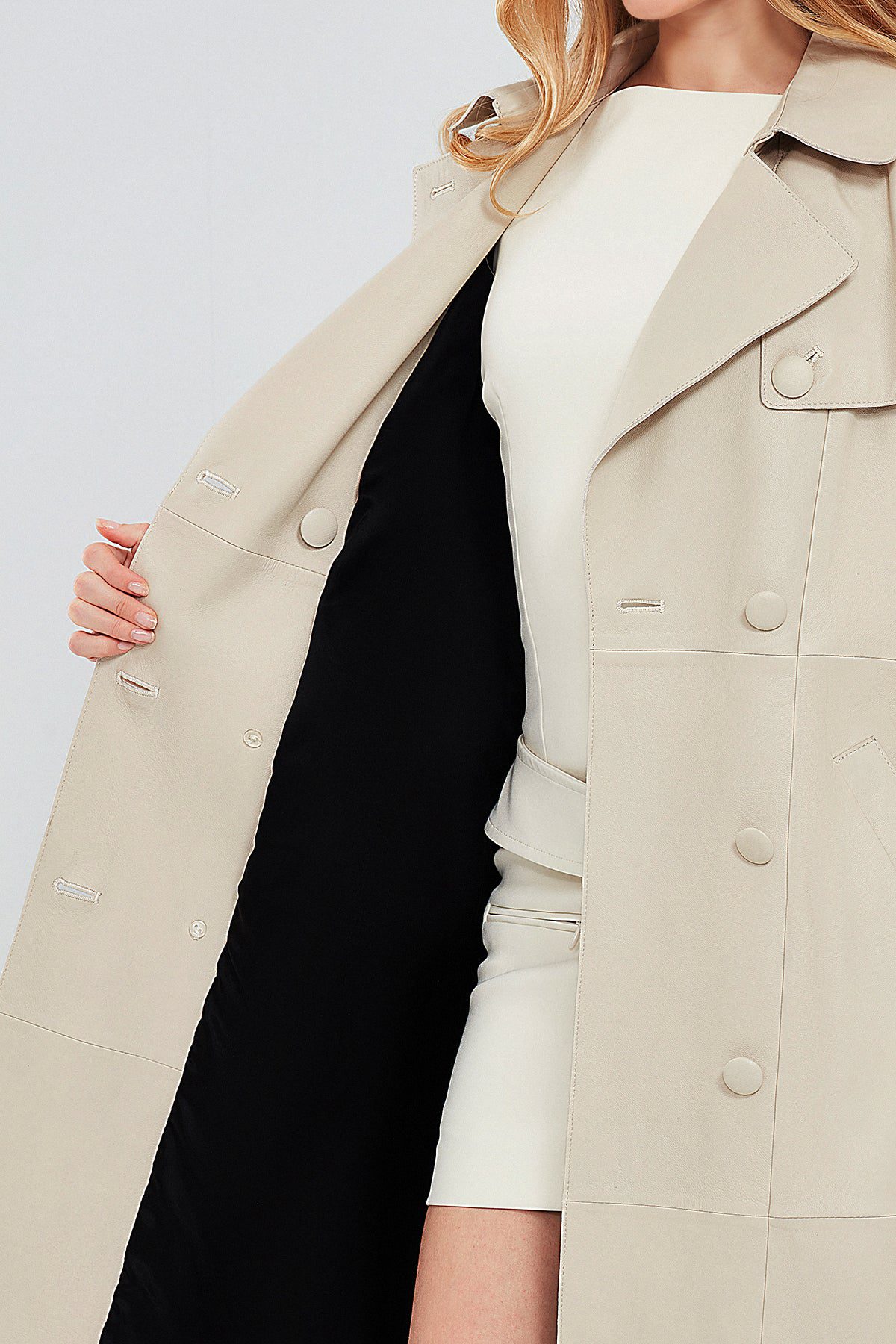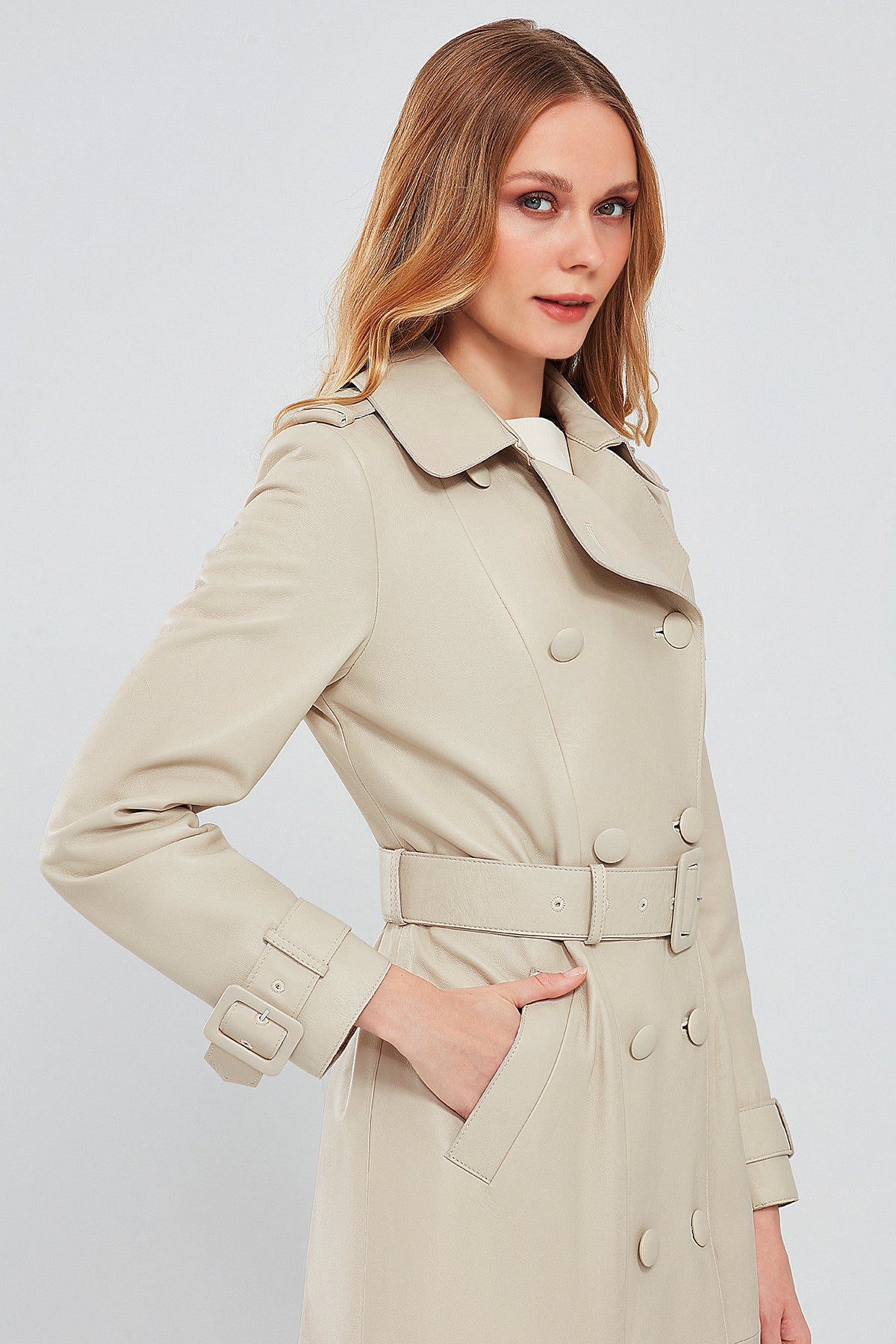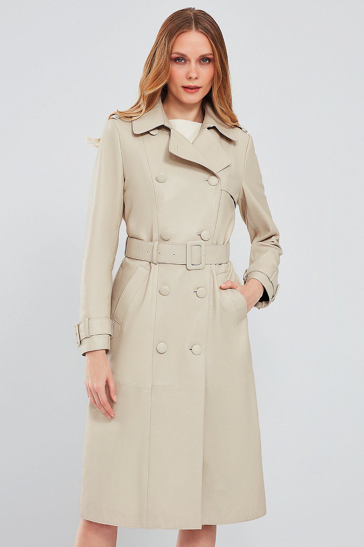Fergie Kadın Bej Uzun Deri Trençkot