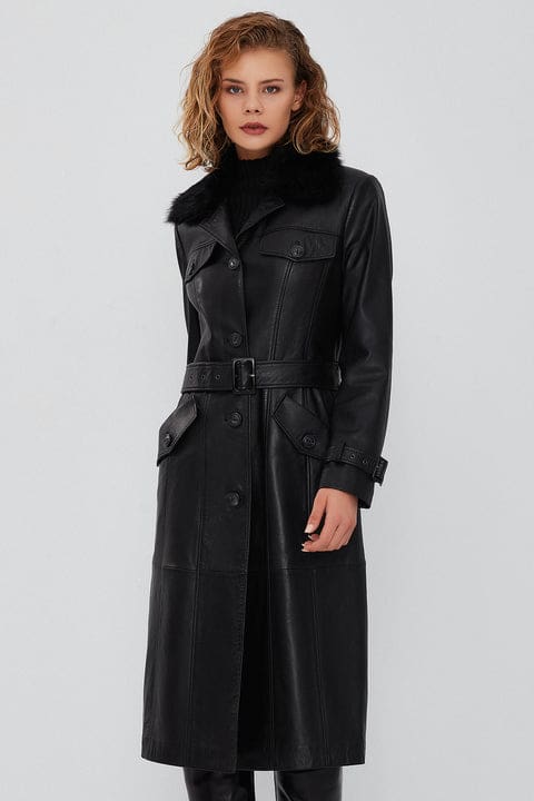 Fonda Kadın Siyah Kürklü Deri Pardösü