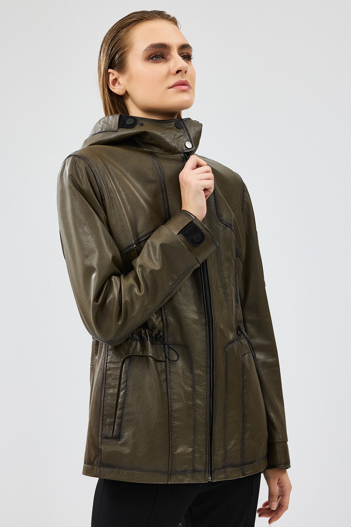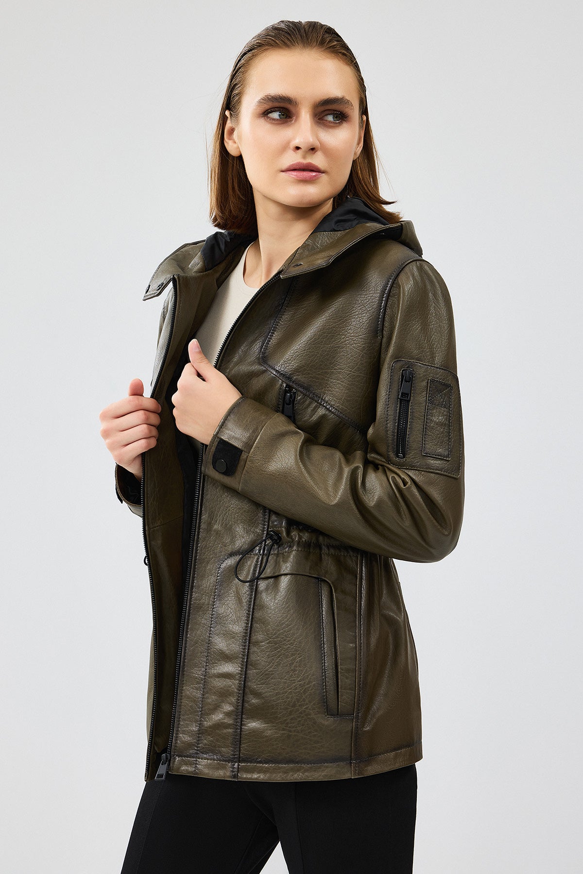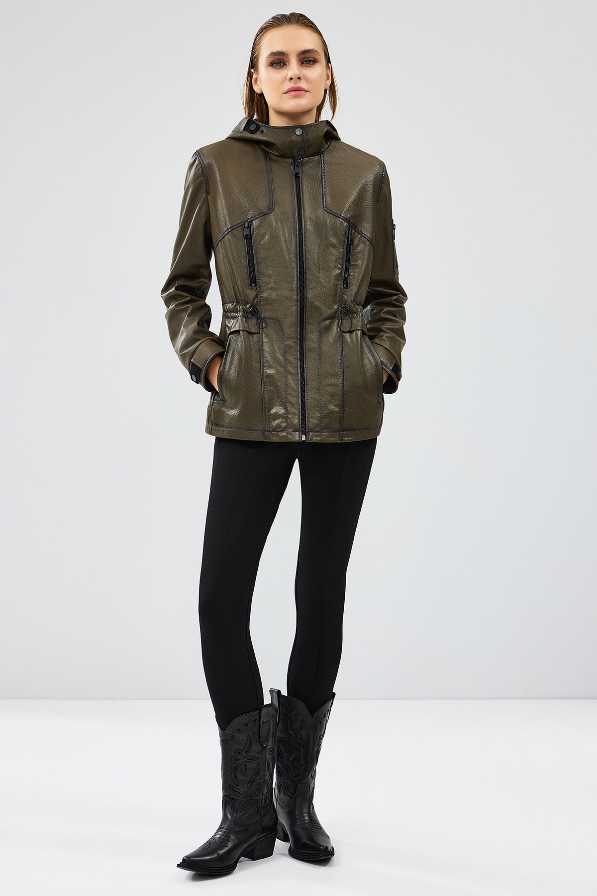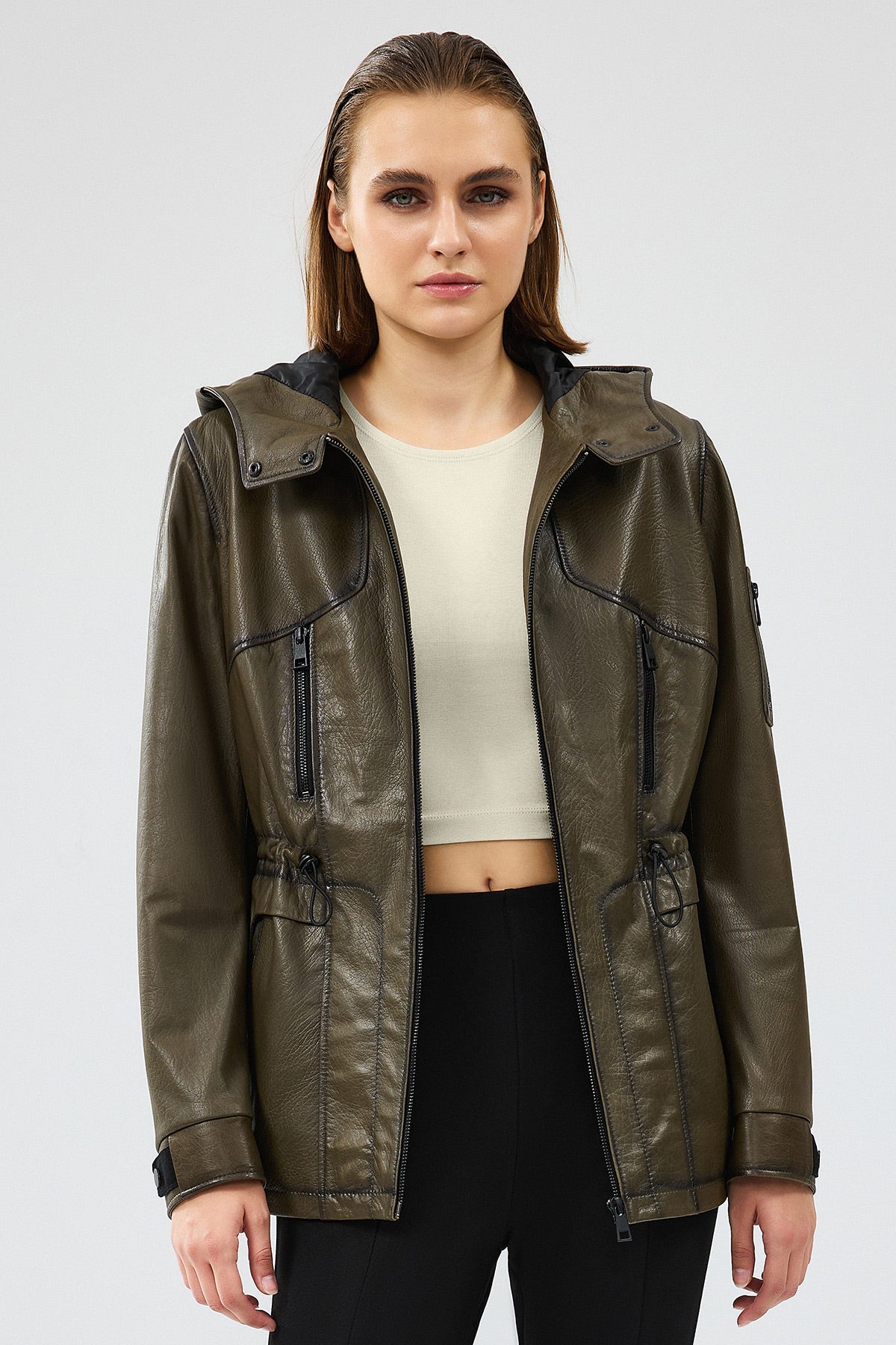 Jessica Kadın Haki Kapüşonlu Deri Ceket