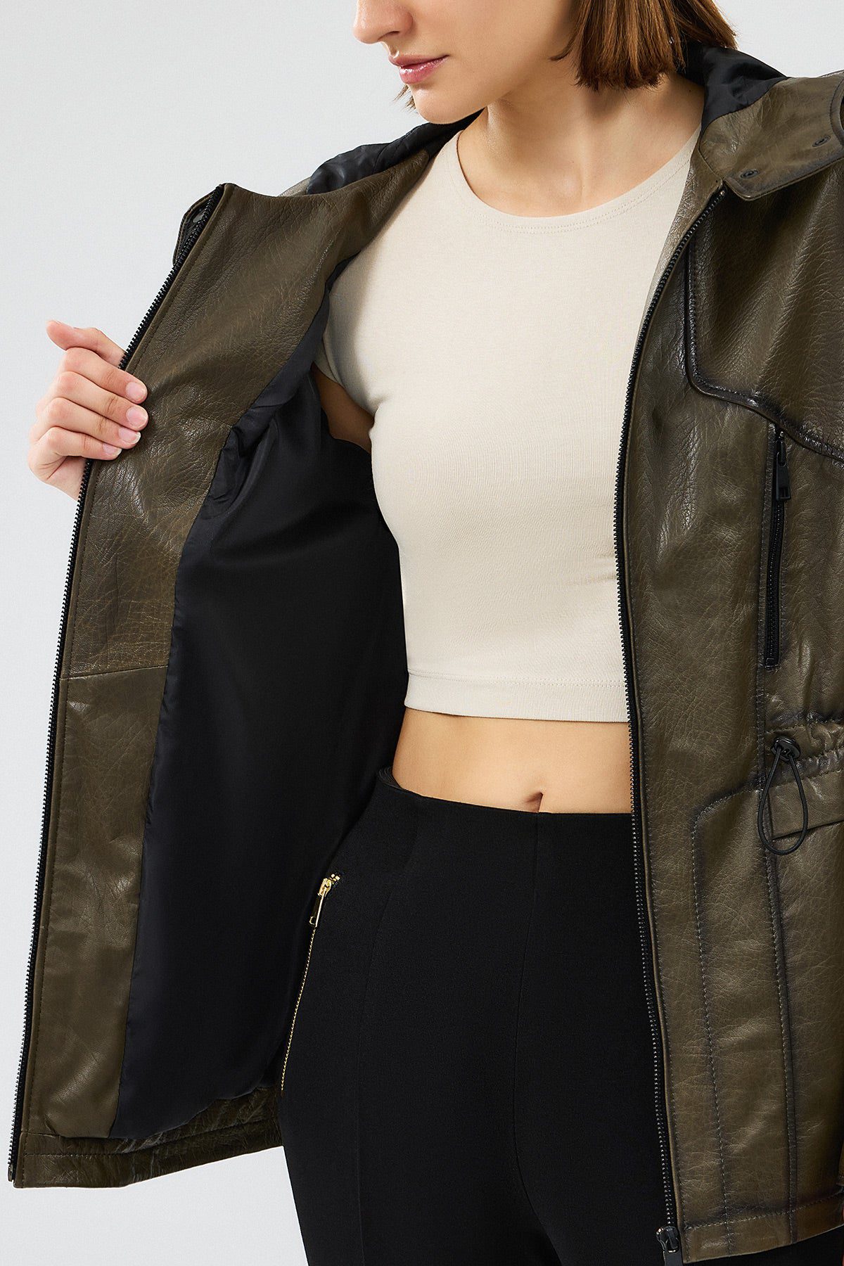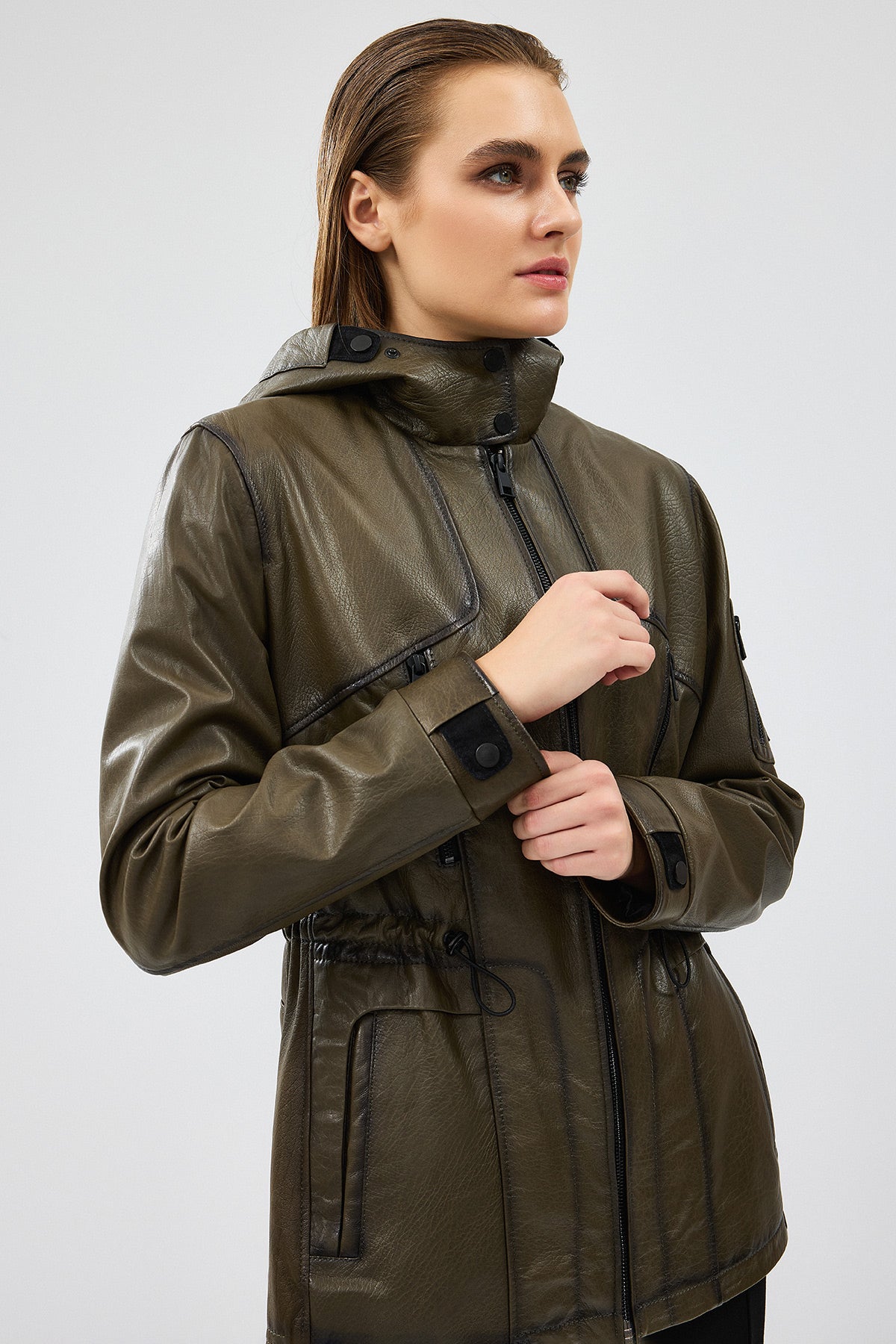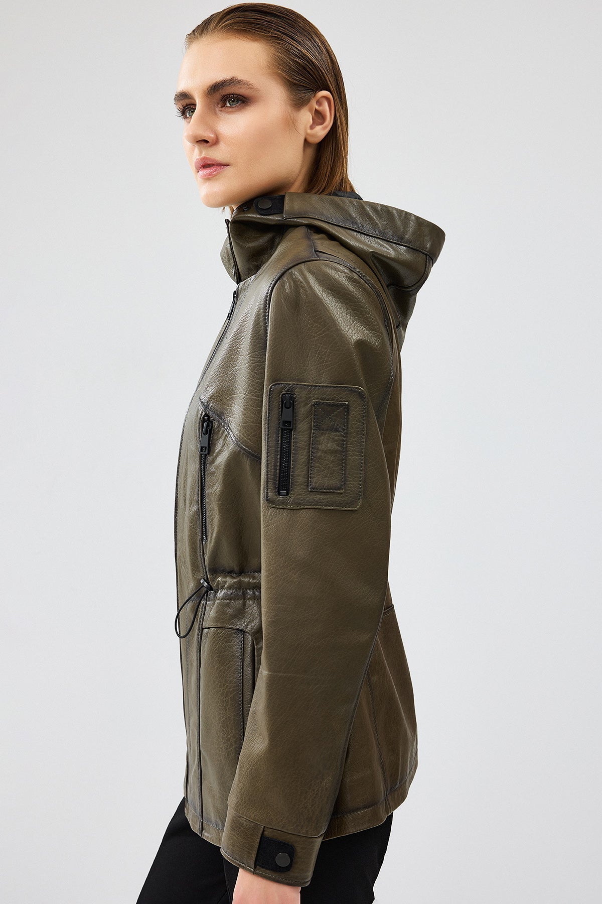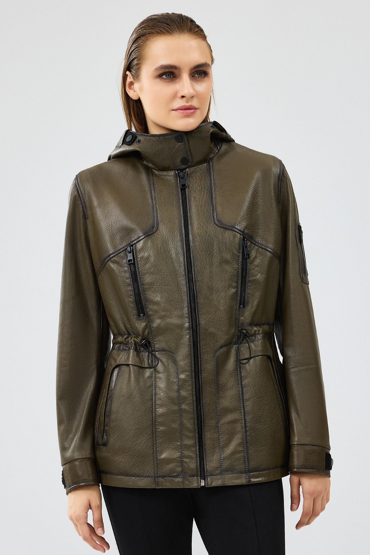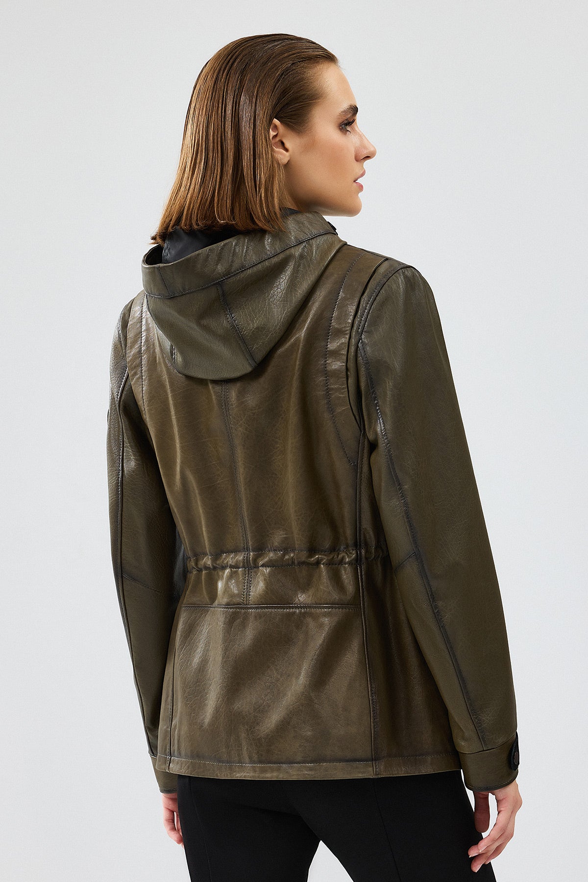Jessica Kadın Haki Kapüşonlu Deri Ceket