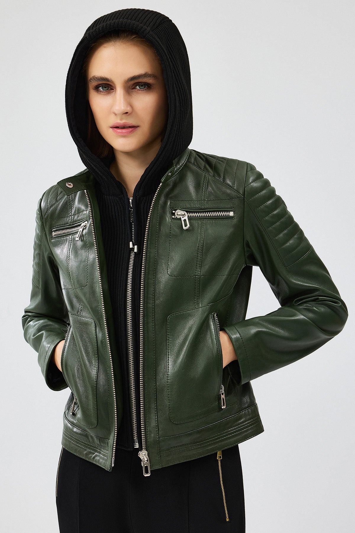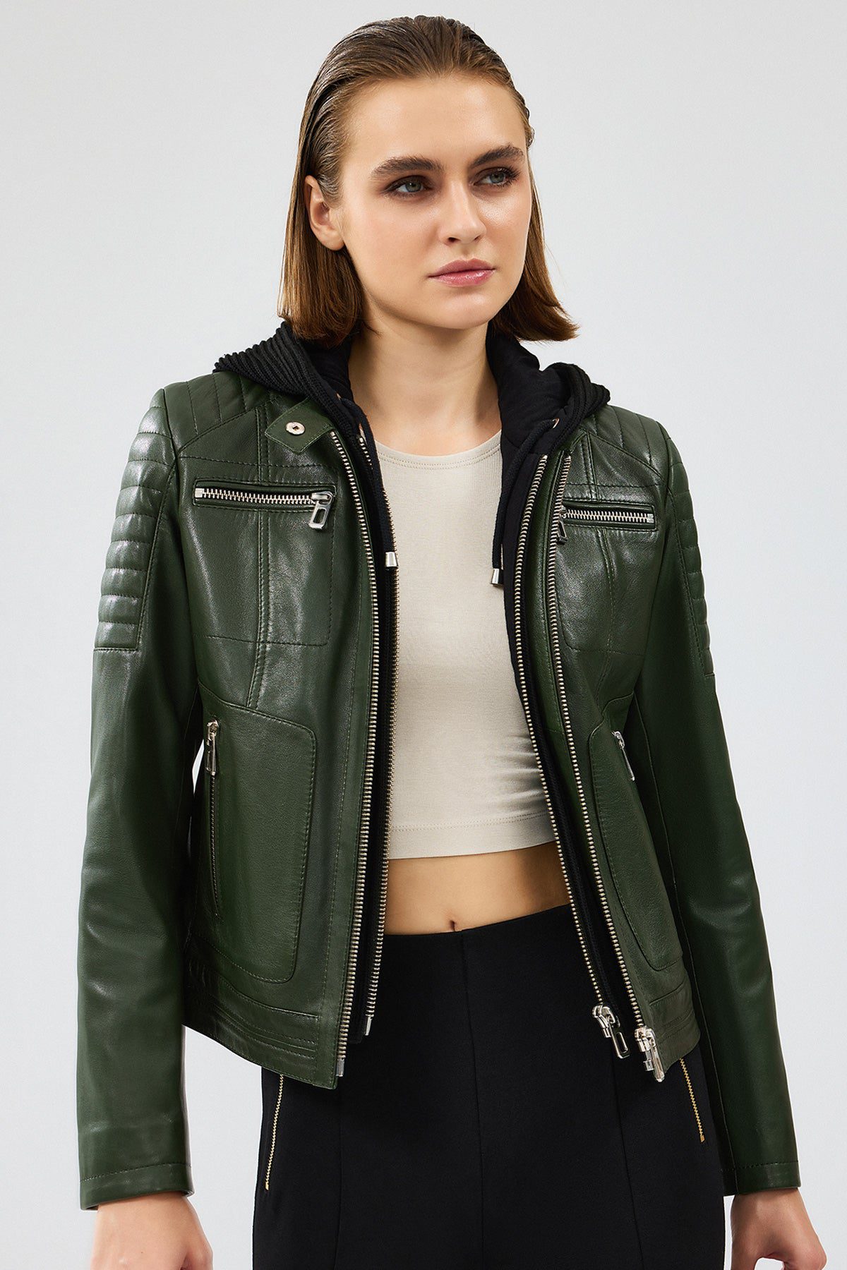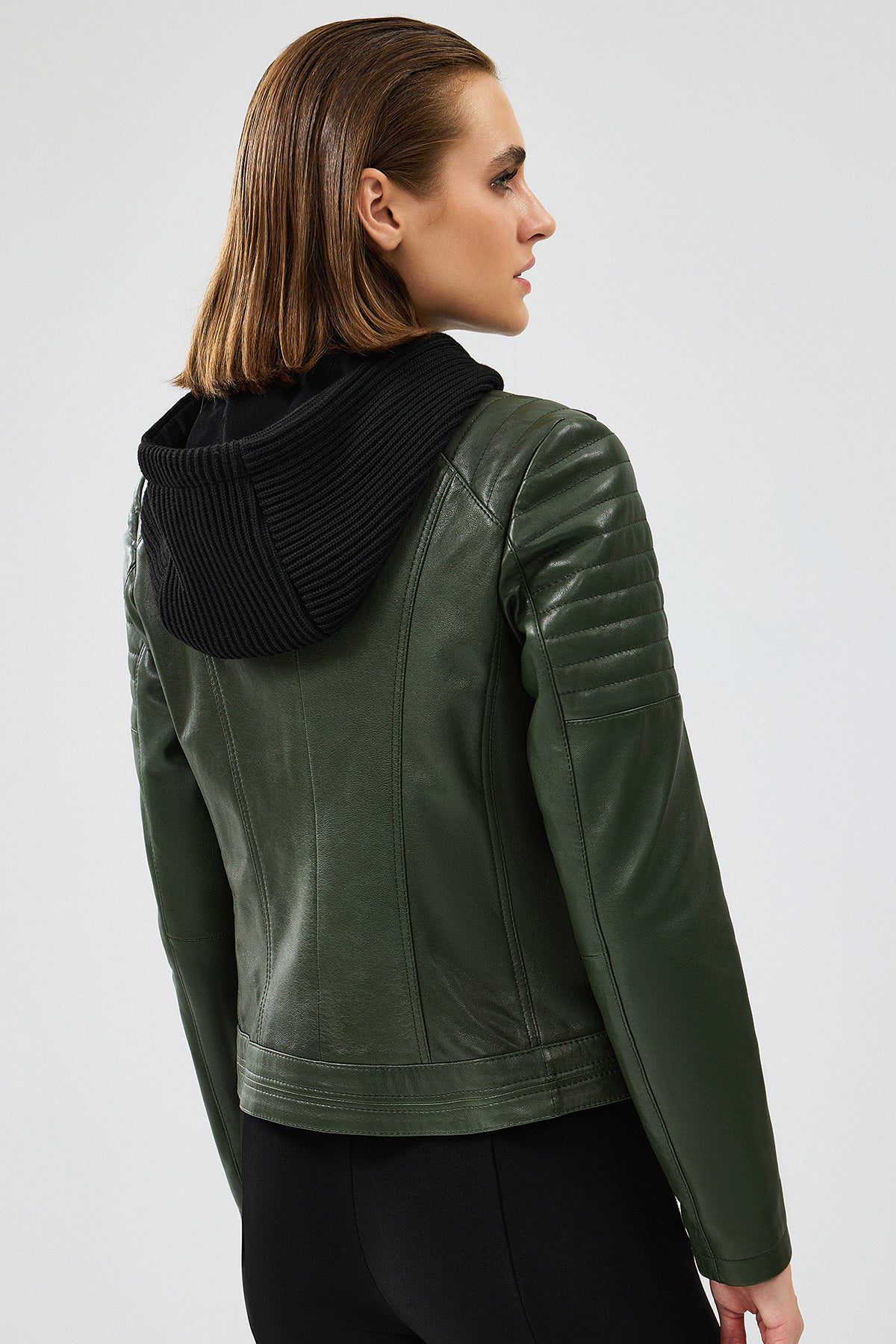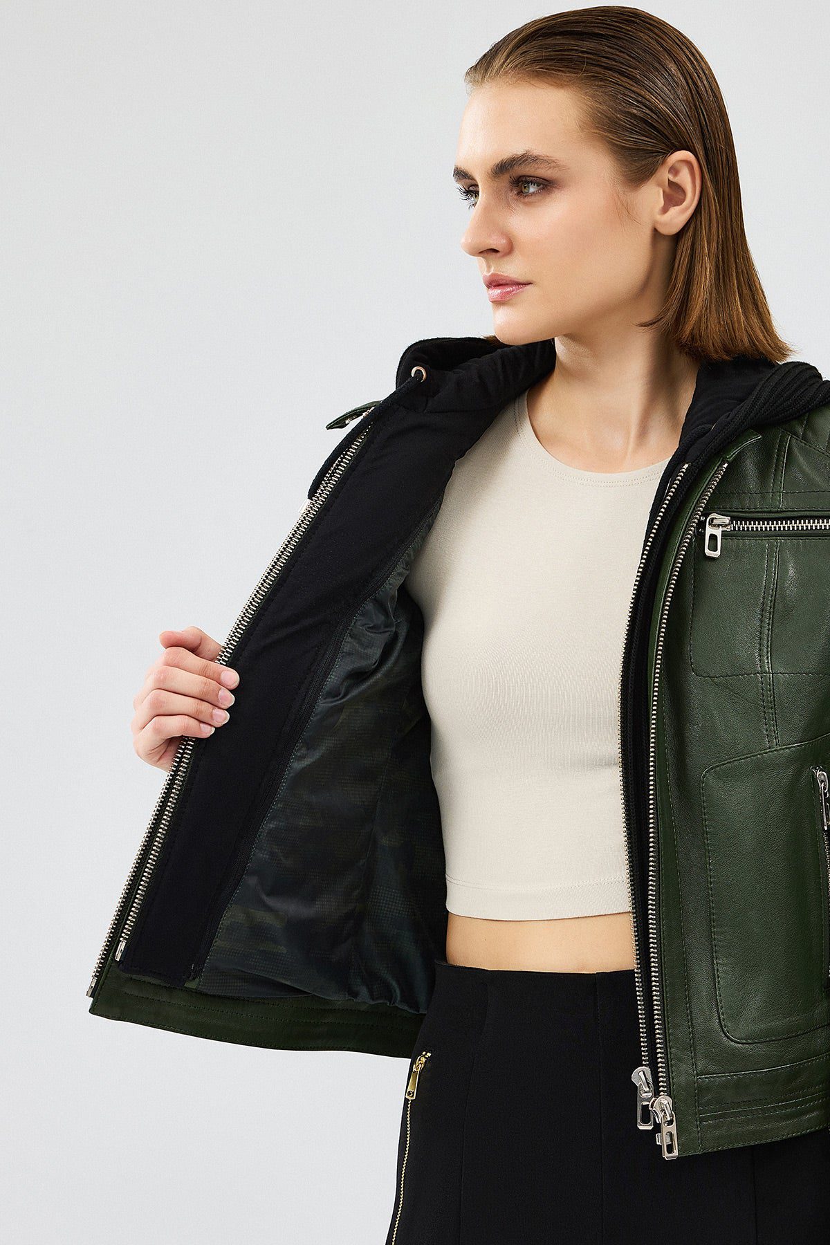 Zoom Kadın Haki Kapüşonlu Kısa Deri Ceket