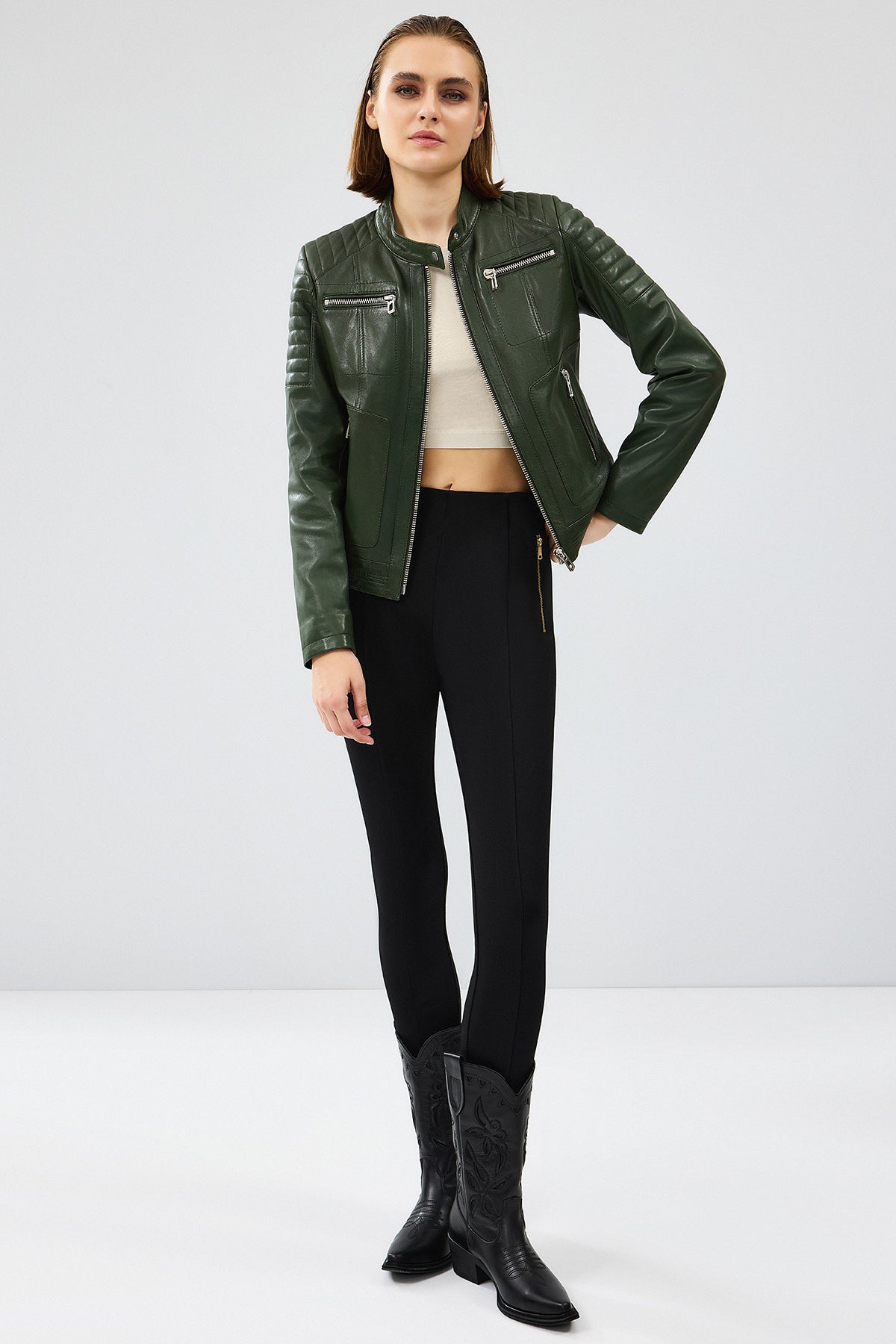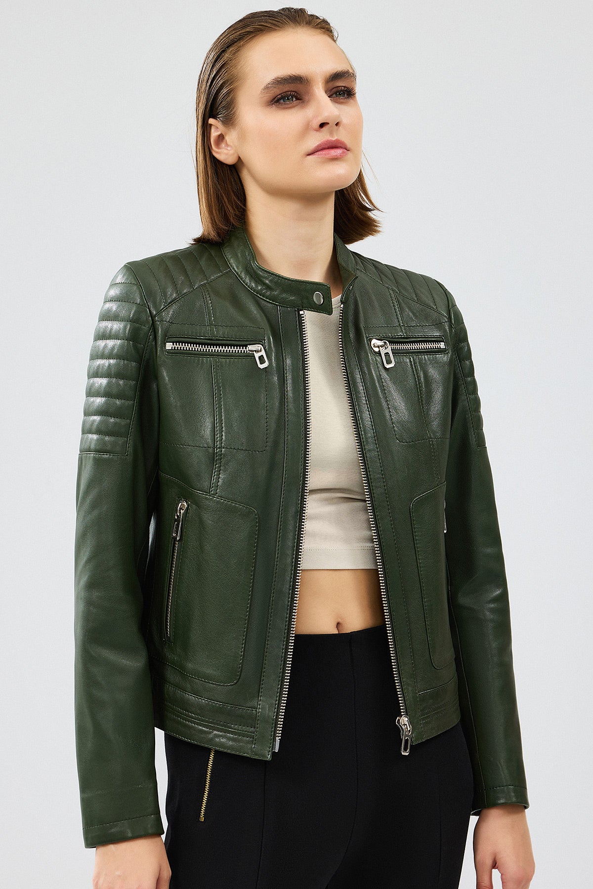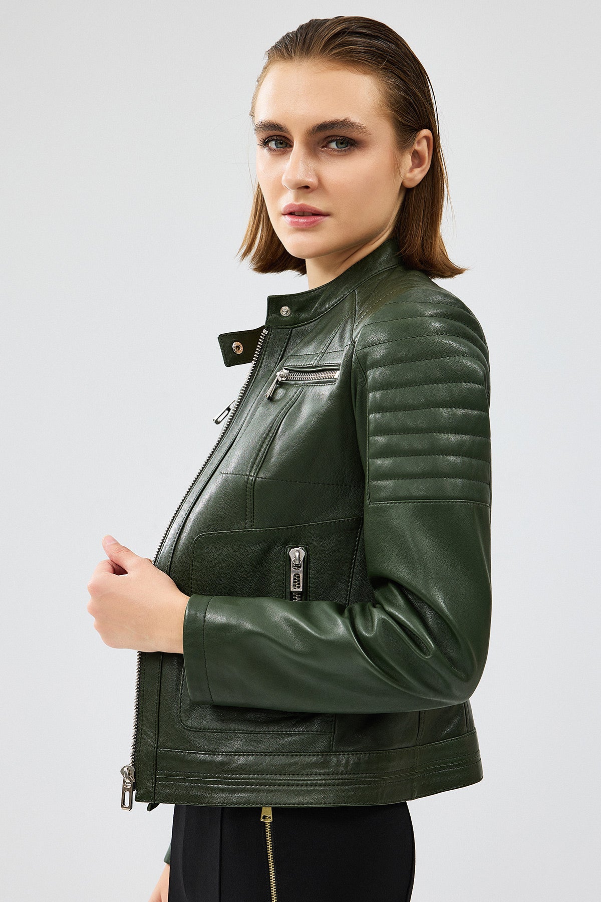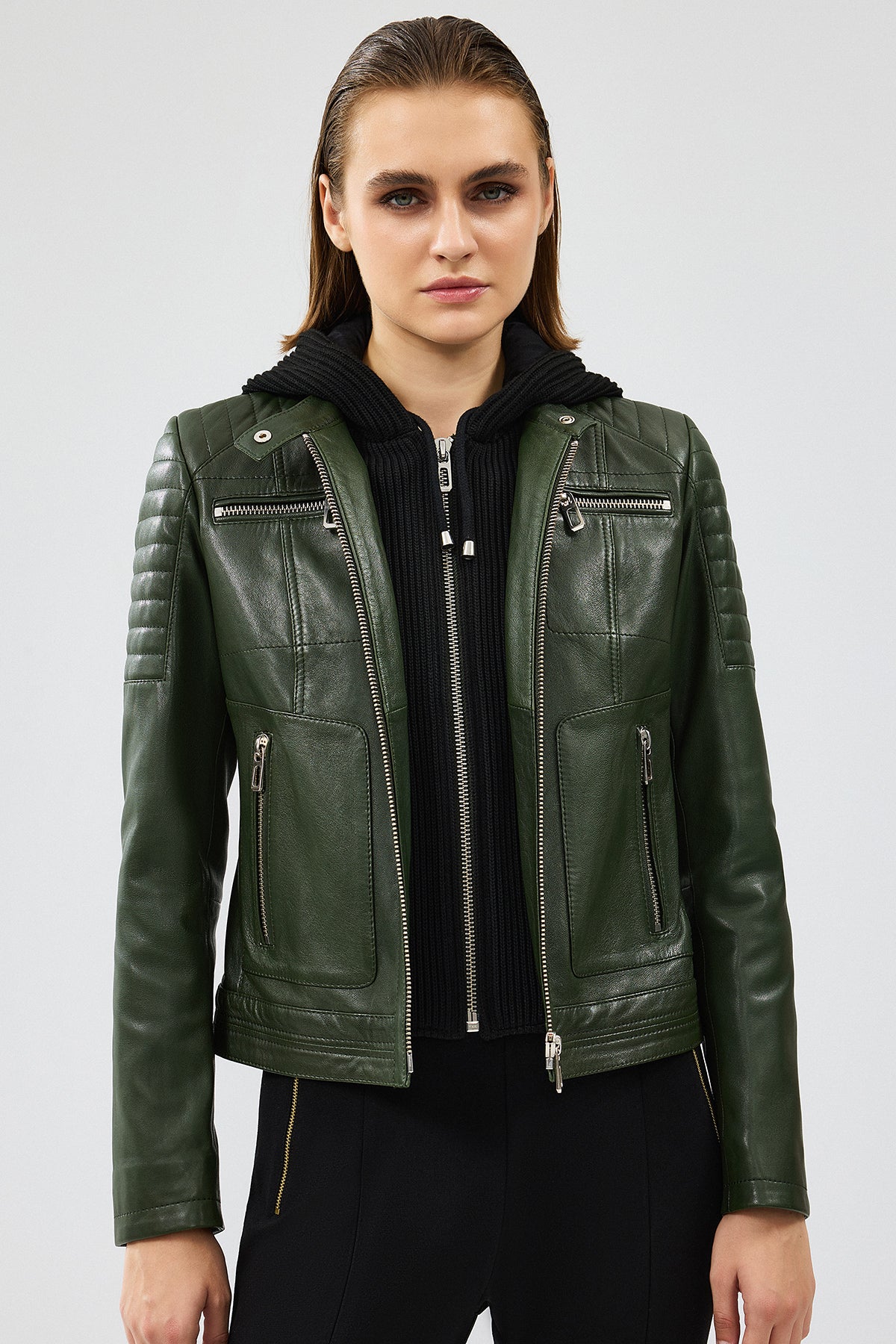 Zoom Kadın Haki Kapüşonlu Kısa Deri Ceket