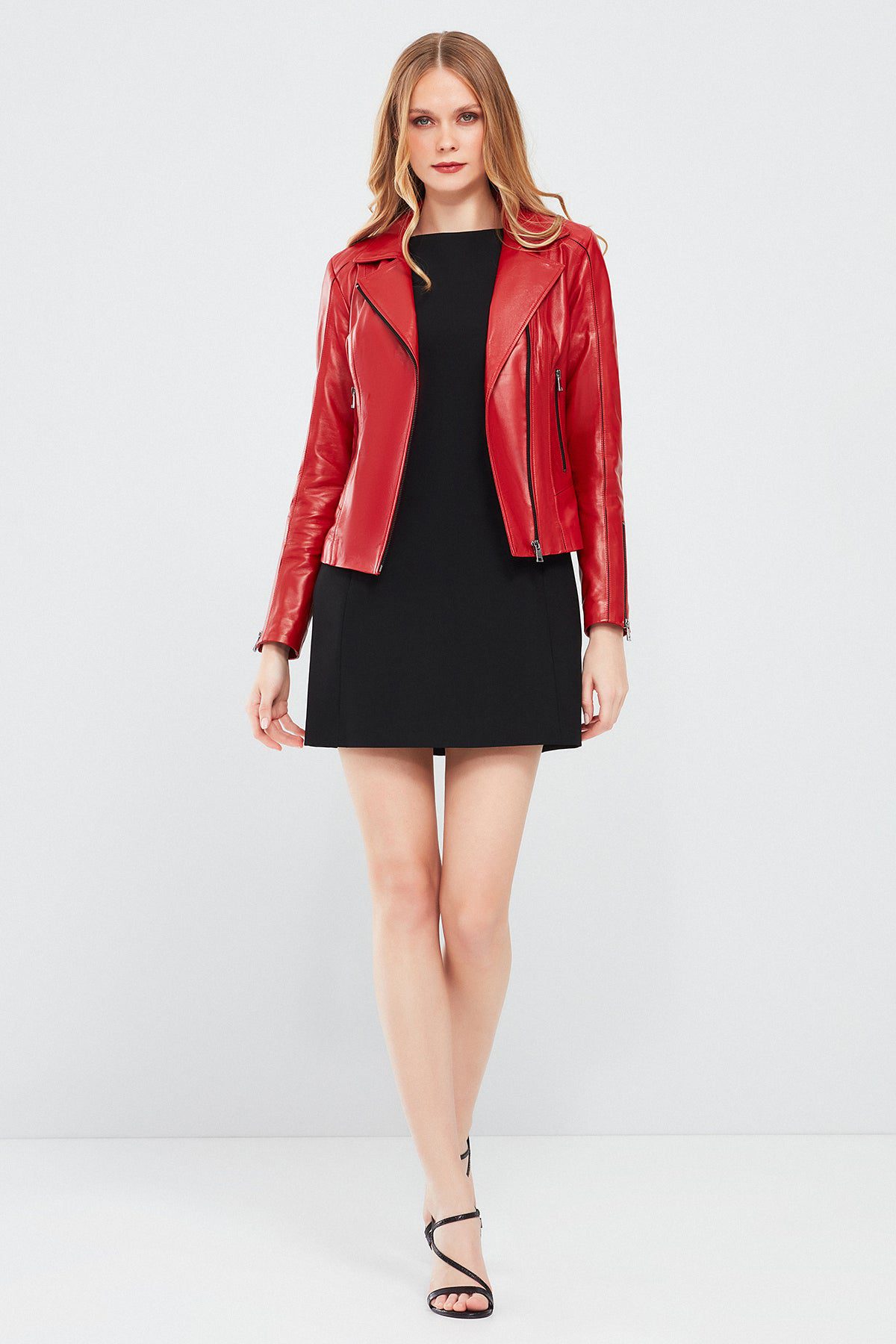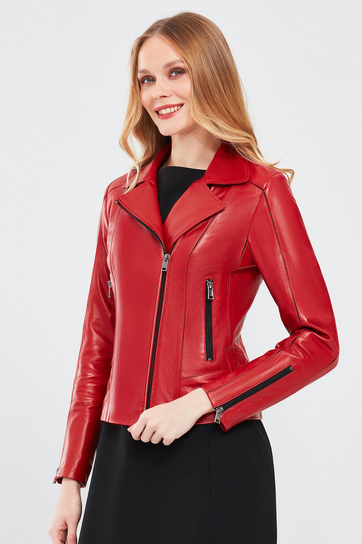 Kiara Kadın Kırmızı Slim-Fit Biker Deri Ceket