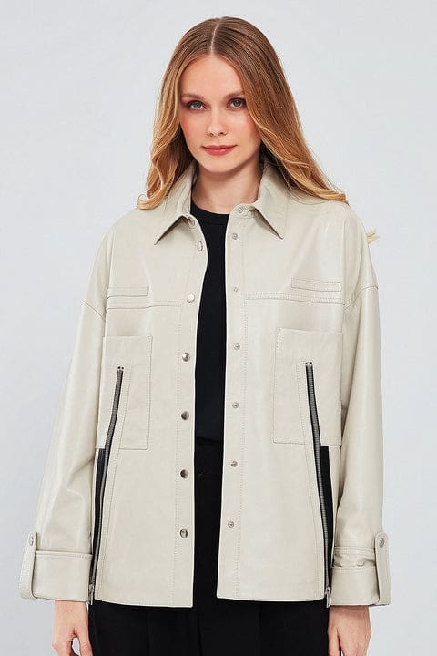 کت چرم سایز بزرگ بژ زنانه فراه دری مد