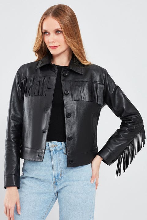 Luna Kadın Siyah Püskül Detaylı Deri Ceket