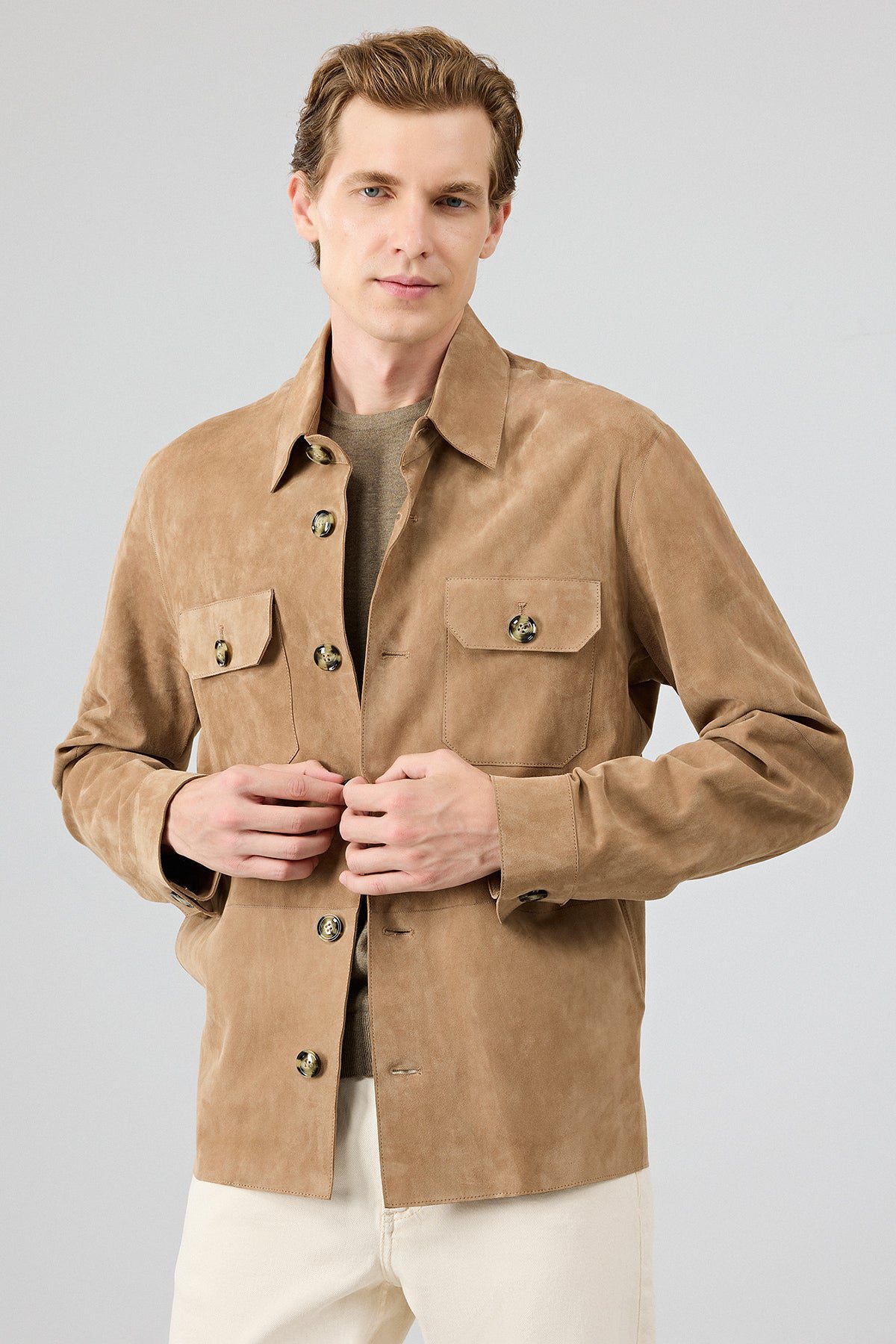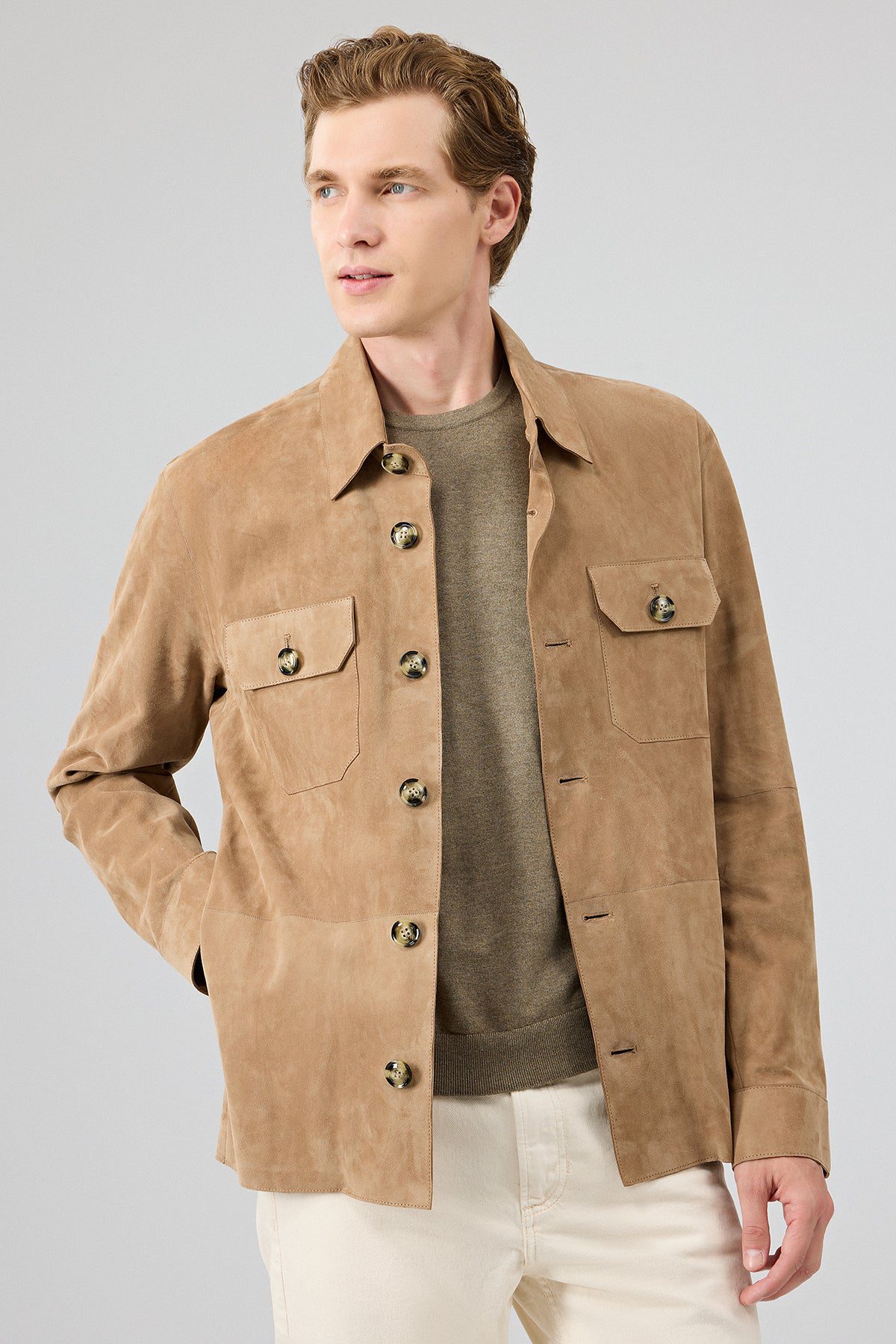 Osimhen Erkek Bej Gömlek Yaka Süet Deri Mont