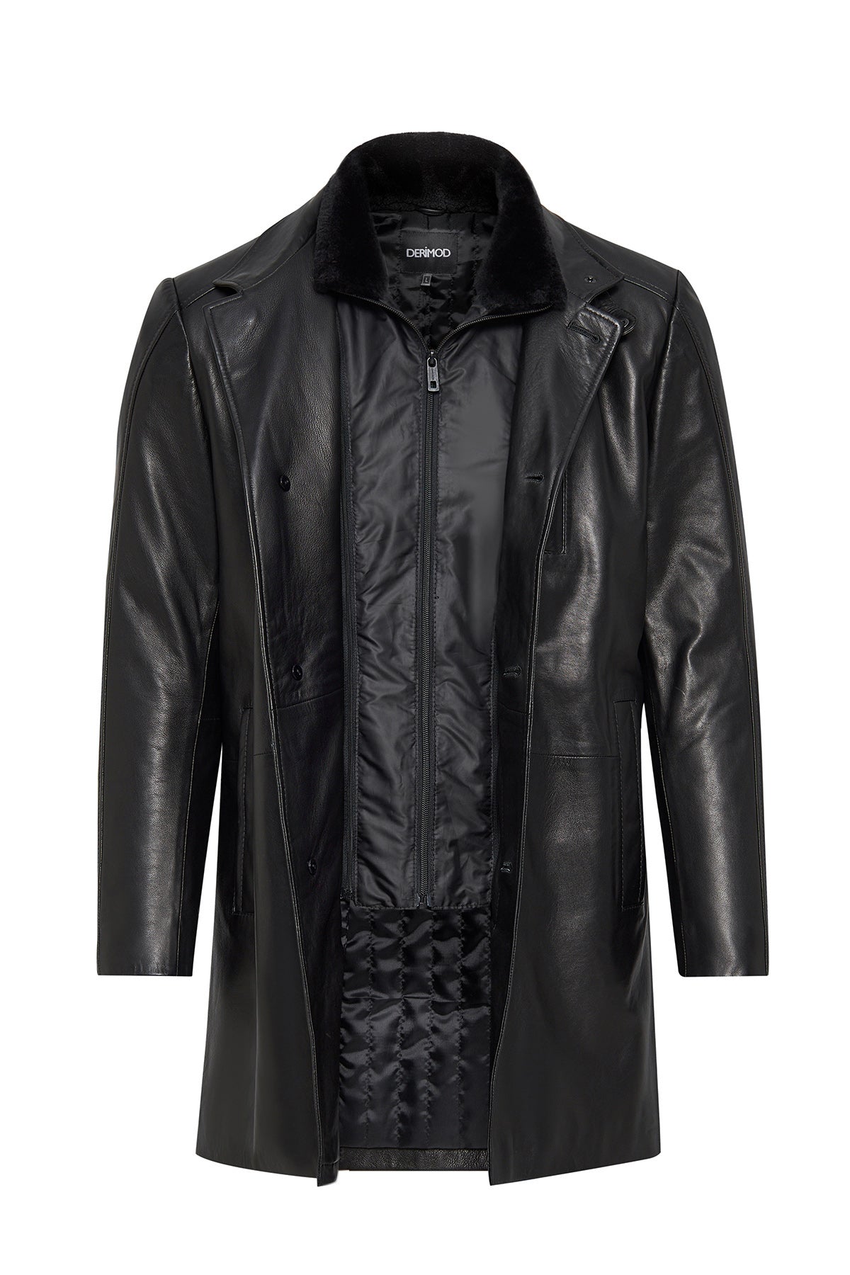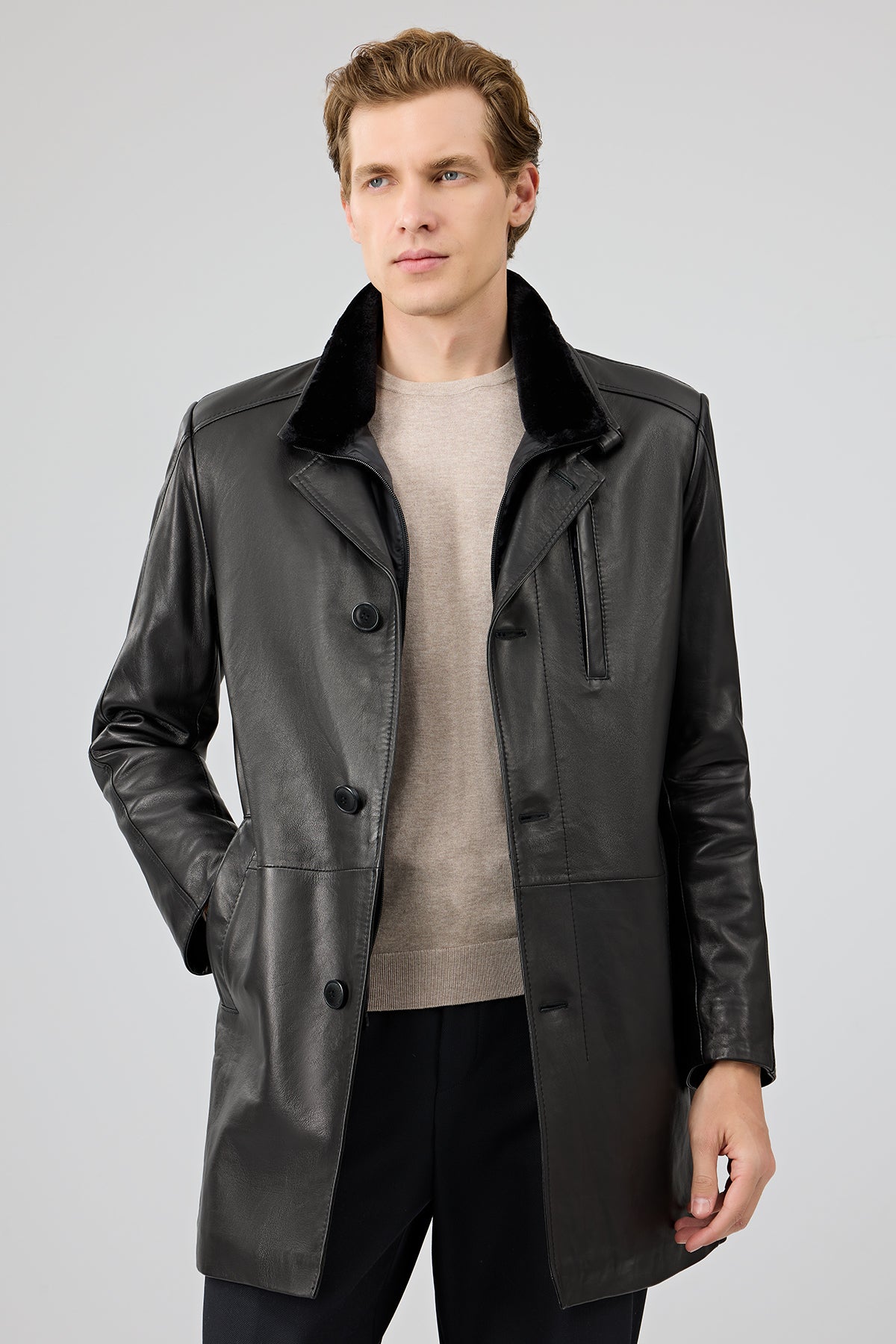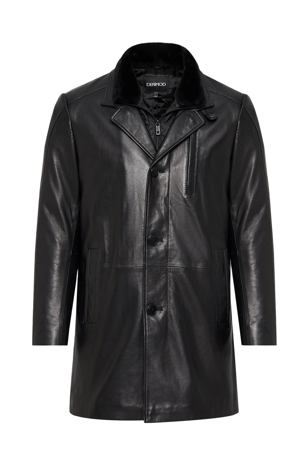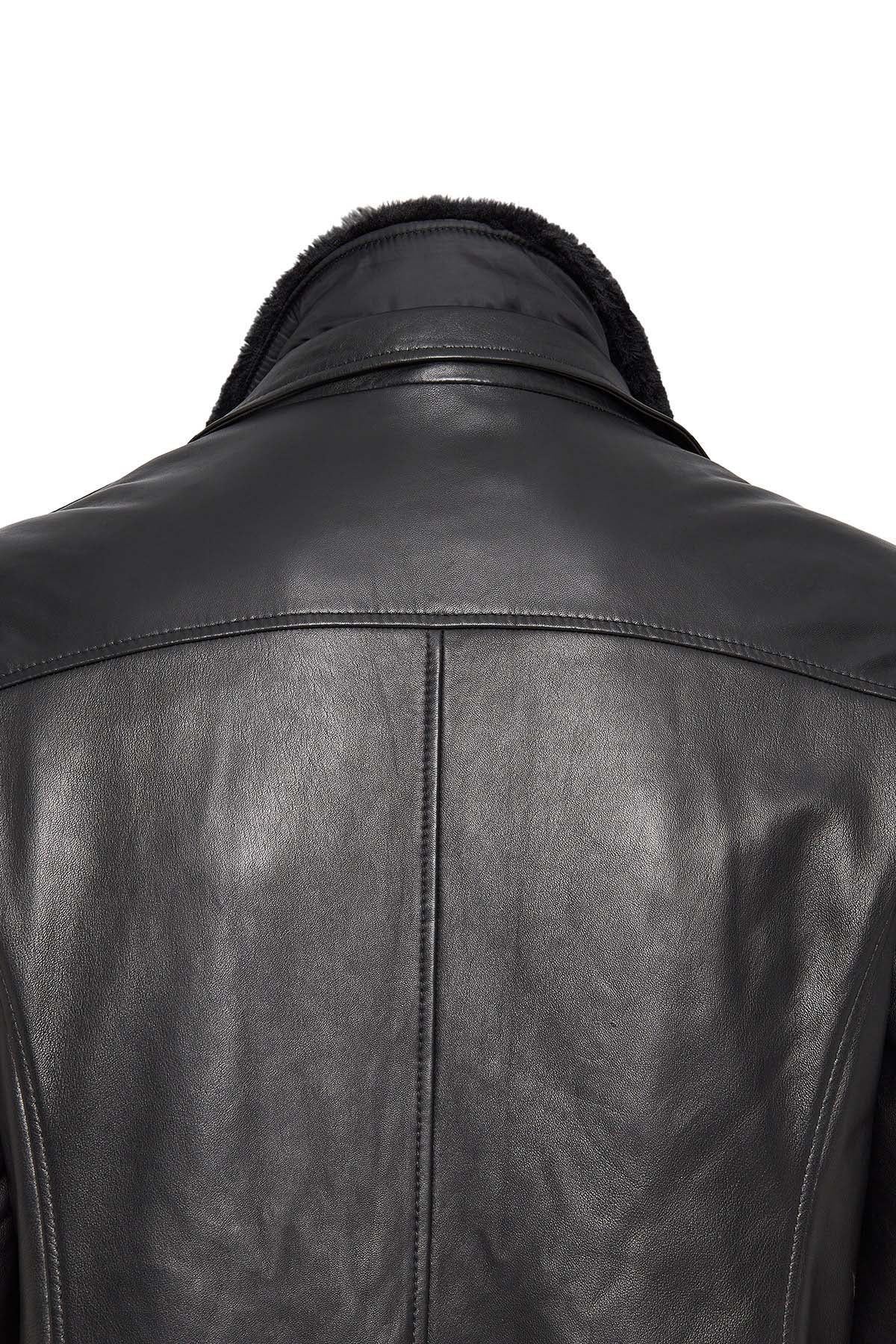 Barella Erkek Siyah Yaka Kürklü Deri Trençkot