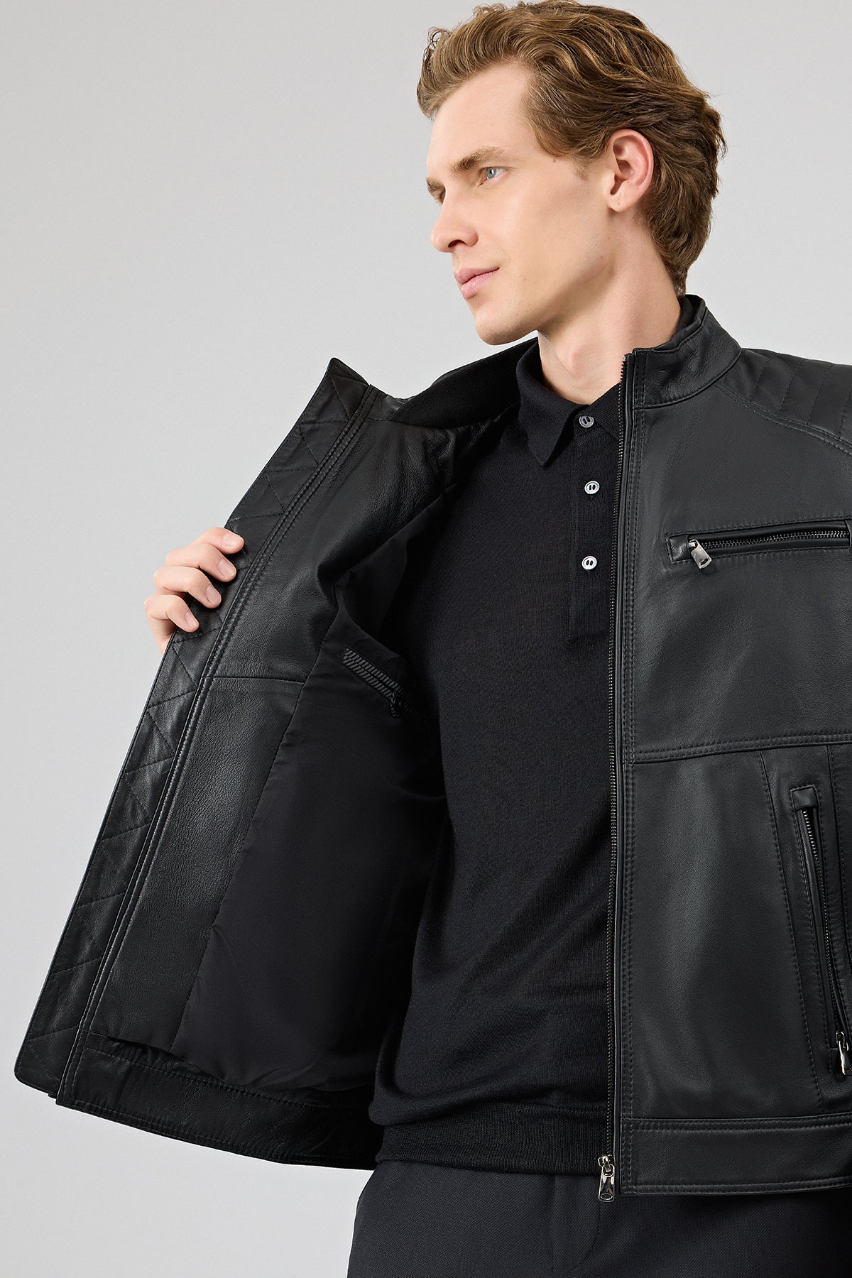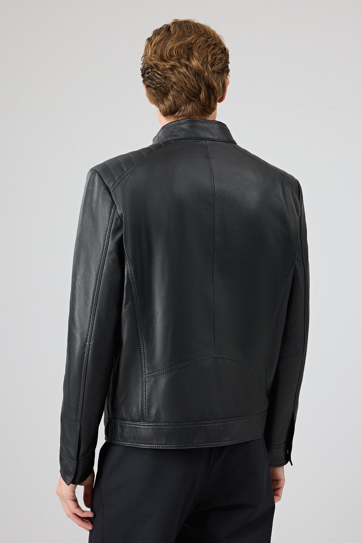 Tony Erkek Siyah Hakim Yaka Kısa Deri Mont