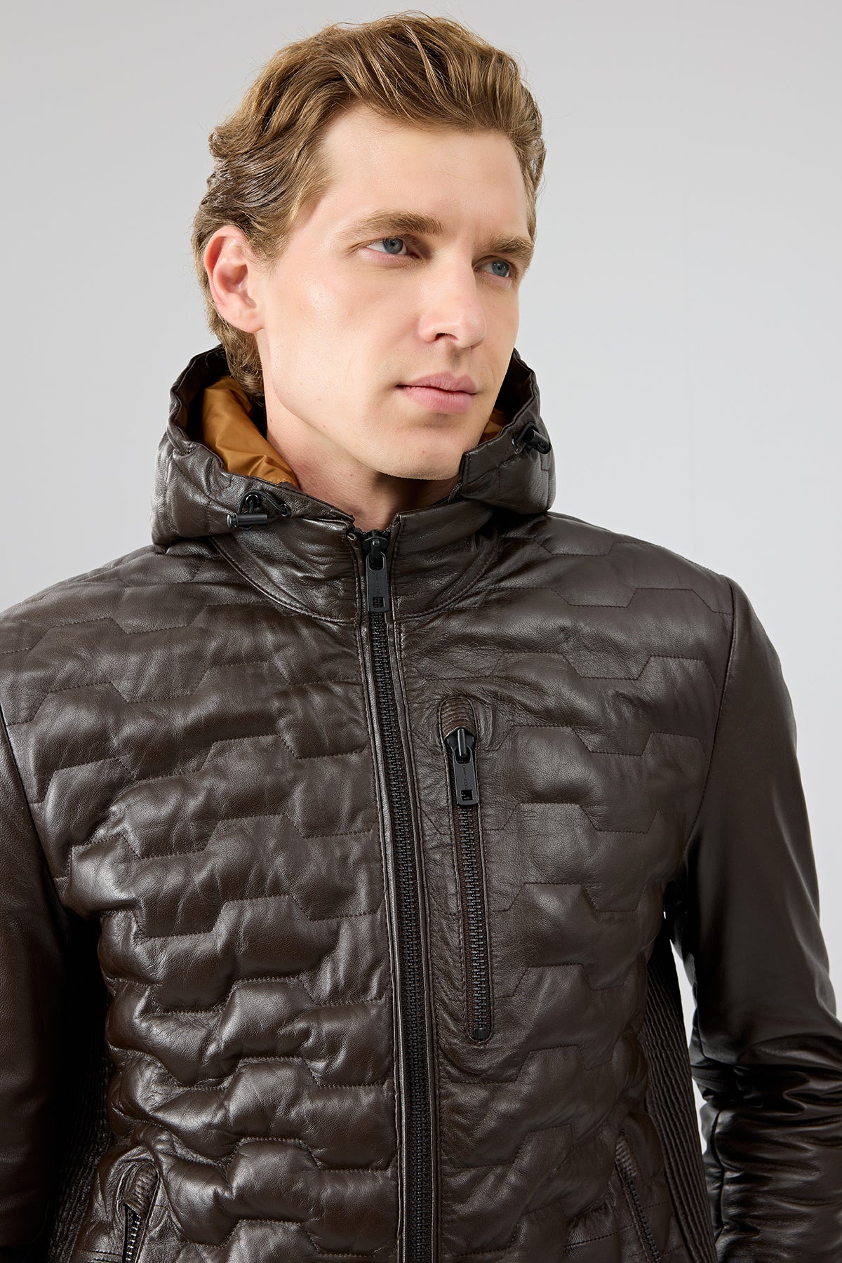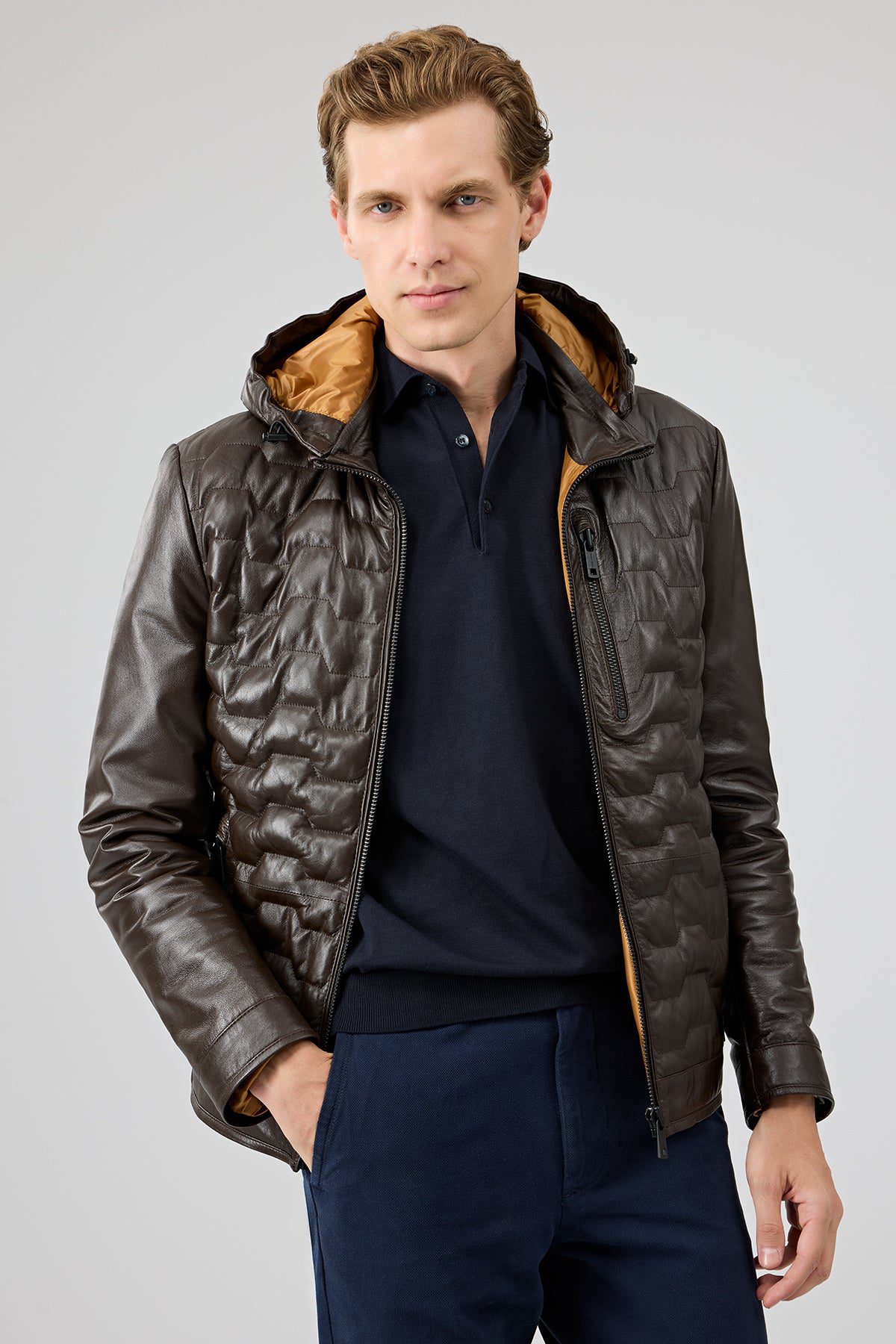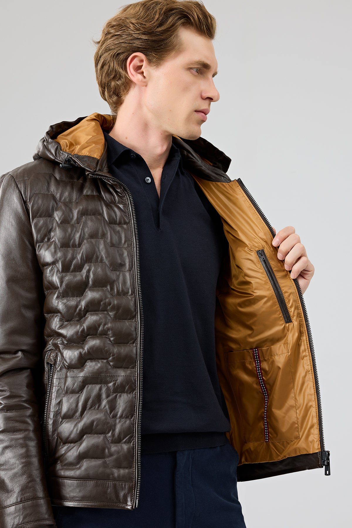 کاپشن چرمی مردانه قهوهای کلاهدار Silva دری مد