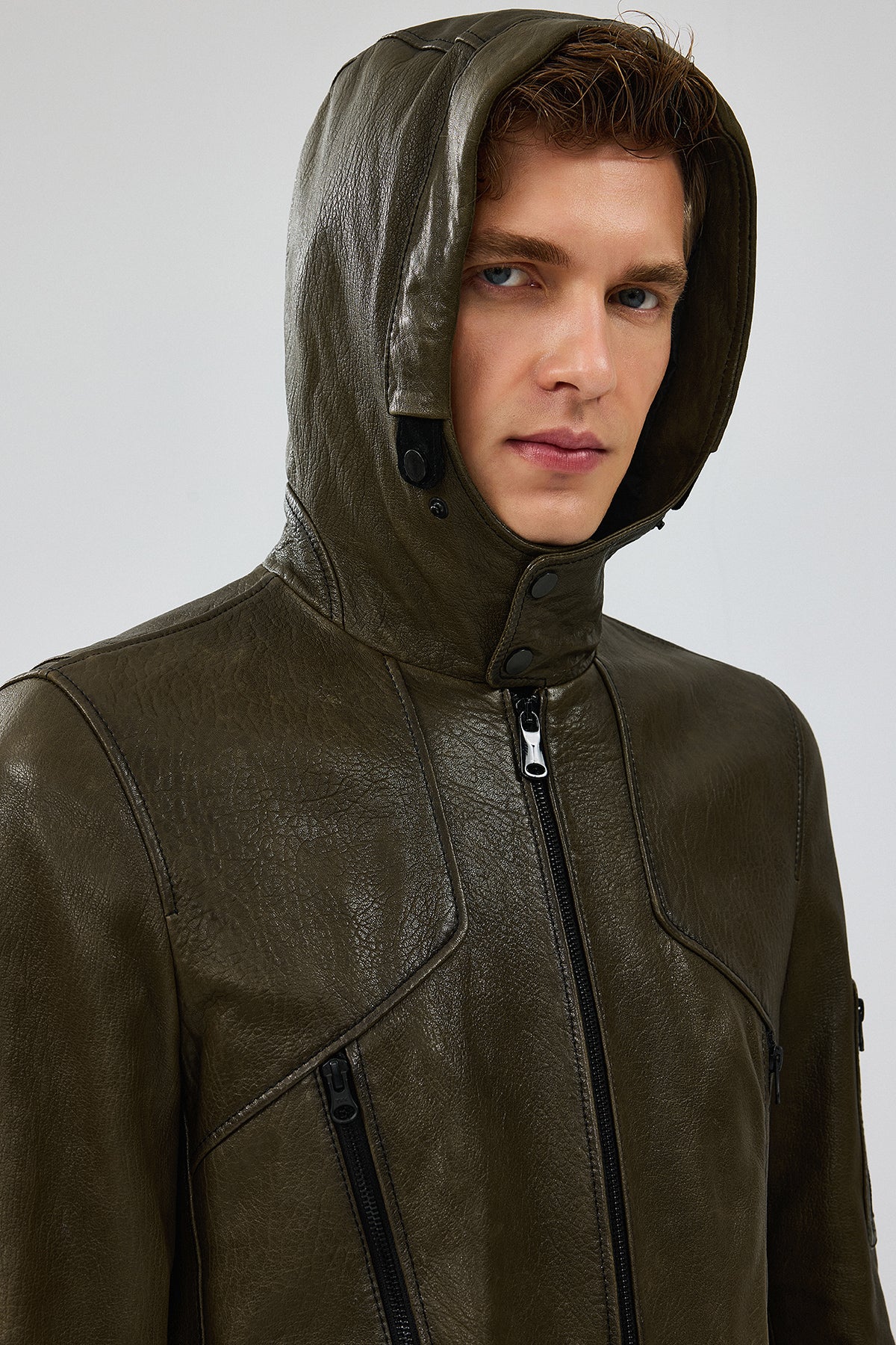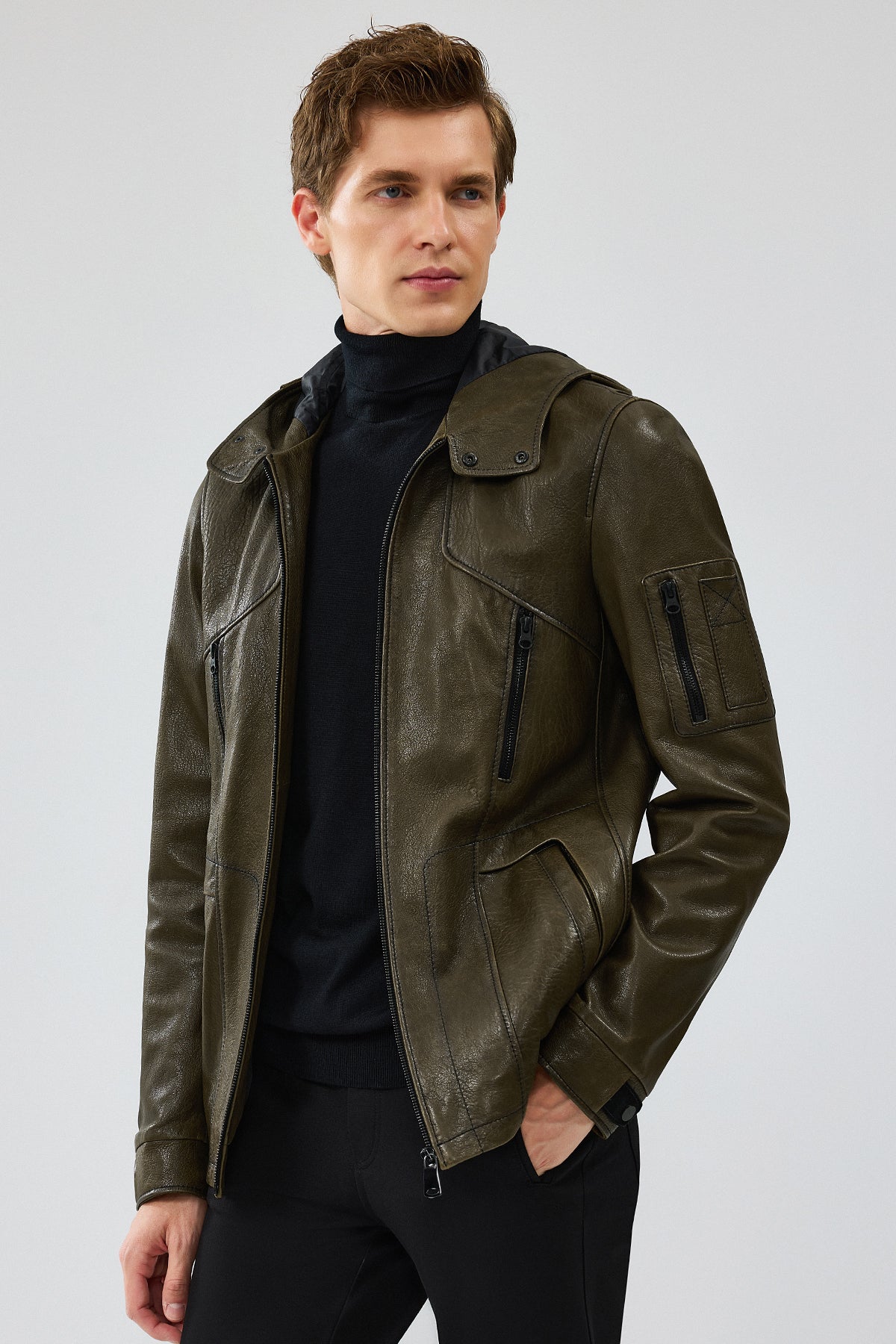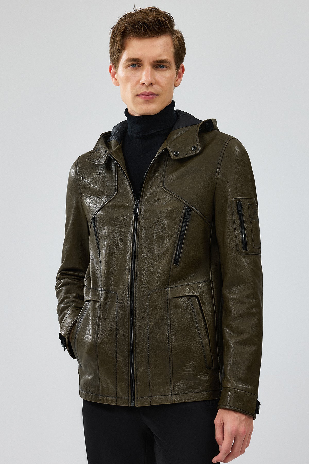 John Erkek Yeşil Kapüşonlu Deri Mont