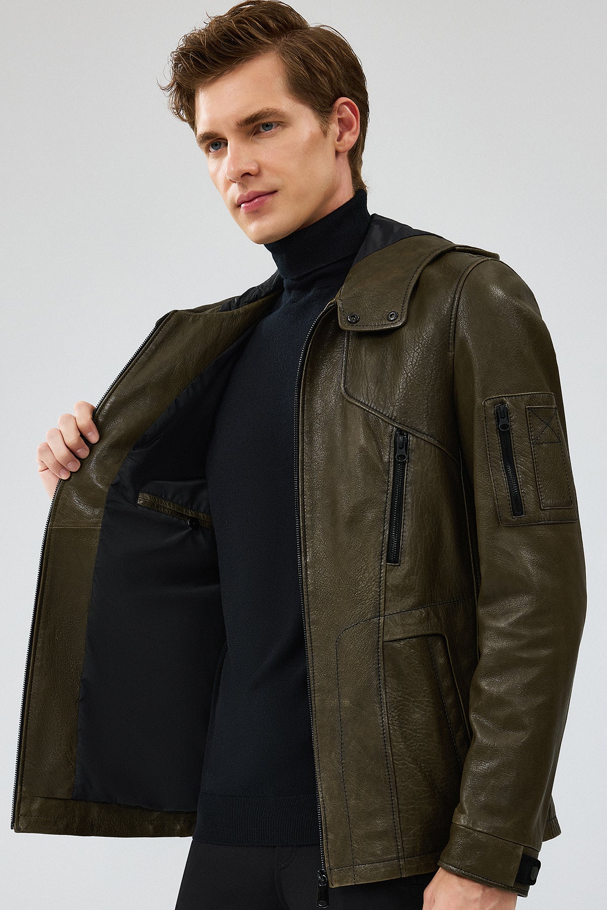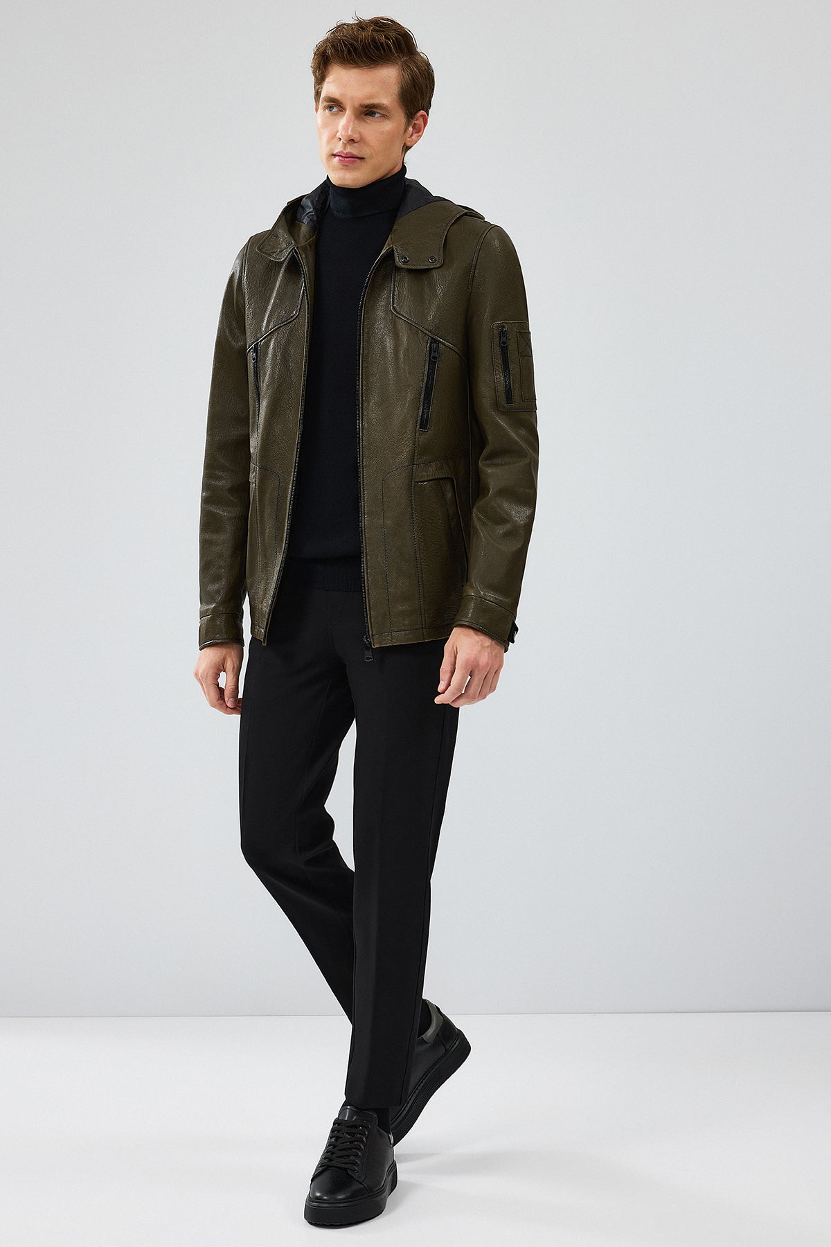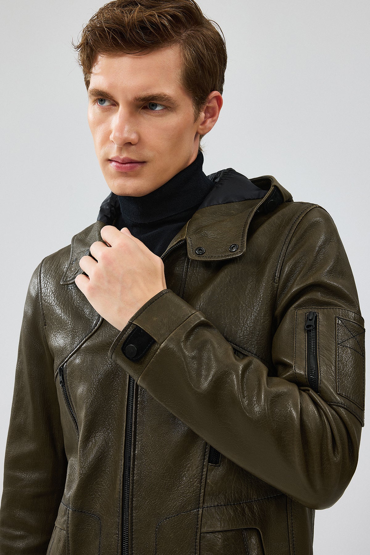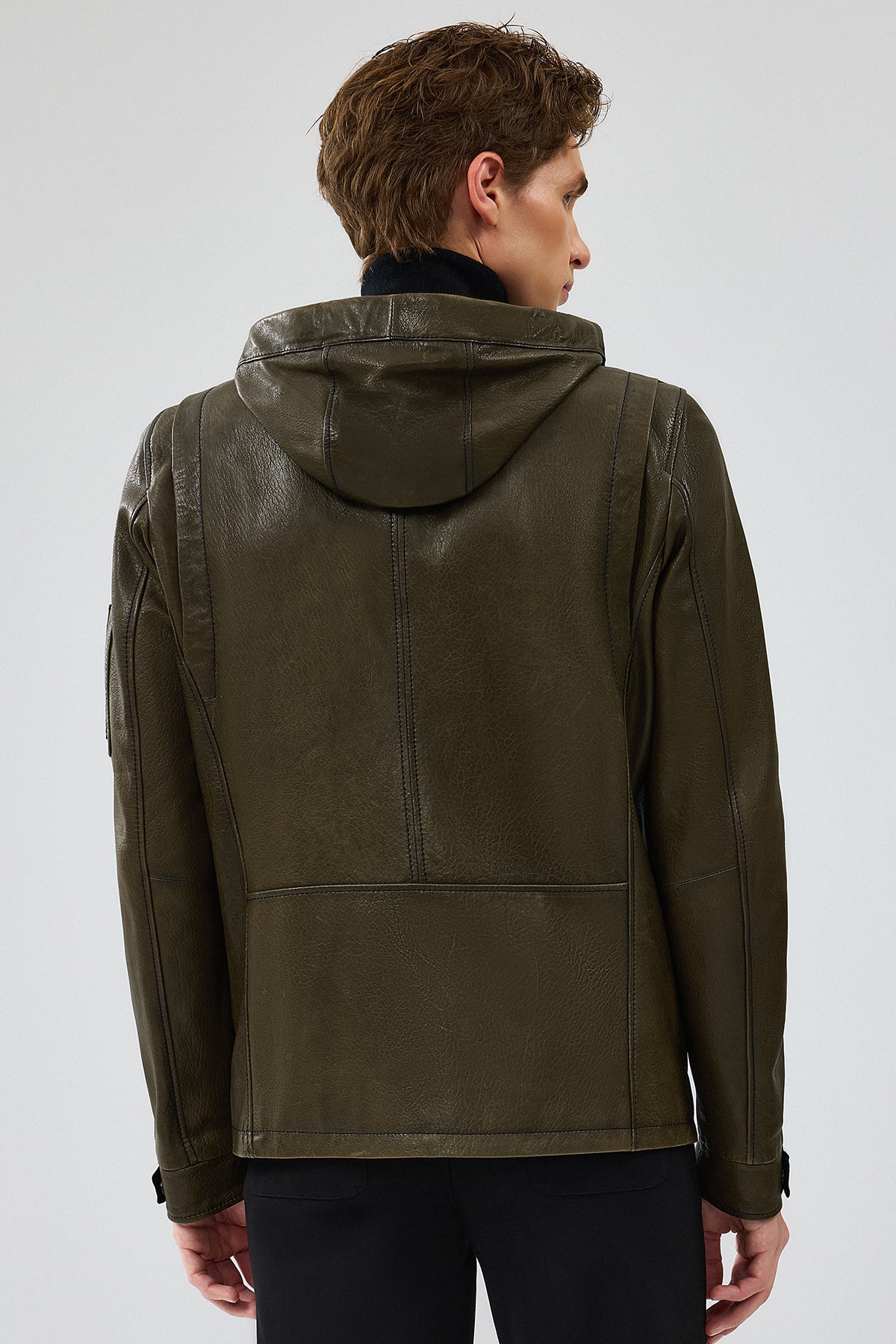 John Erkek Yeşil Kapüşonlu Deri Mont