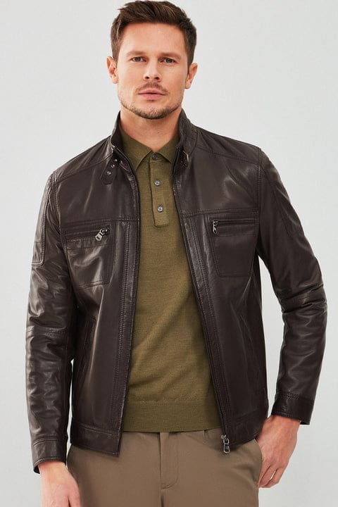 Wade Erkek Kahverengi Slim-Fit Deri Mont
