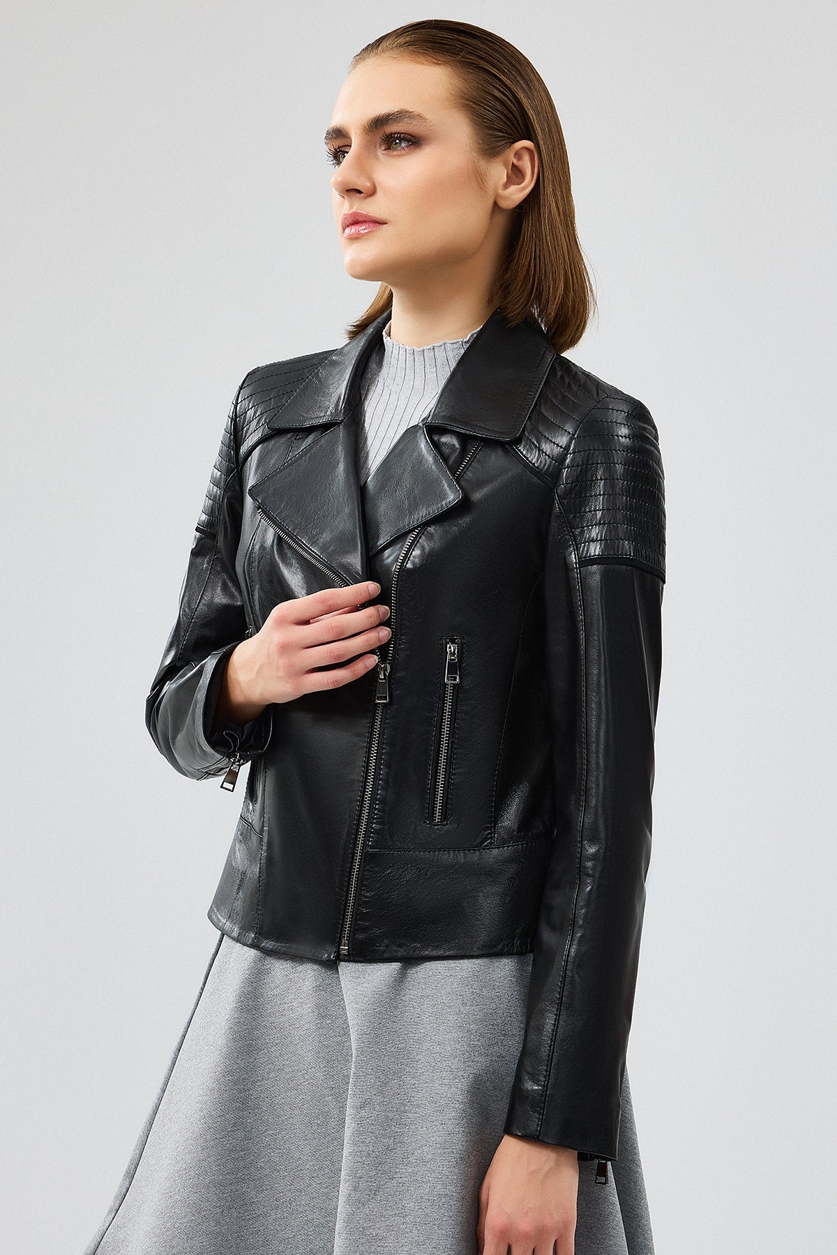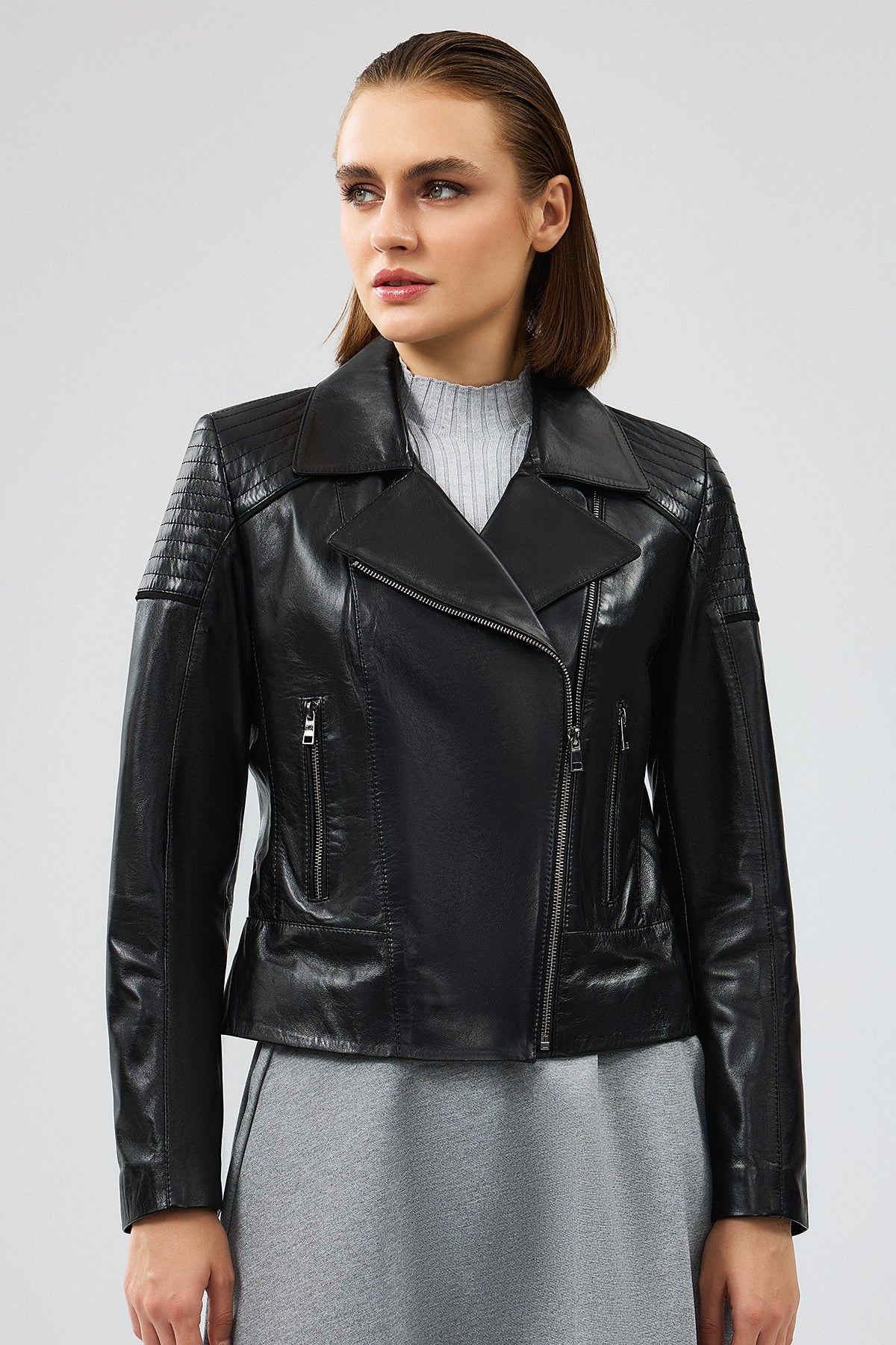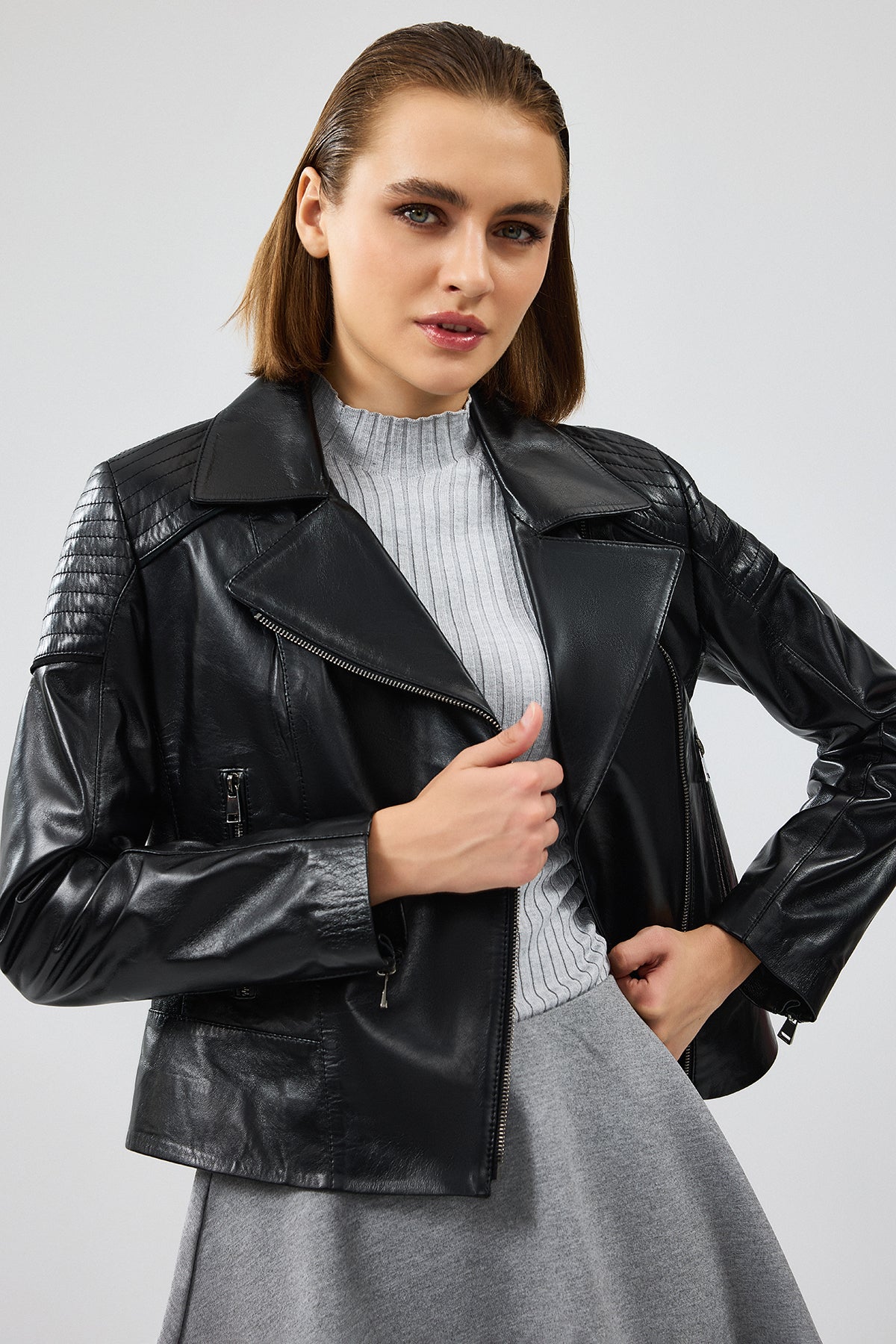 Monaco Kadın Siyah Biker Deri Ceket