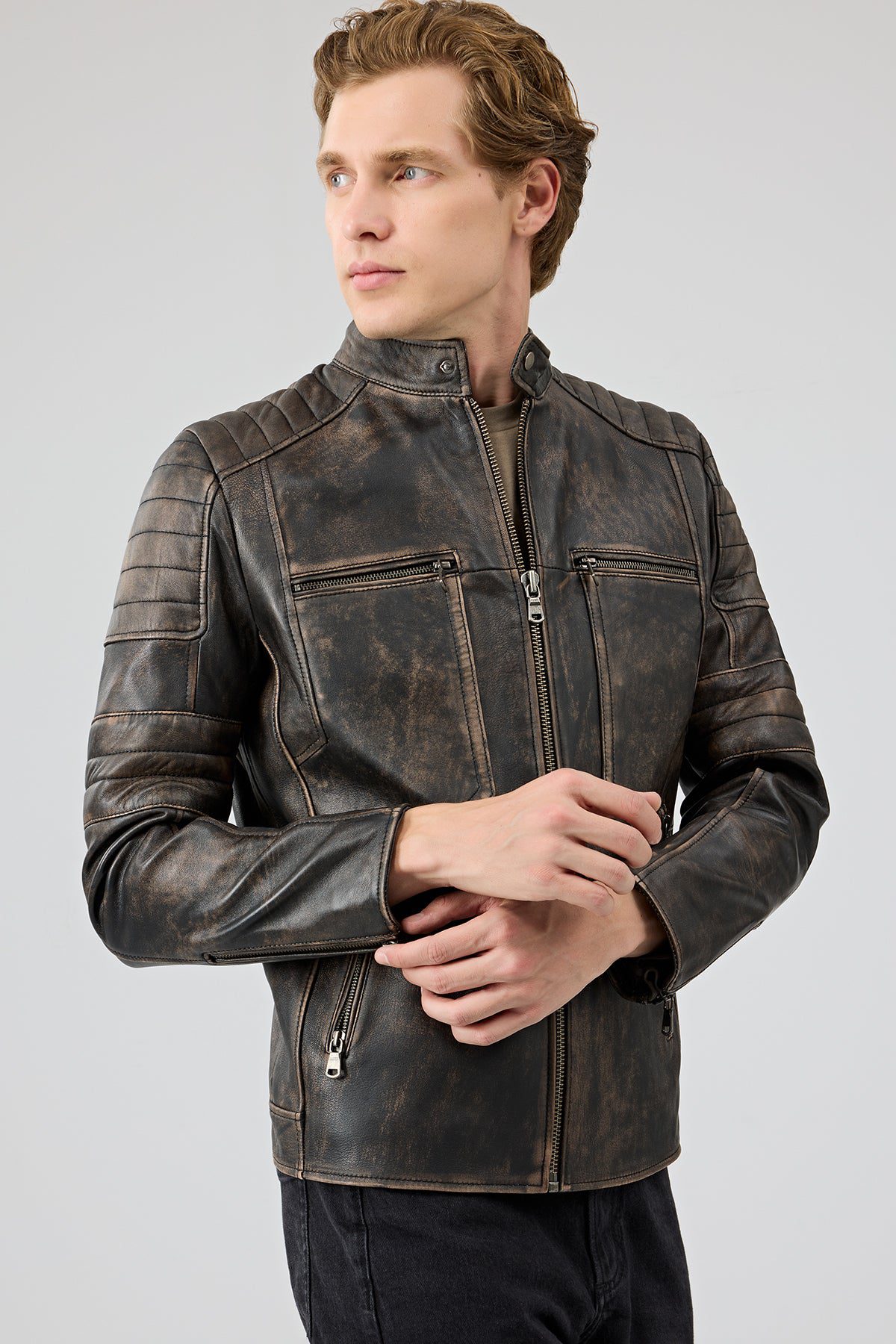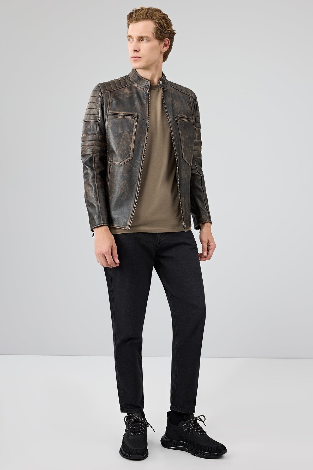 Morant Erkek Kahverengi Vintage Slim-Fit Deri Ceket