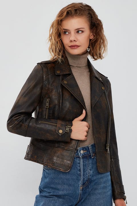 Newyork Kadın Kahverengi Vintage Biker Deri Ceket