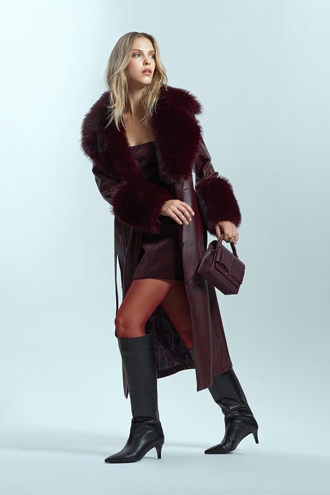 Penelope Kadın Bordo Kürklü Deri Pardösü