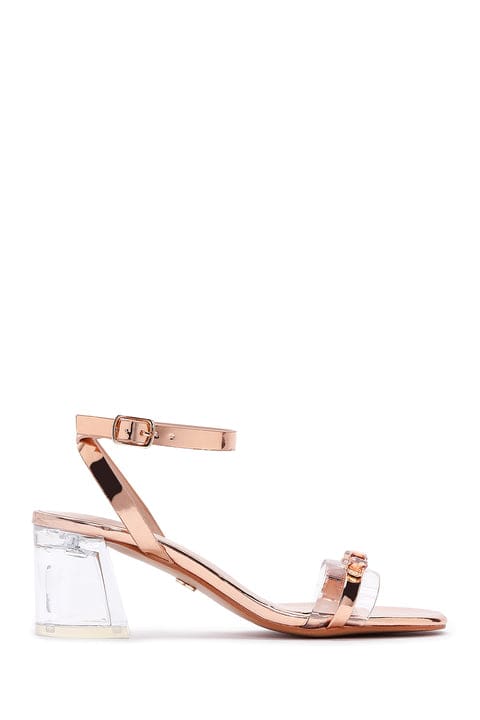 Kadın Pembe Altın Vinil Taşlı Kalın Topuklu Sandalet