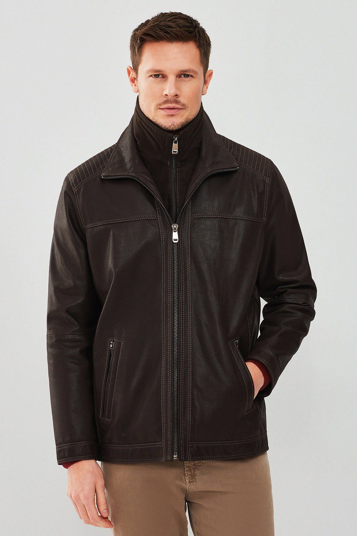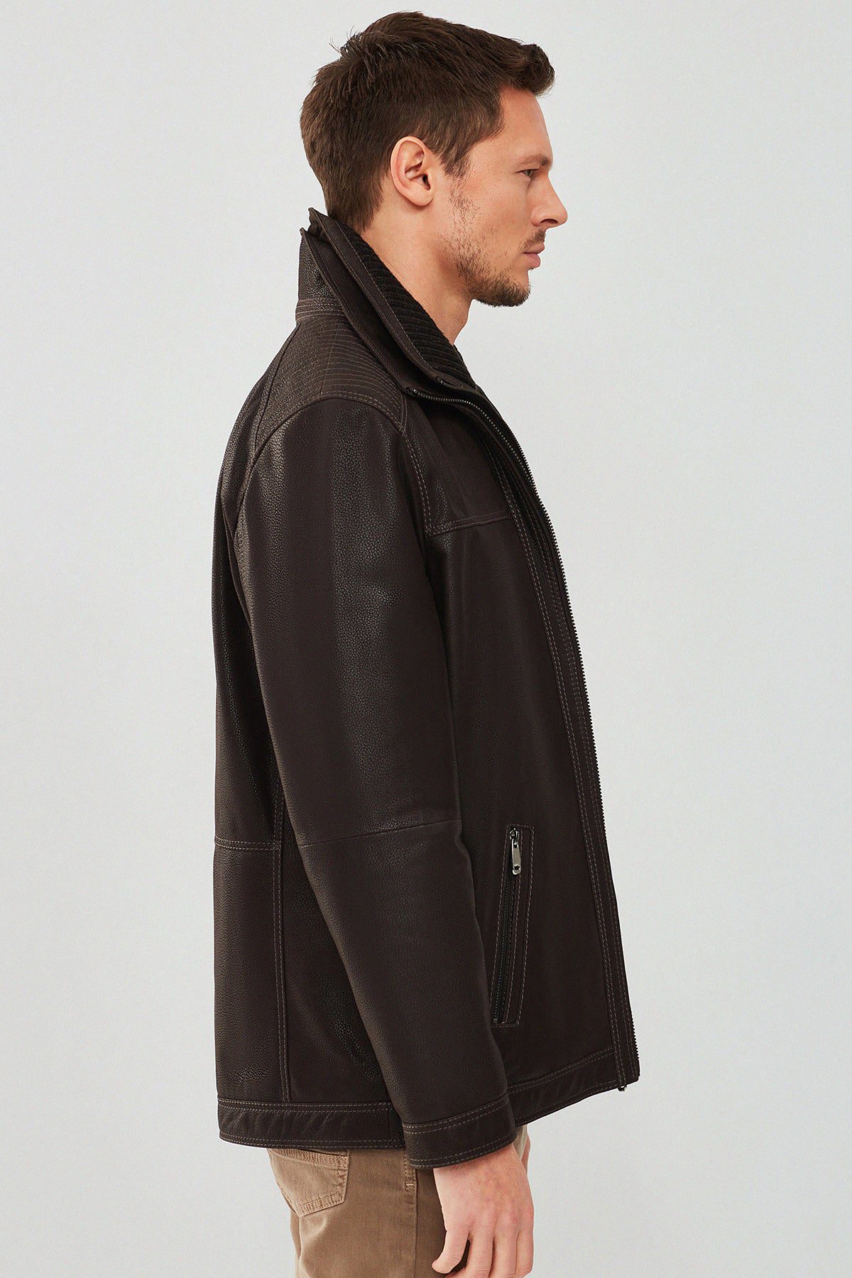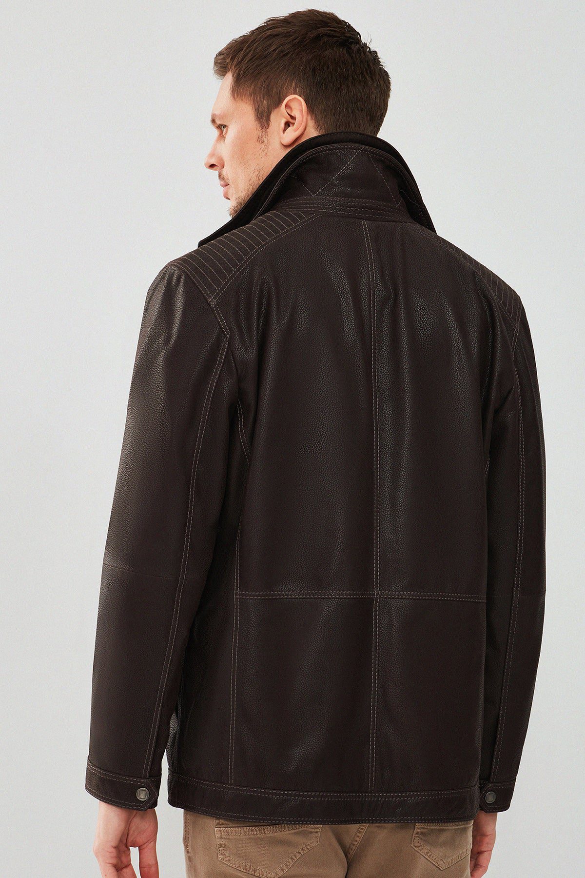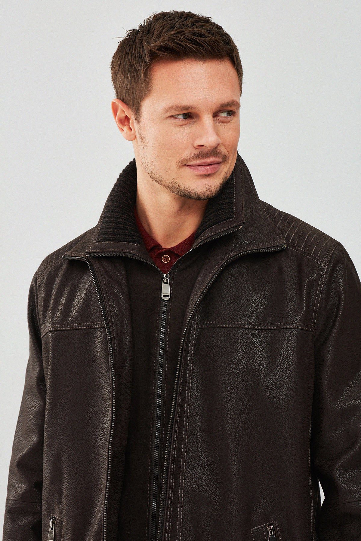 کاپشن چرم یقه دو یقه قهوه ای مردانه روبرتو دری مد