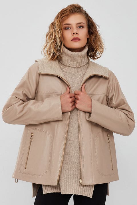 Roma Kadın Bej Kapüşonlu Çift Taraflı Oversize Deri Ceket