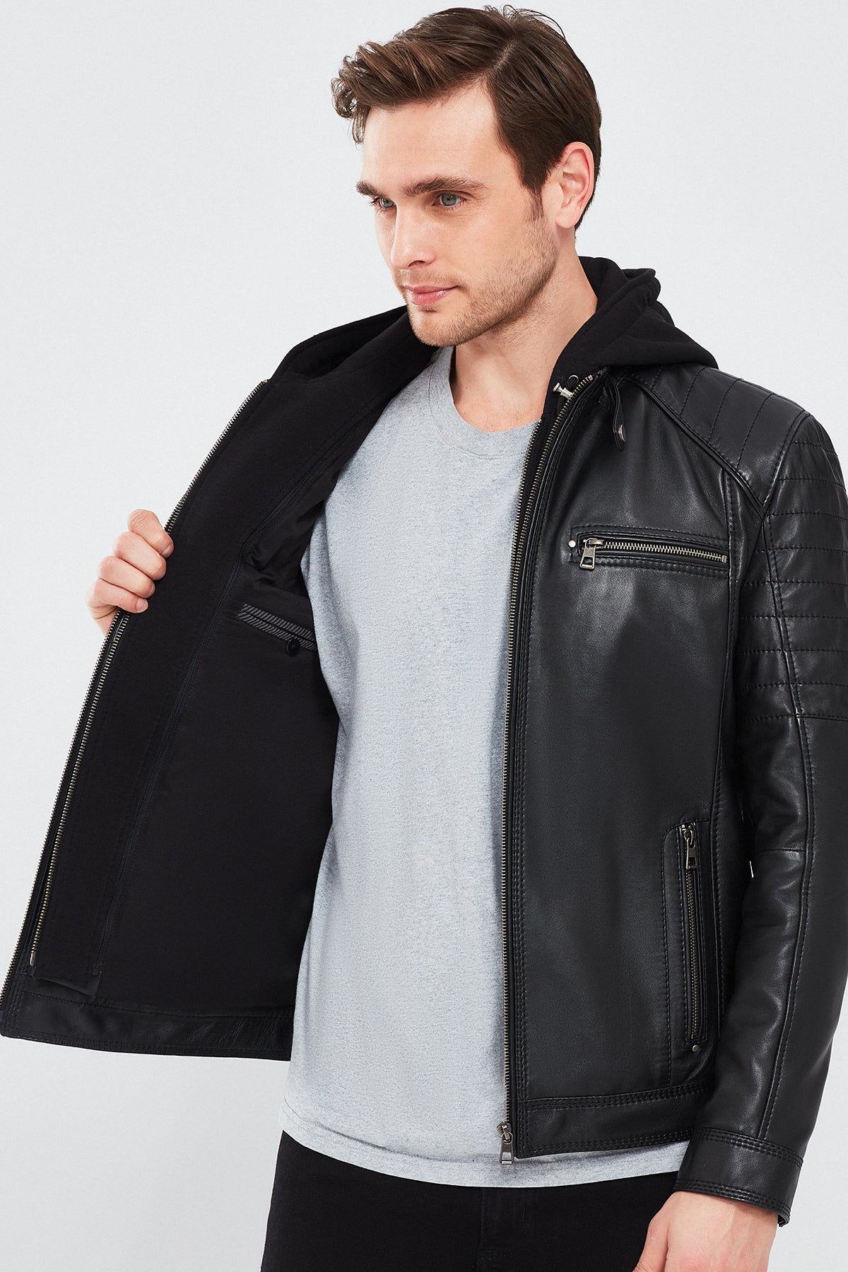 Sergio Erkek Siyah Kapüşonlu Spor Deri Mont