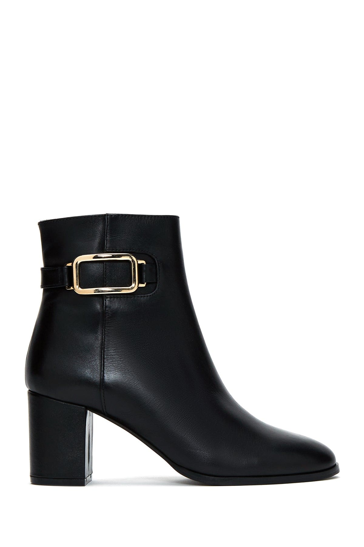 Kadın Siyah Fermuarlı Toka Detaylı Kalın Topuklu Deri Bot