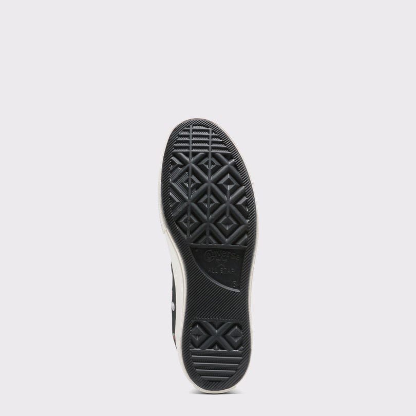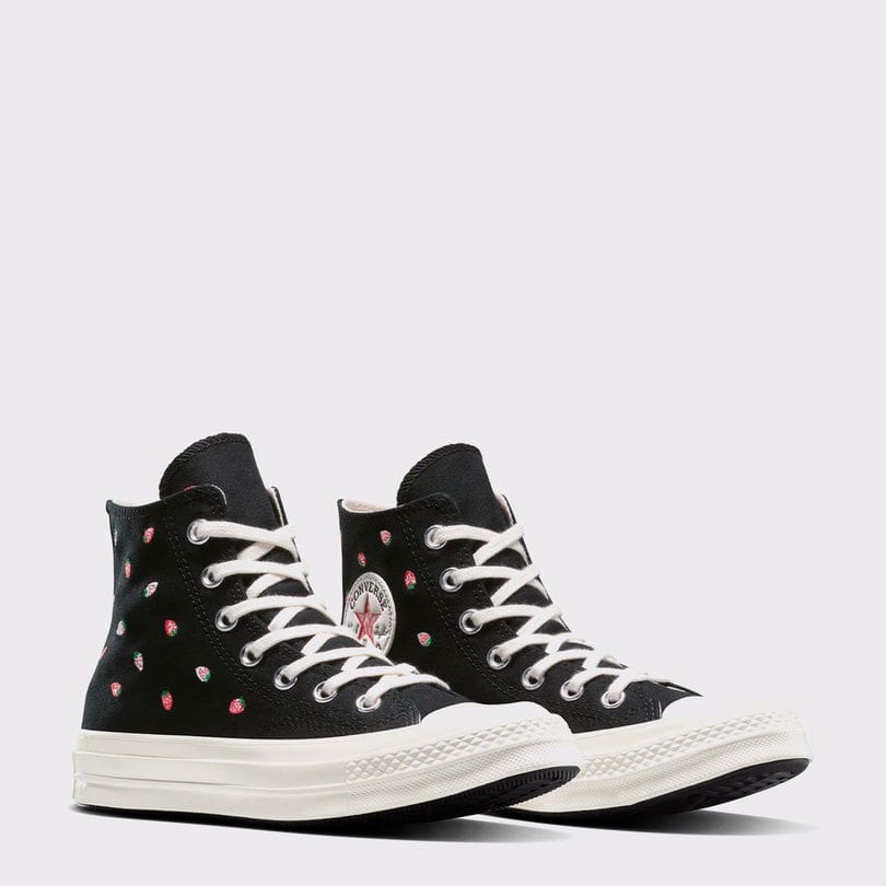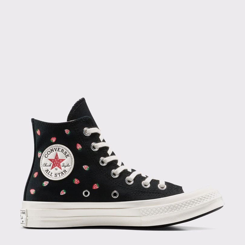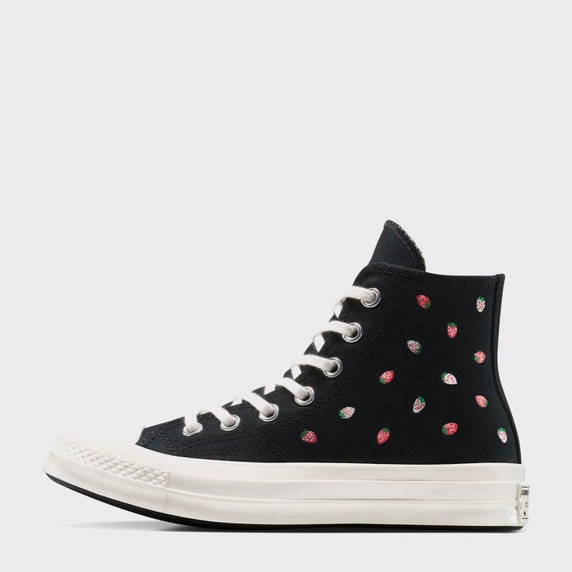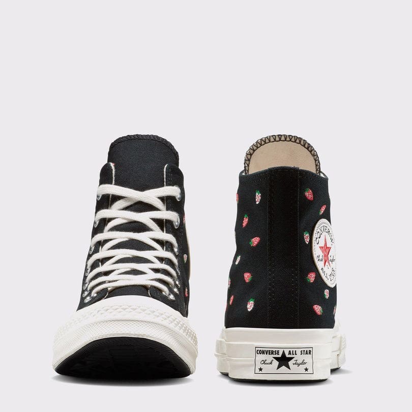 با الگوهای توت فرنگی کوچک روی سطح فوقانی بوم سیاه آن ، چاک ۷۰ نشان دهنده راحتی و سبک کلاسیک مکالمه است. یک کفش مناسب برای استفاده روزانه با کف لاستیکی سفید ، ساختار مچ پا بالا و جزئیات نمادین.