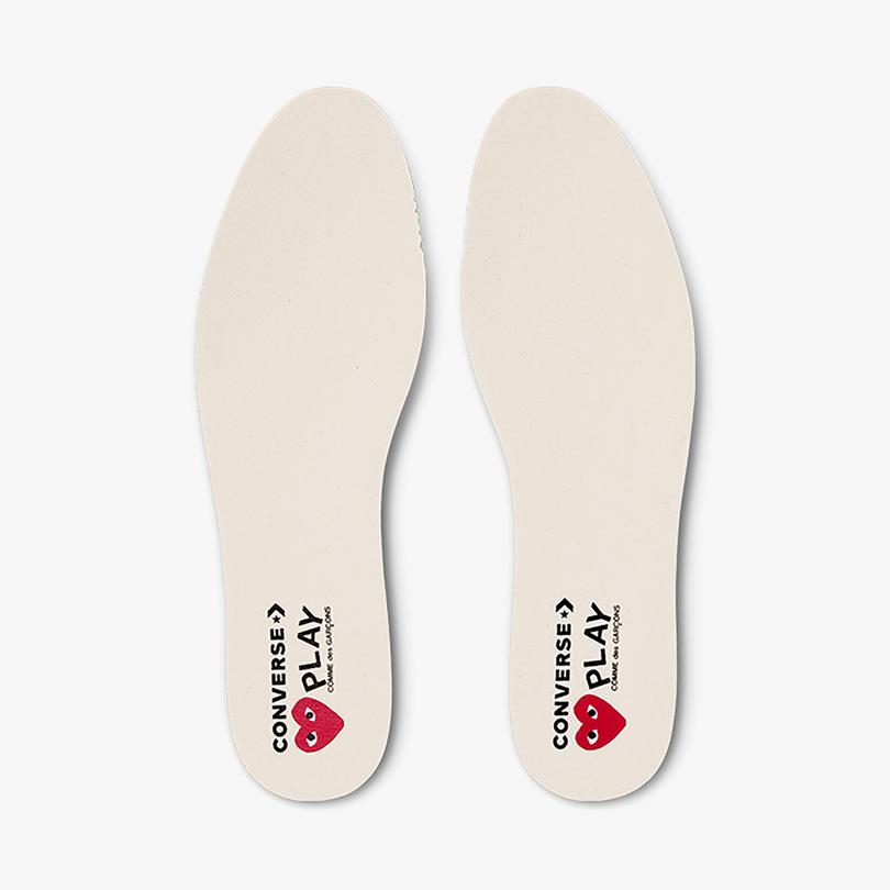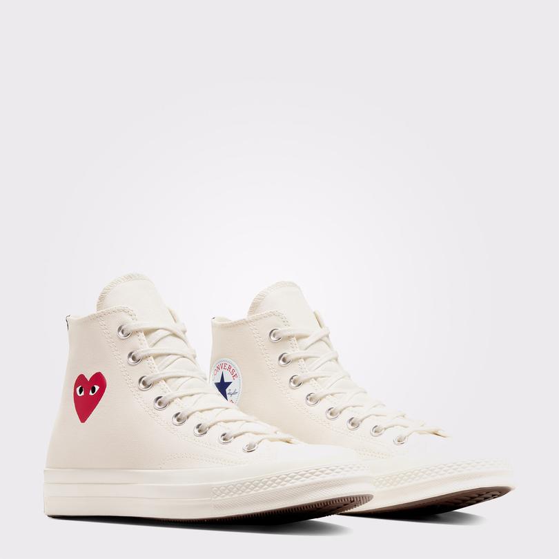 مشارکت نمادین بین Converse و Comme des Garçons بیش از یک دهه است که با استفاده از آرم قلب و چشم به روشهای مختلف، چشمانداز مفهومی این برند را به خیابانهای سراسر جهان آورده است. Comme des Garçons، مورد علاقه طرفداران، لوگوی قلب و چشمان خود را با طراحی مینیمالیستی به Chuck 70 باز می گرداند.
