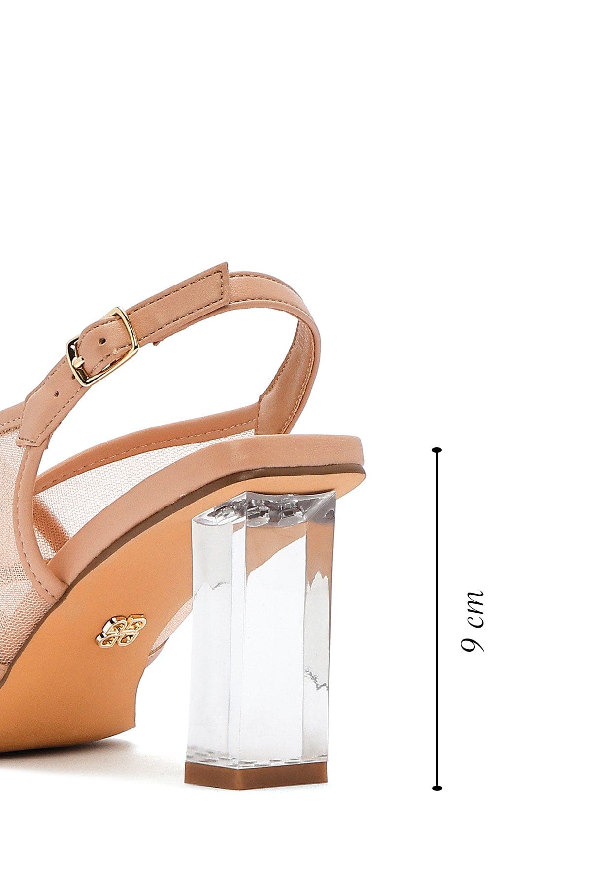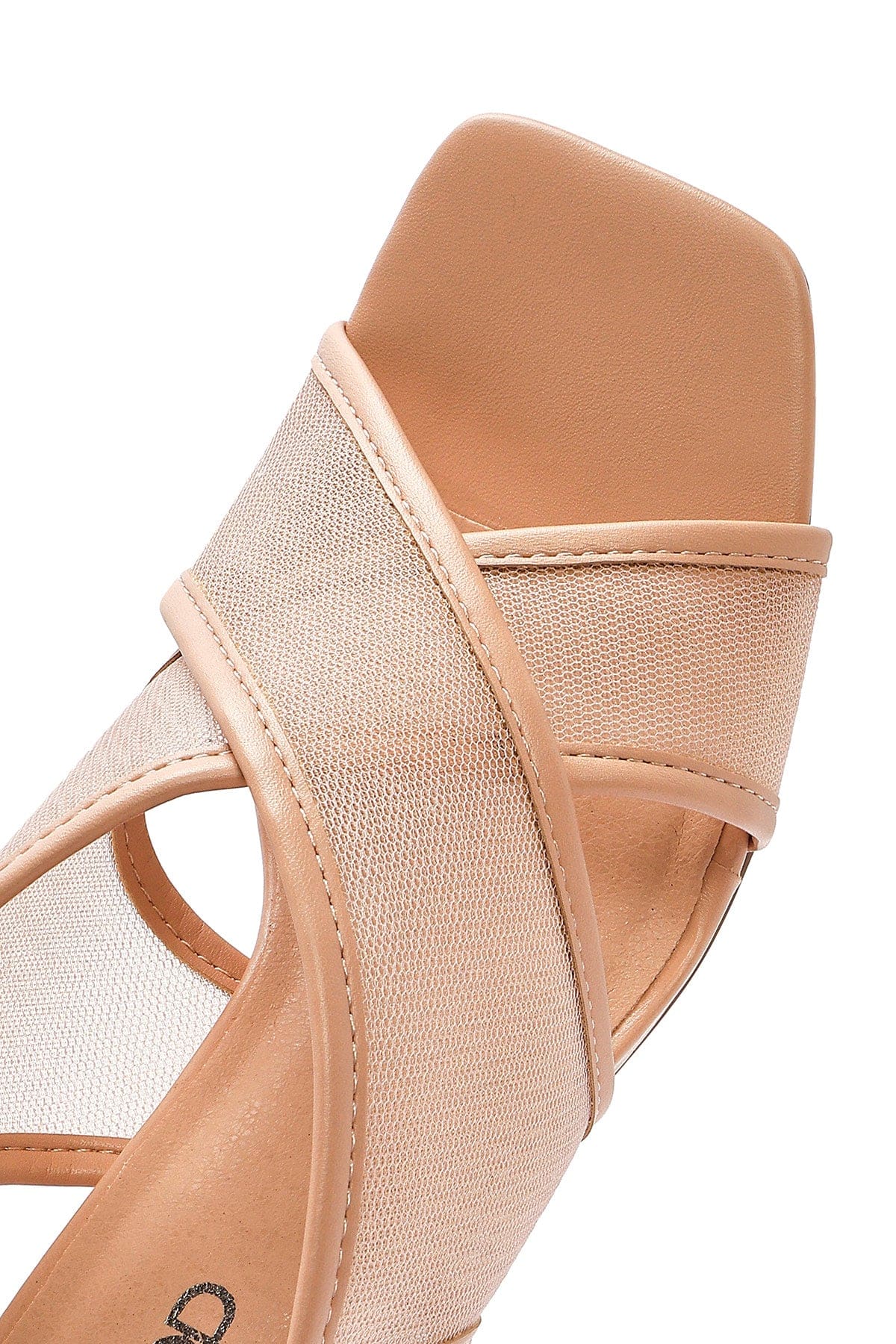 Kadın Bej Bilekten Tokalı Kalın Topuklu Kumaş Sandalet