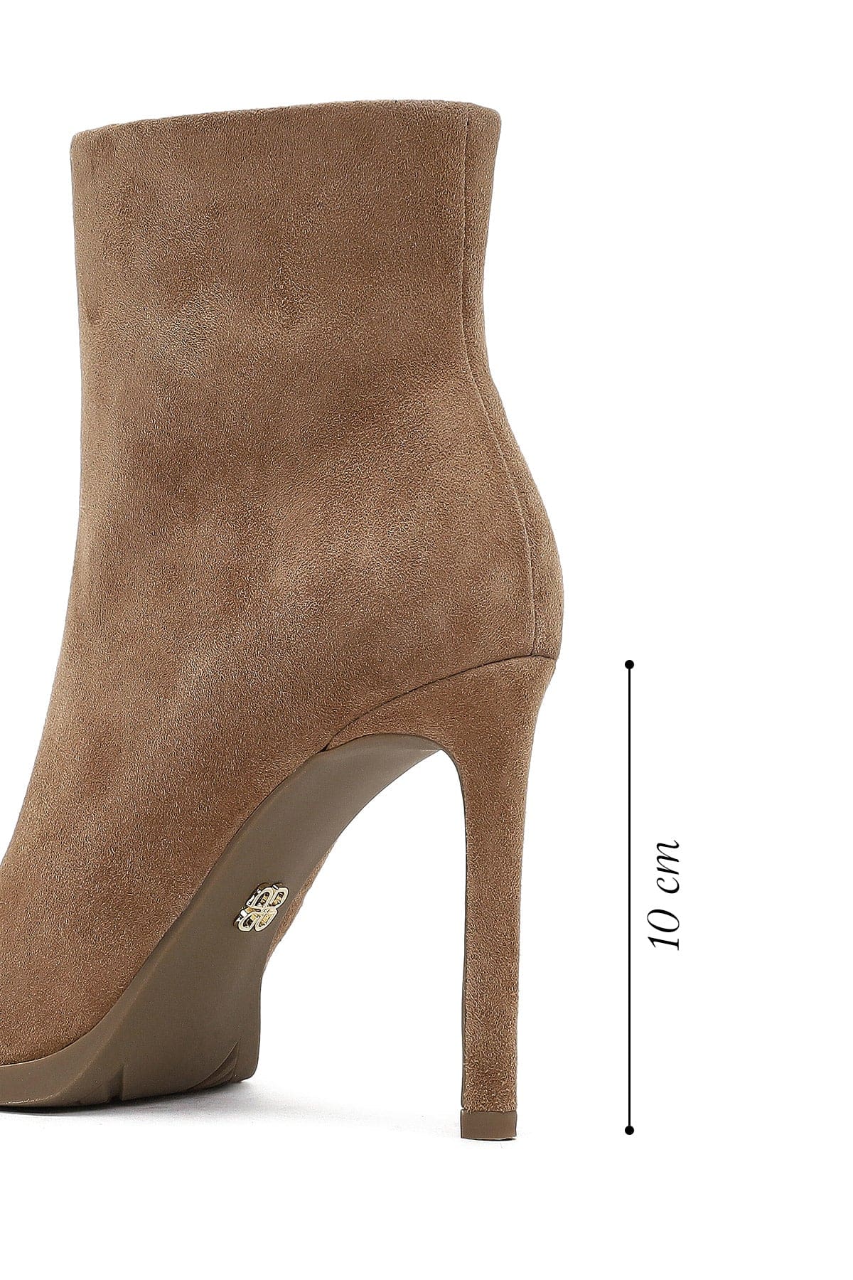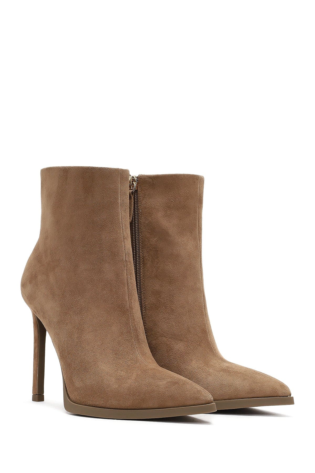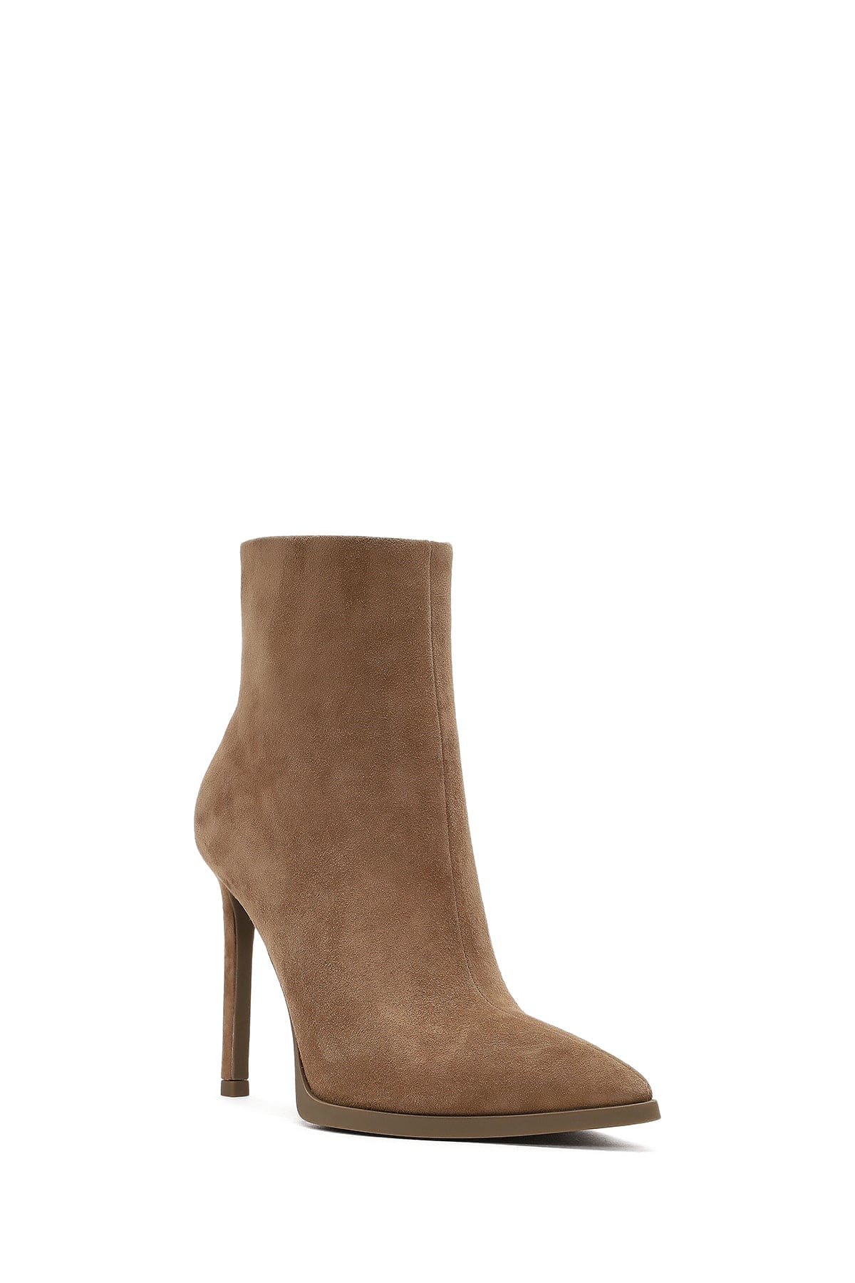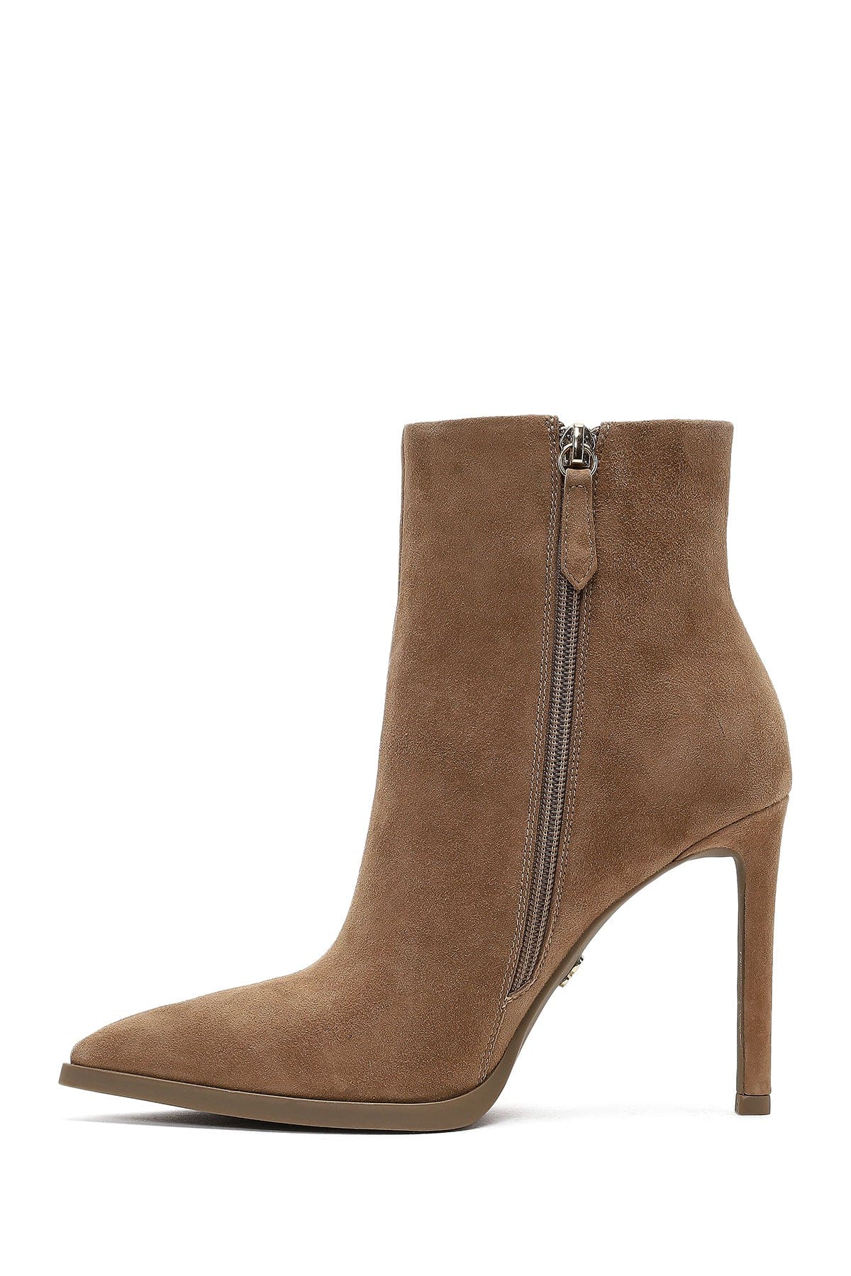 Kadın Bej Fermuarlı Yüksek İnce Topuklu Süet Deri Bot