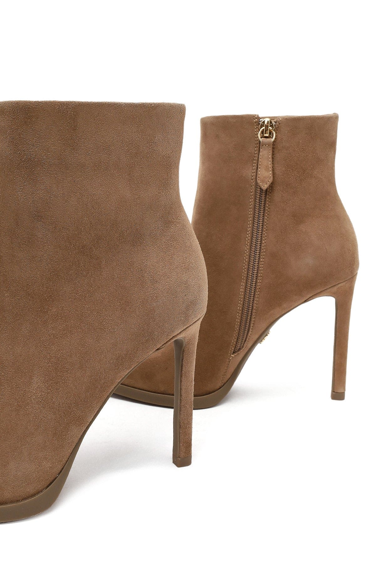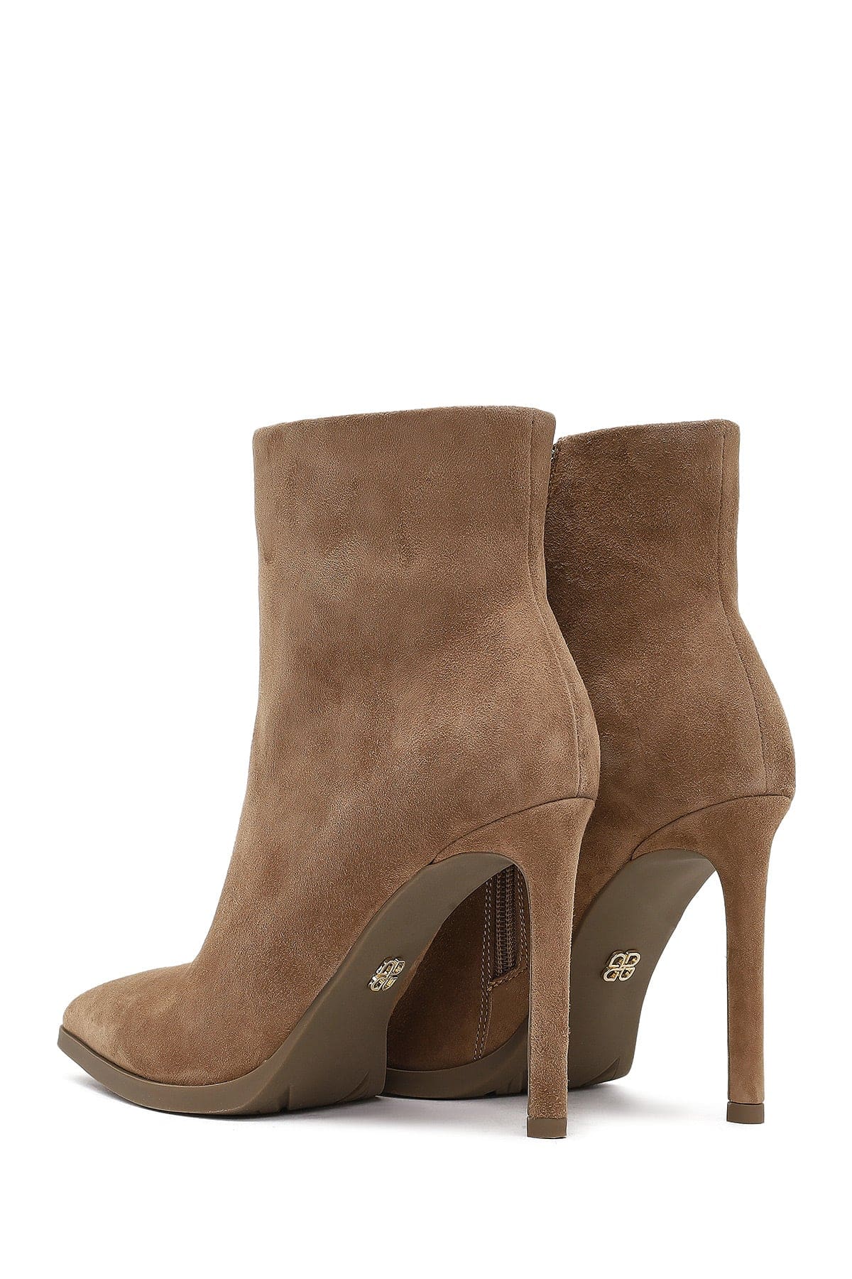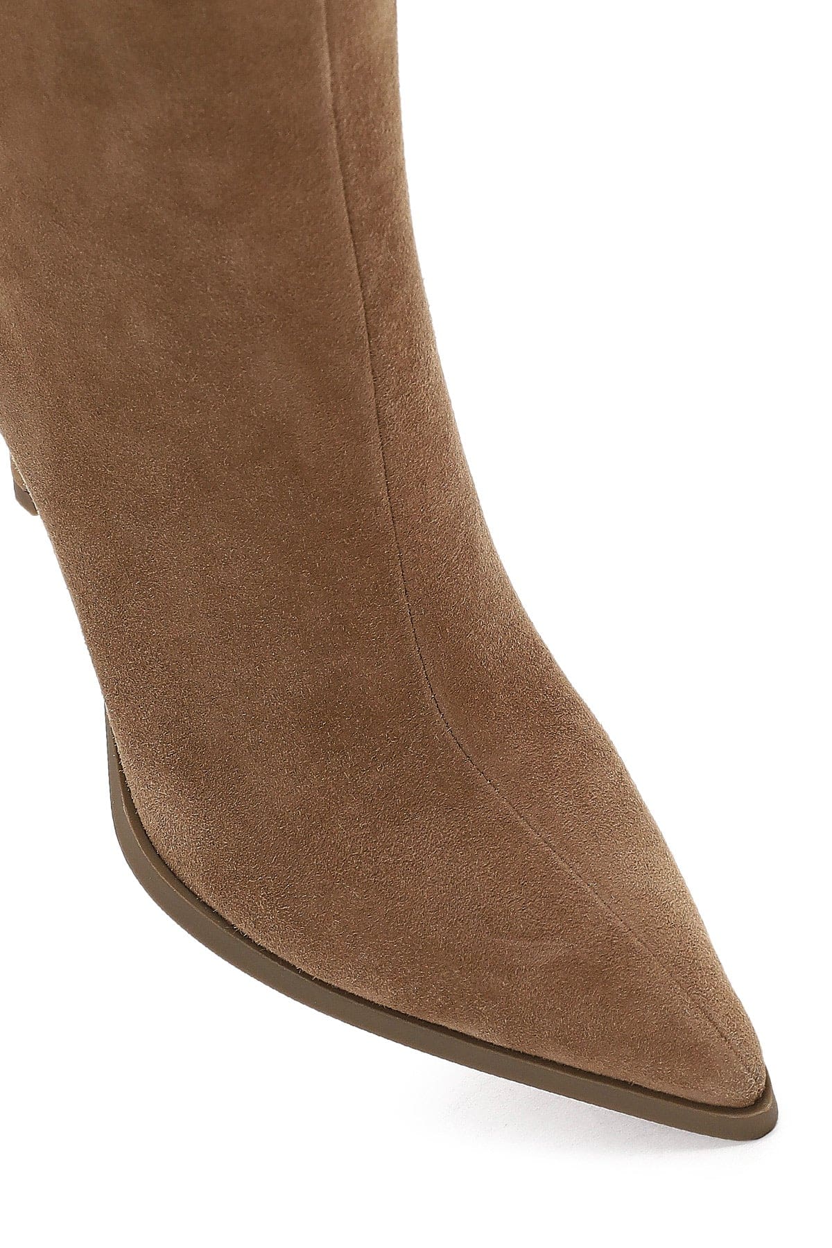 Kadın Bej Fermuarlı Yüksek İnce Topuklu Süet Deri Bot