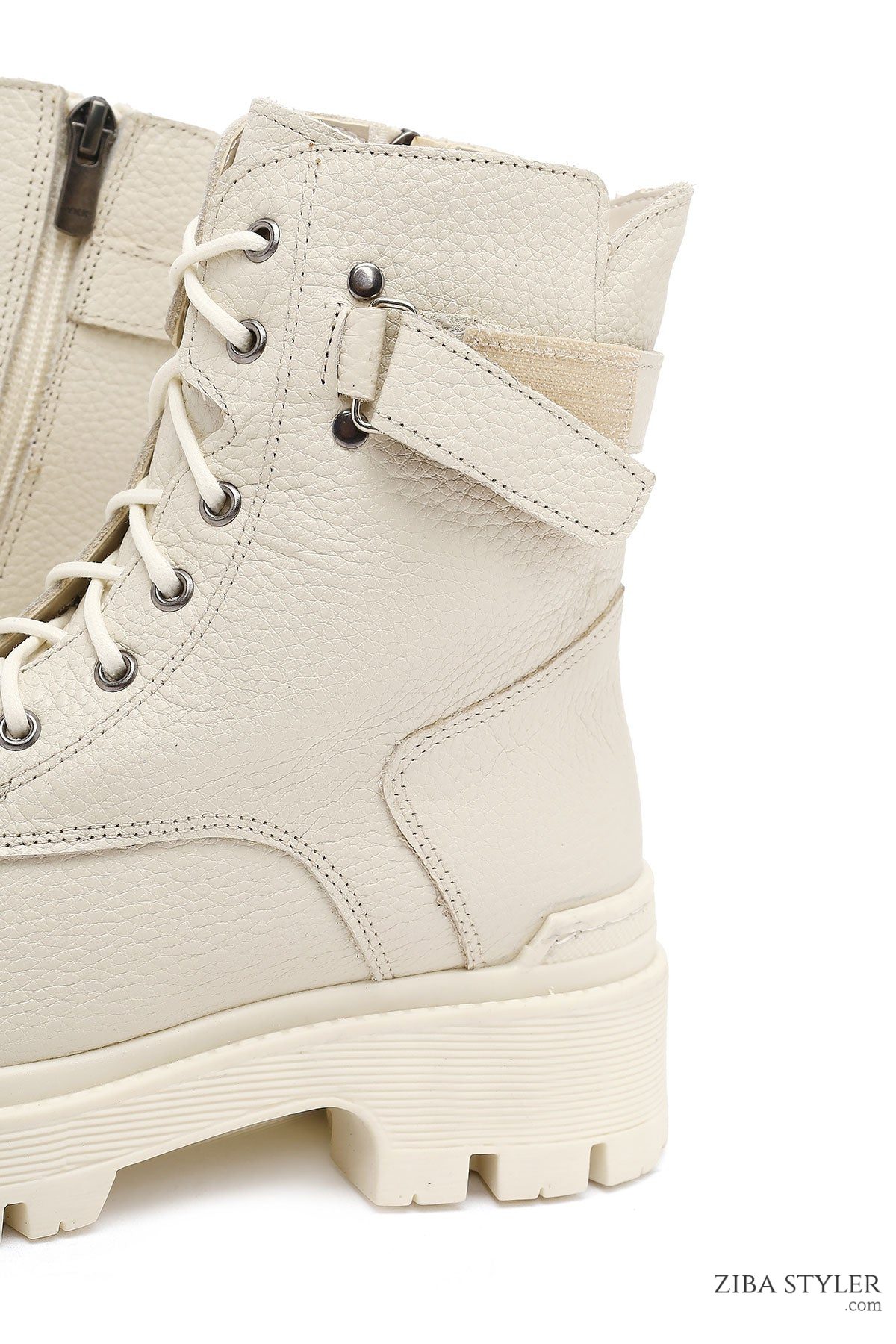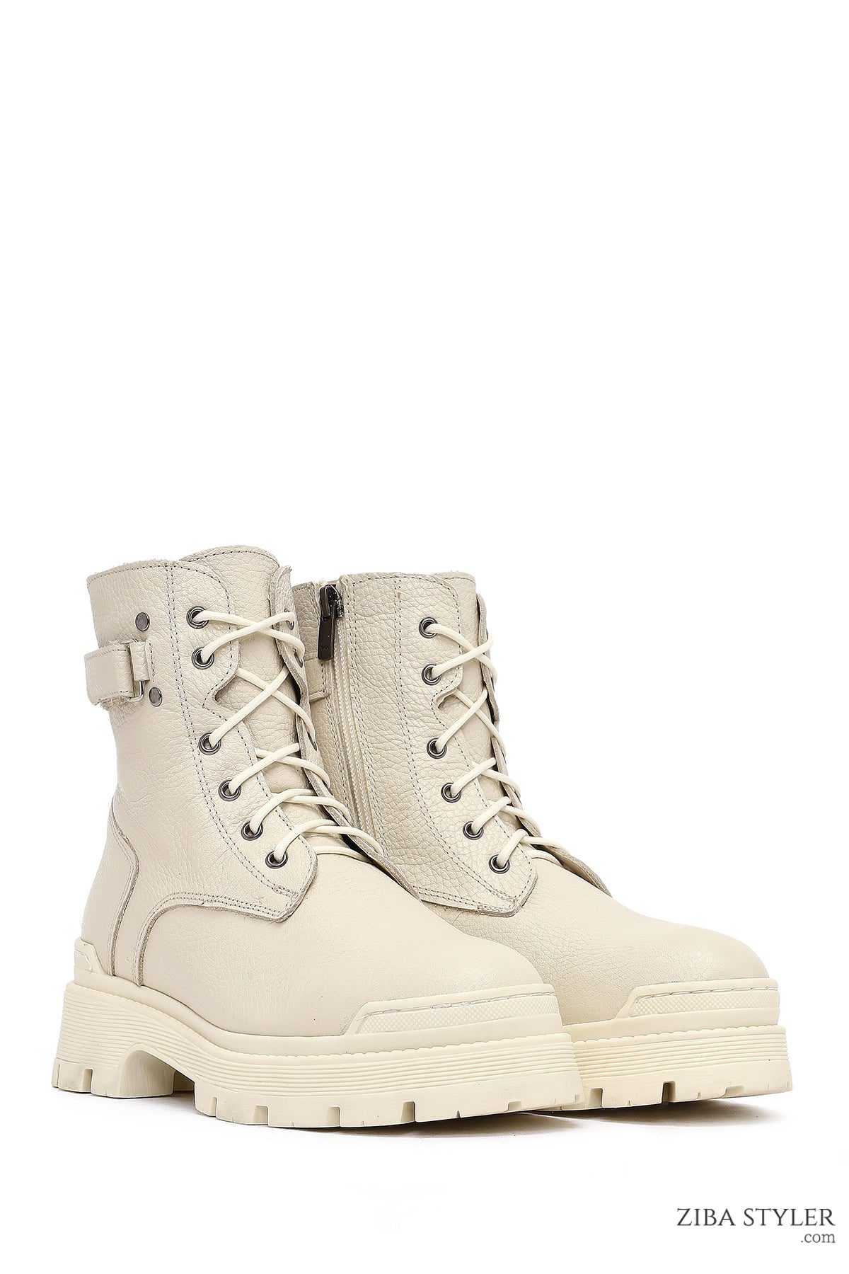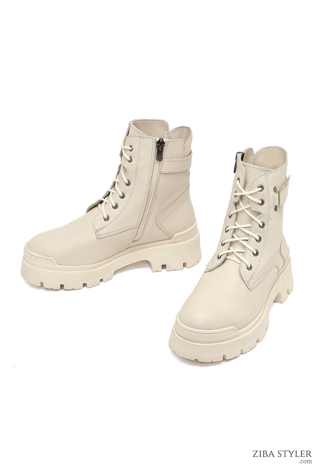 بوت پستال زنانه چرمی بژ بند دار زیپ دار کفی ضخیم دری مد