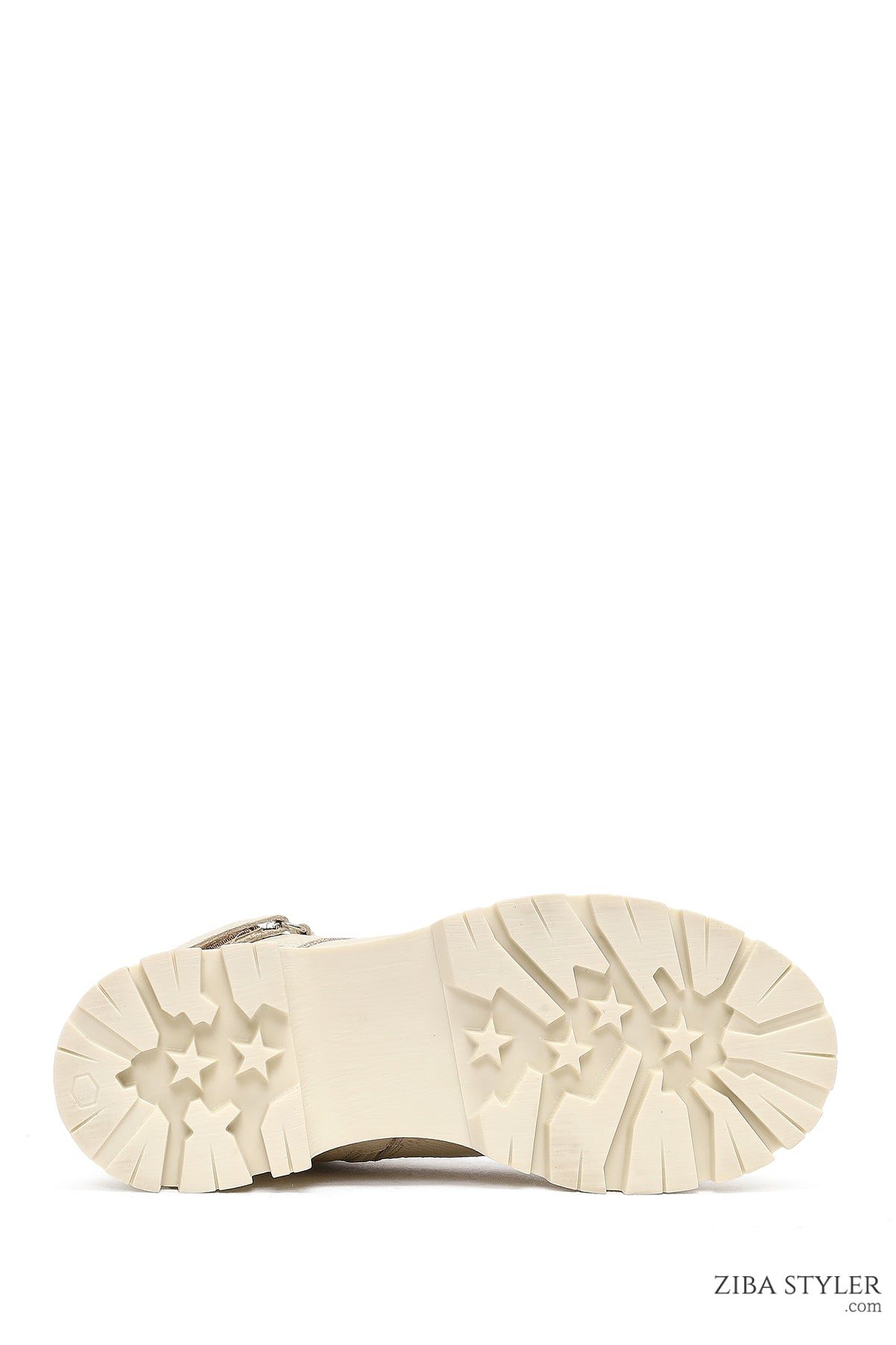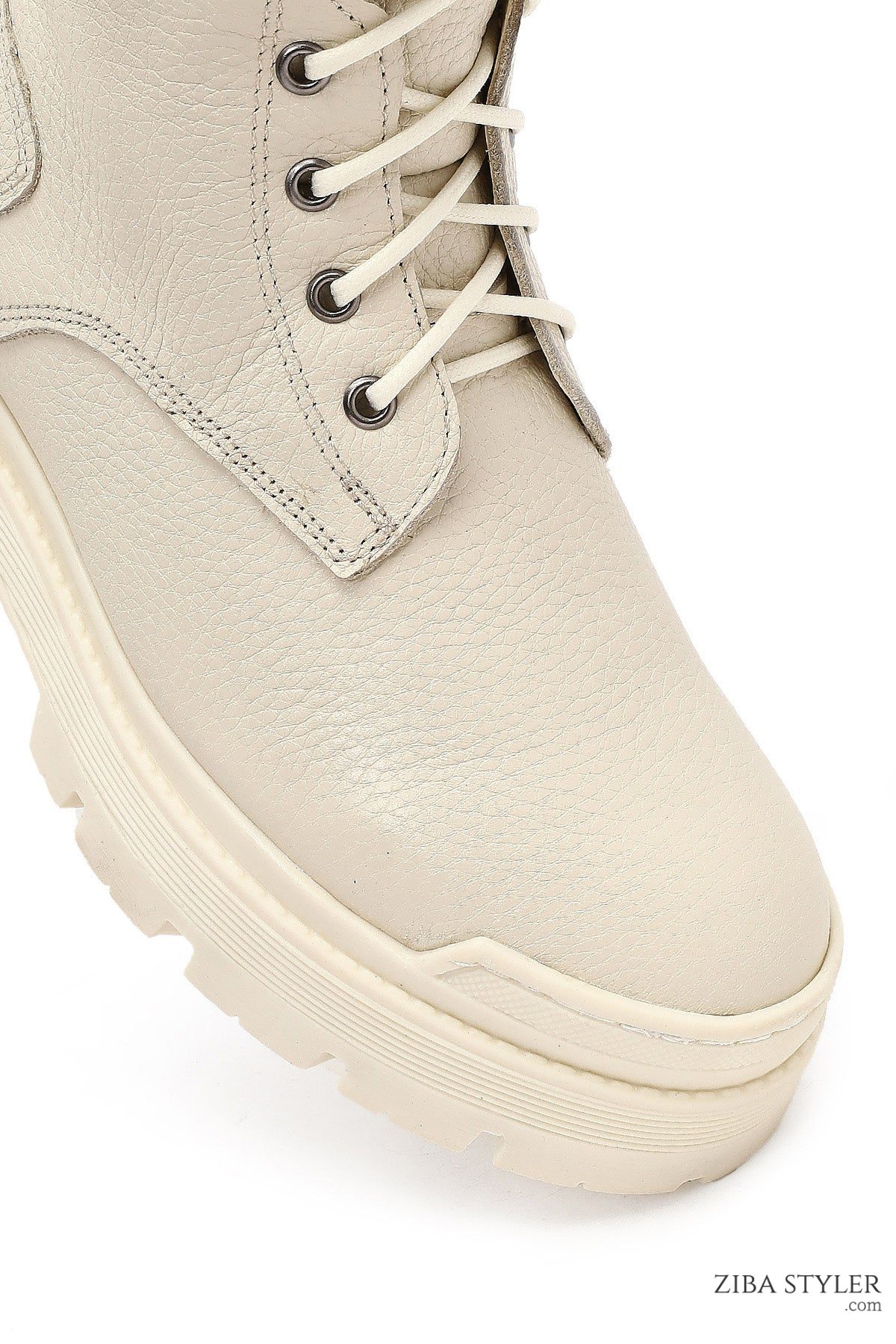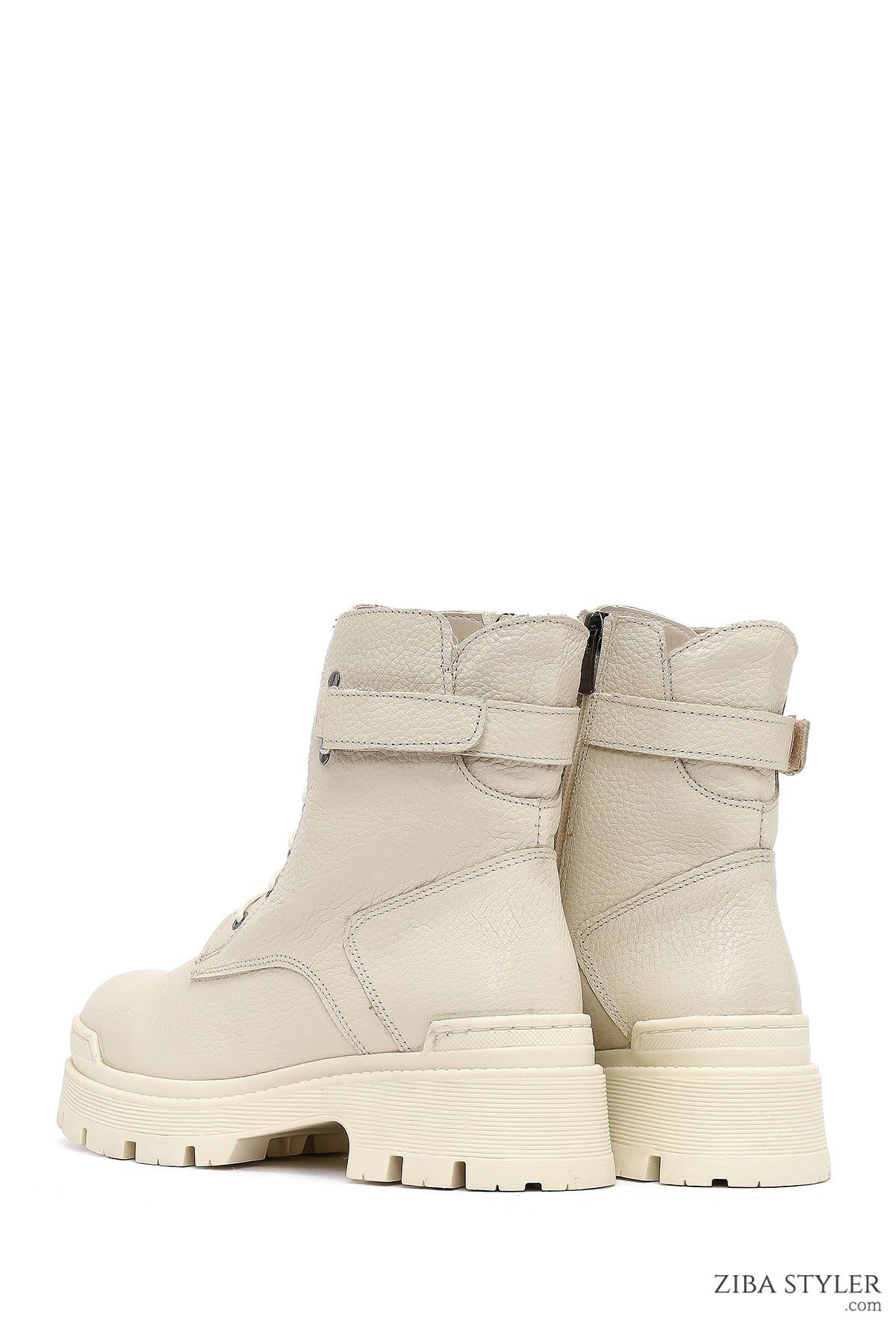 بوت پستال زنانه چرمی بژ بند دار زیپ دار کفی ضخیم دری مد