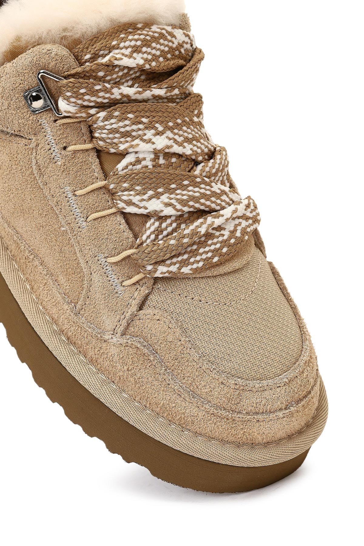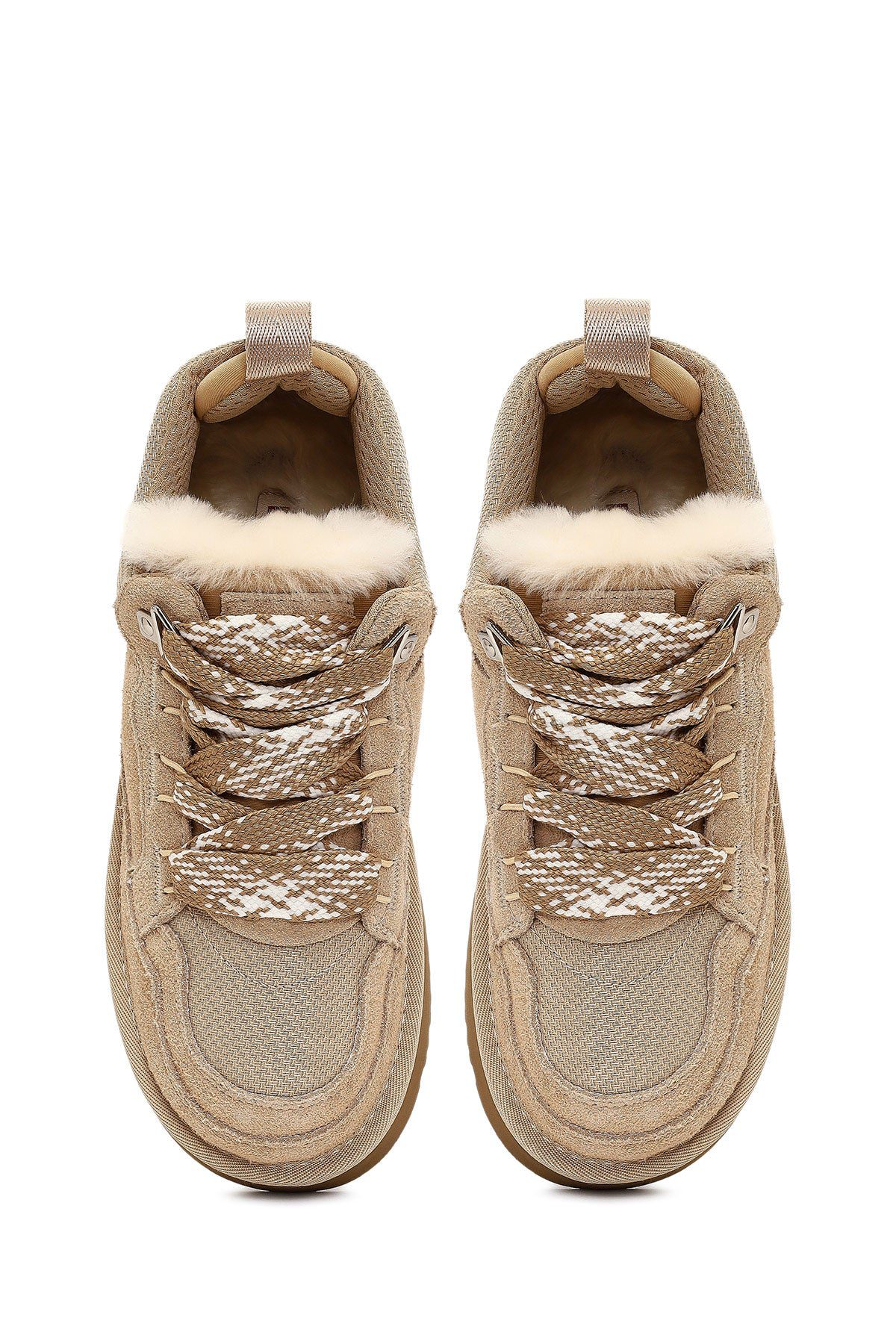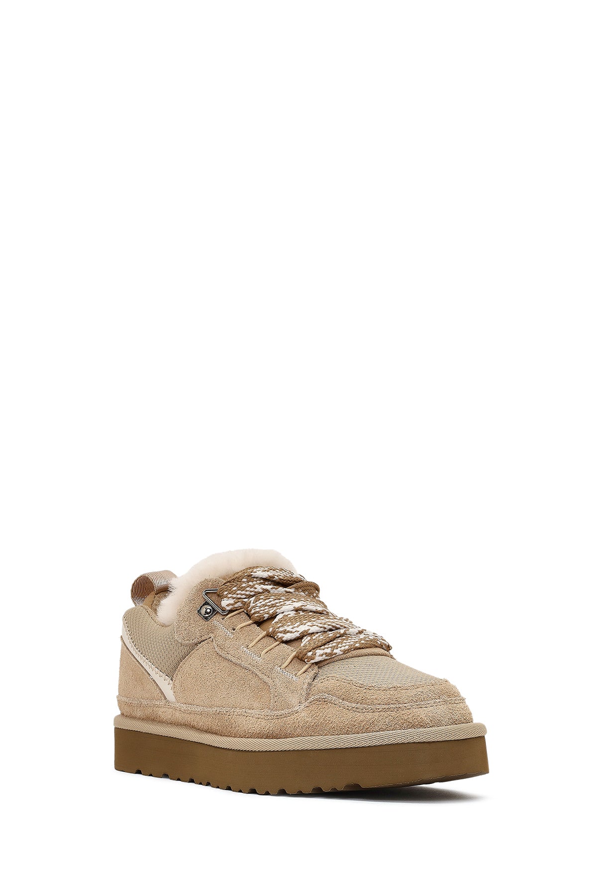 Kadın Bej Bağcıklı Kalın Tabanlı Tüylü Süet Deri Teddy Sneaker