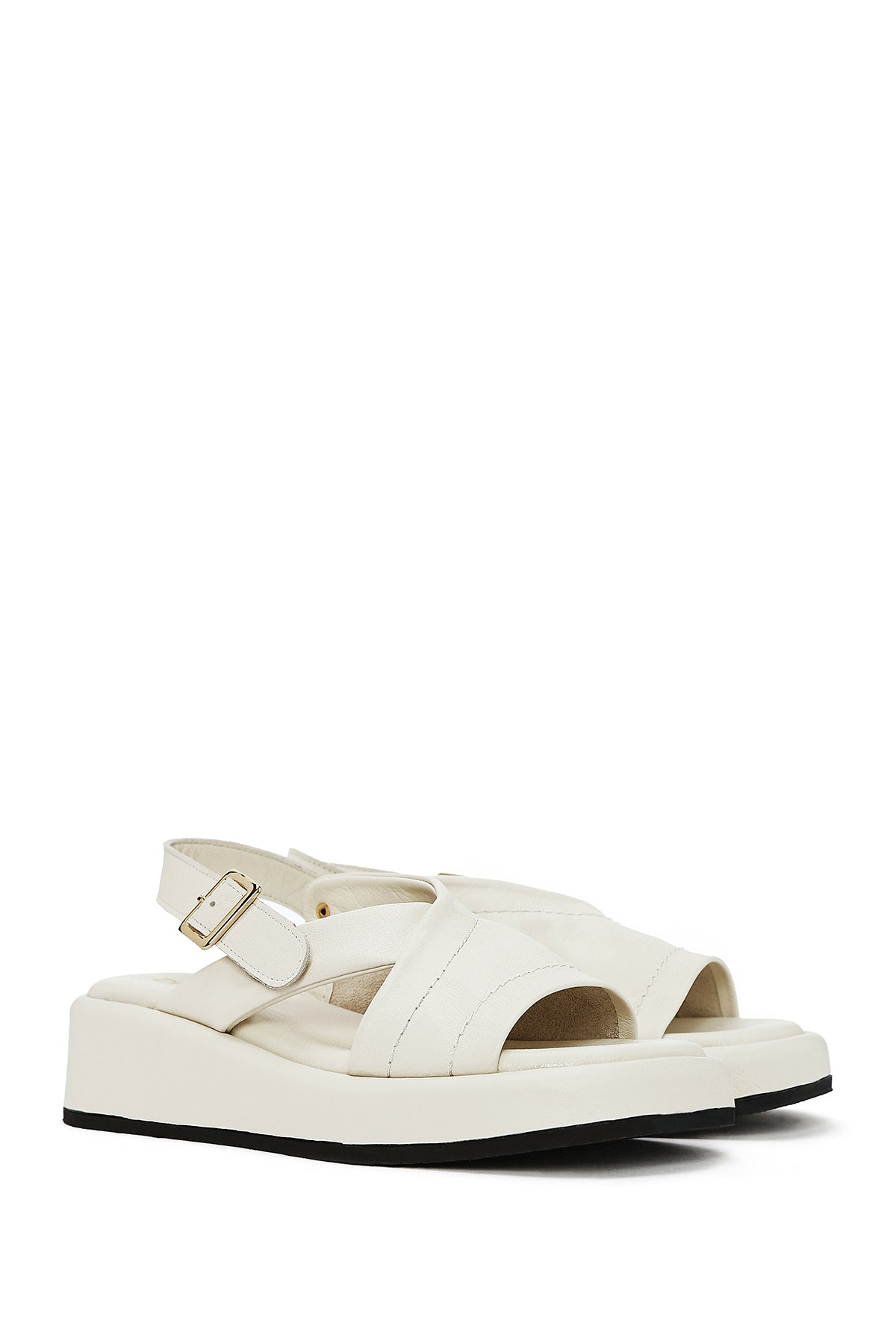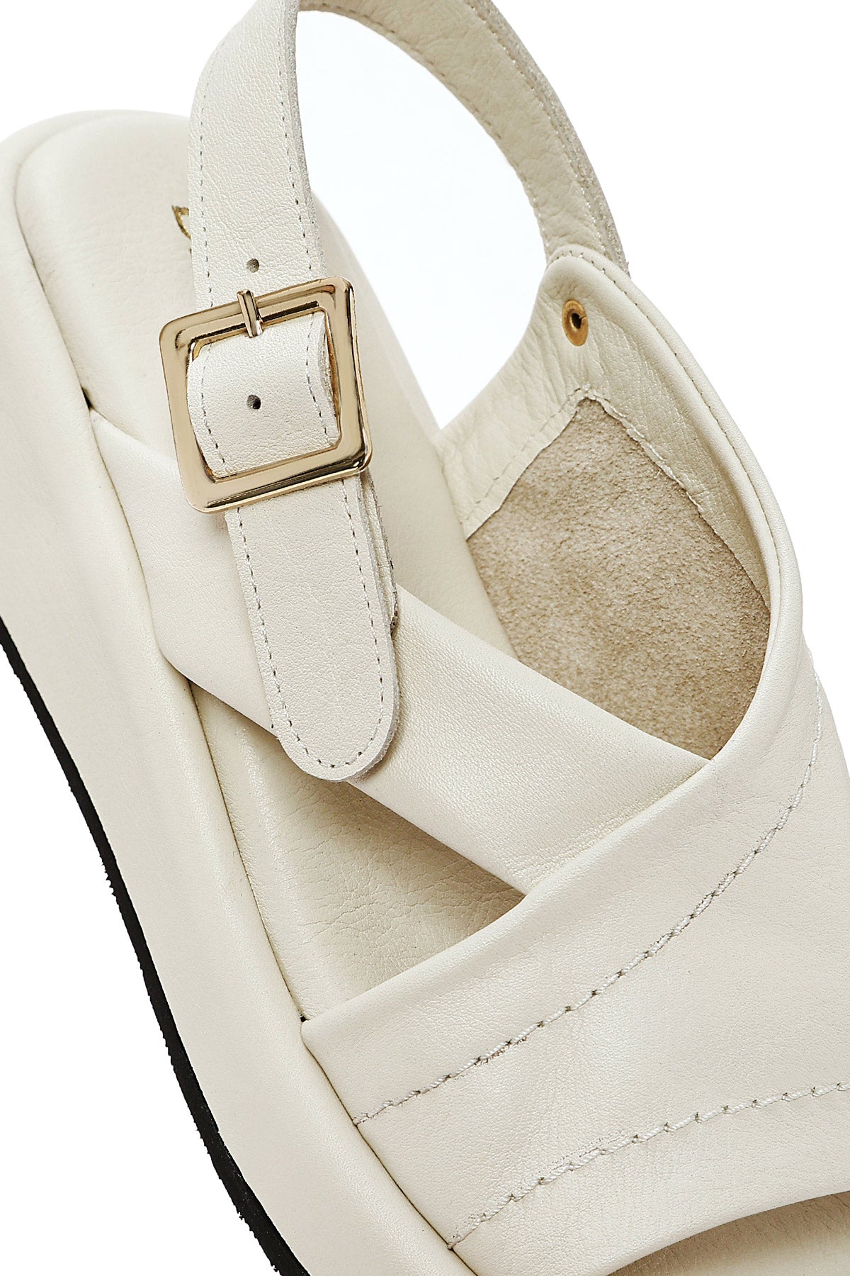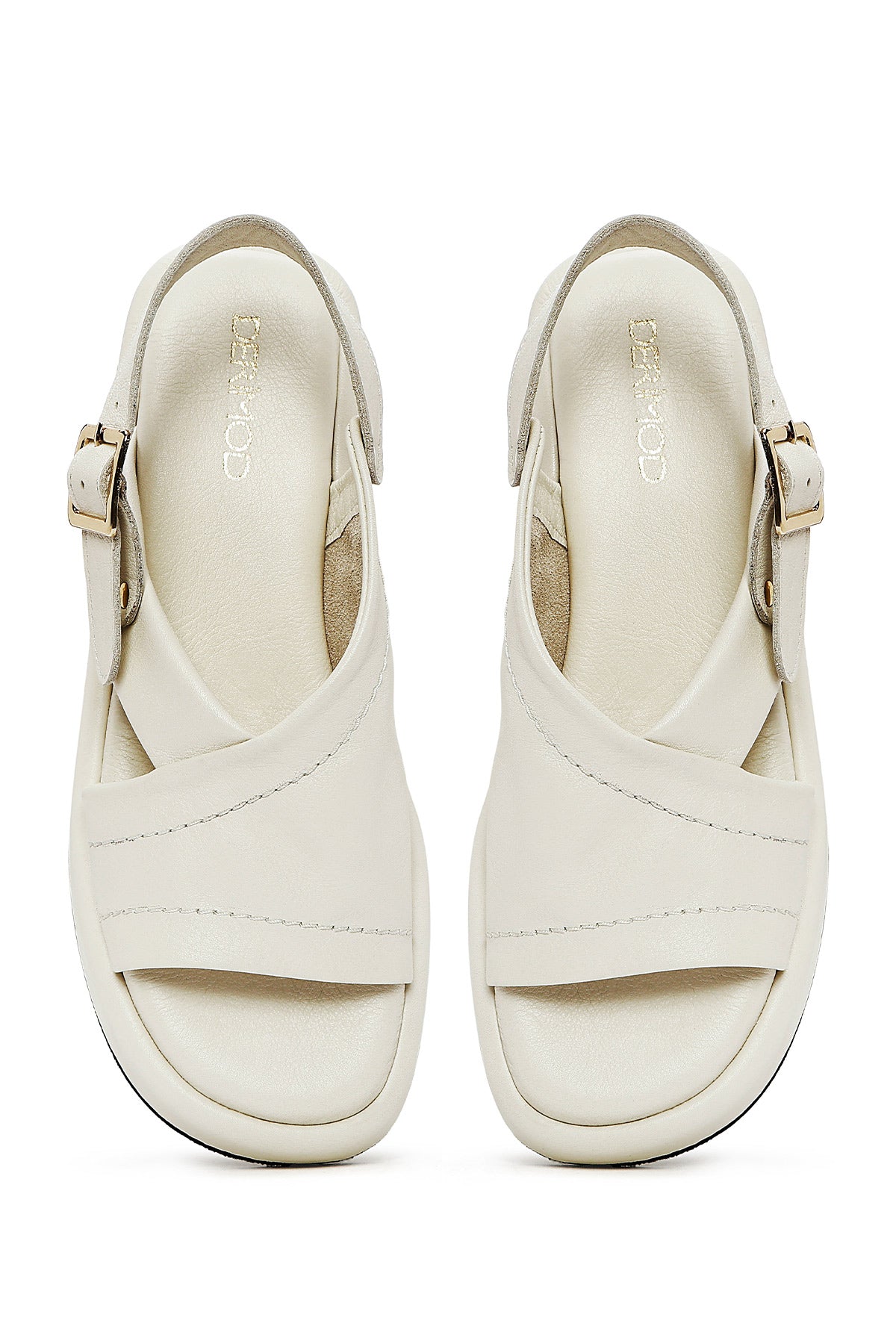 صندل زنانه بژ چرم بنددار تخت ضخیم دری مد