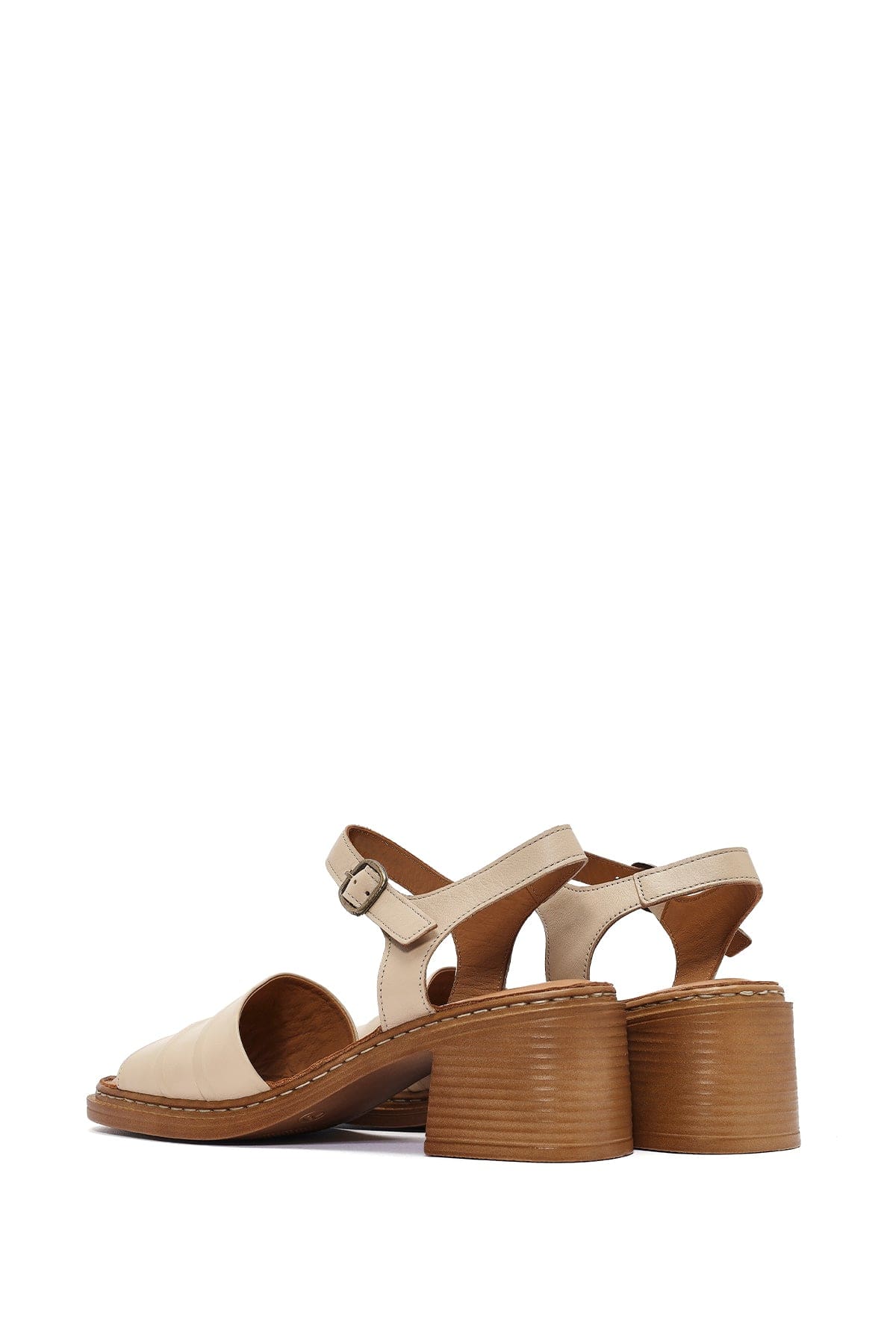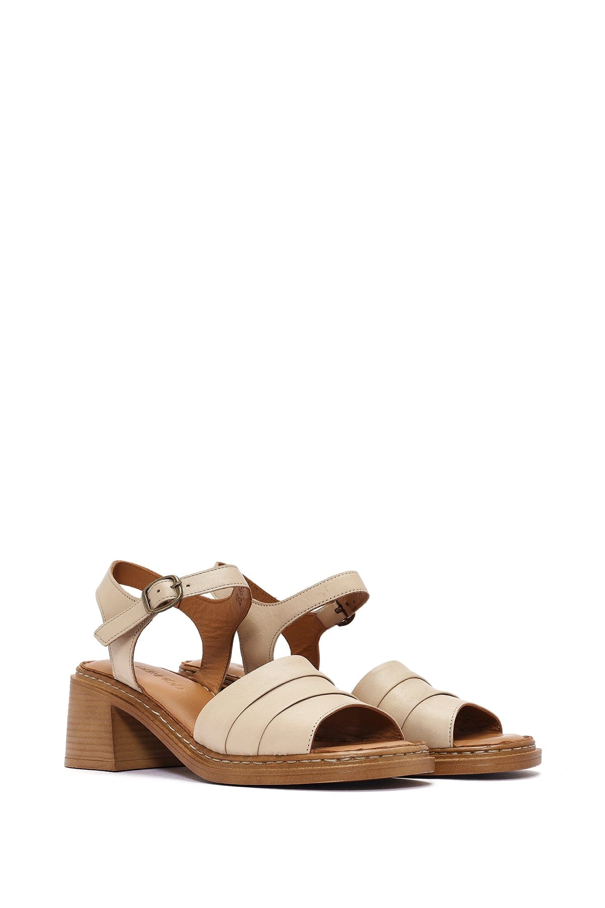 Kadın Bej Bilekten Bağlamalı Kalın Topuklu Deri Sandalet