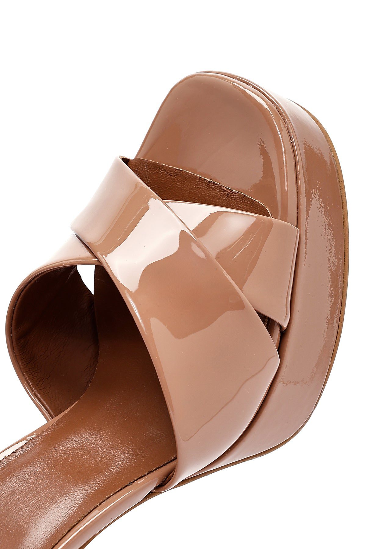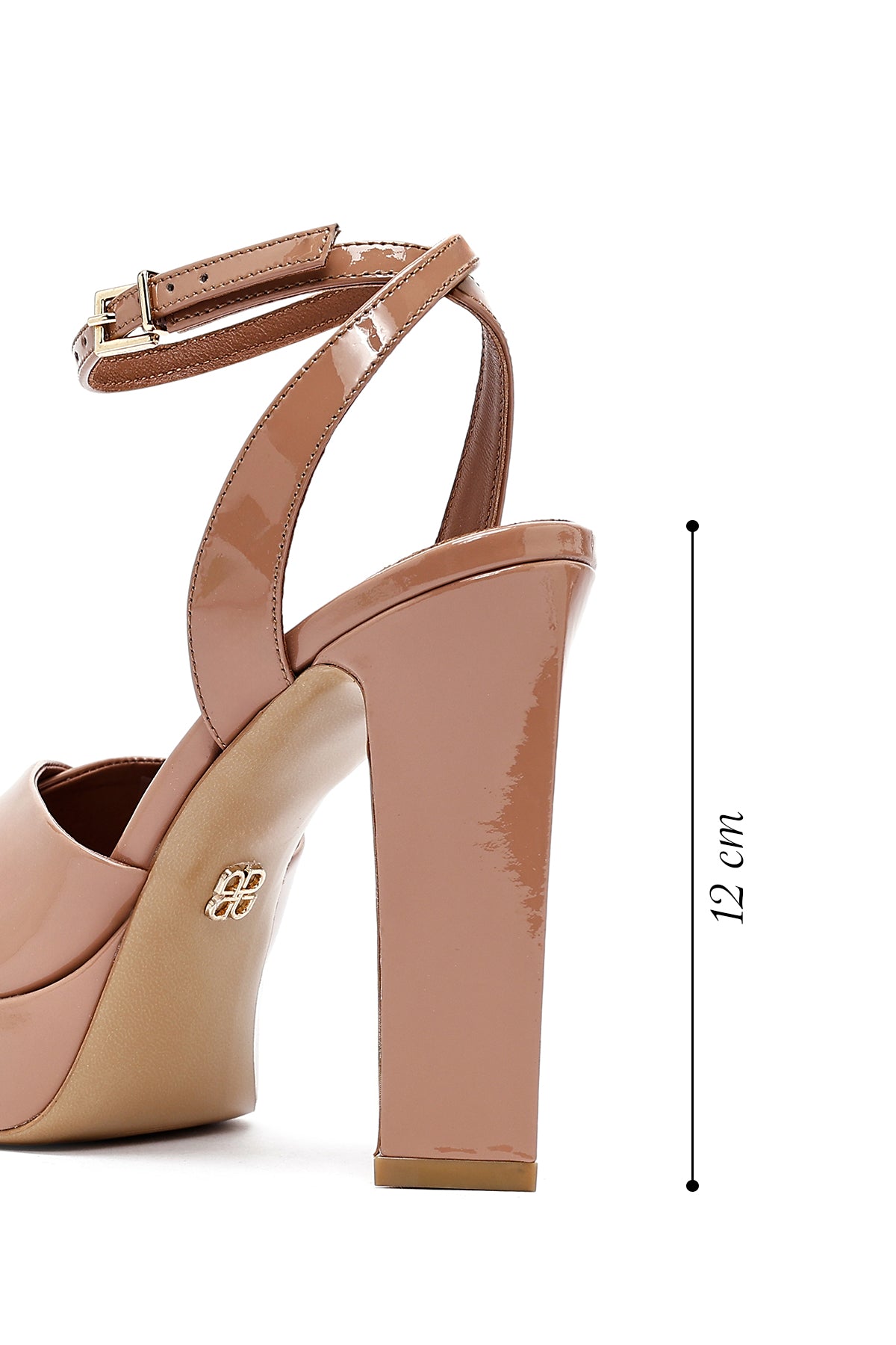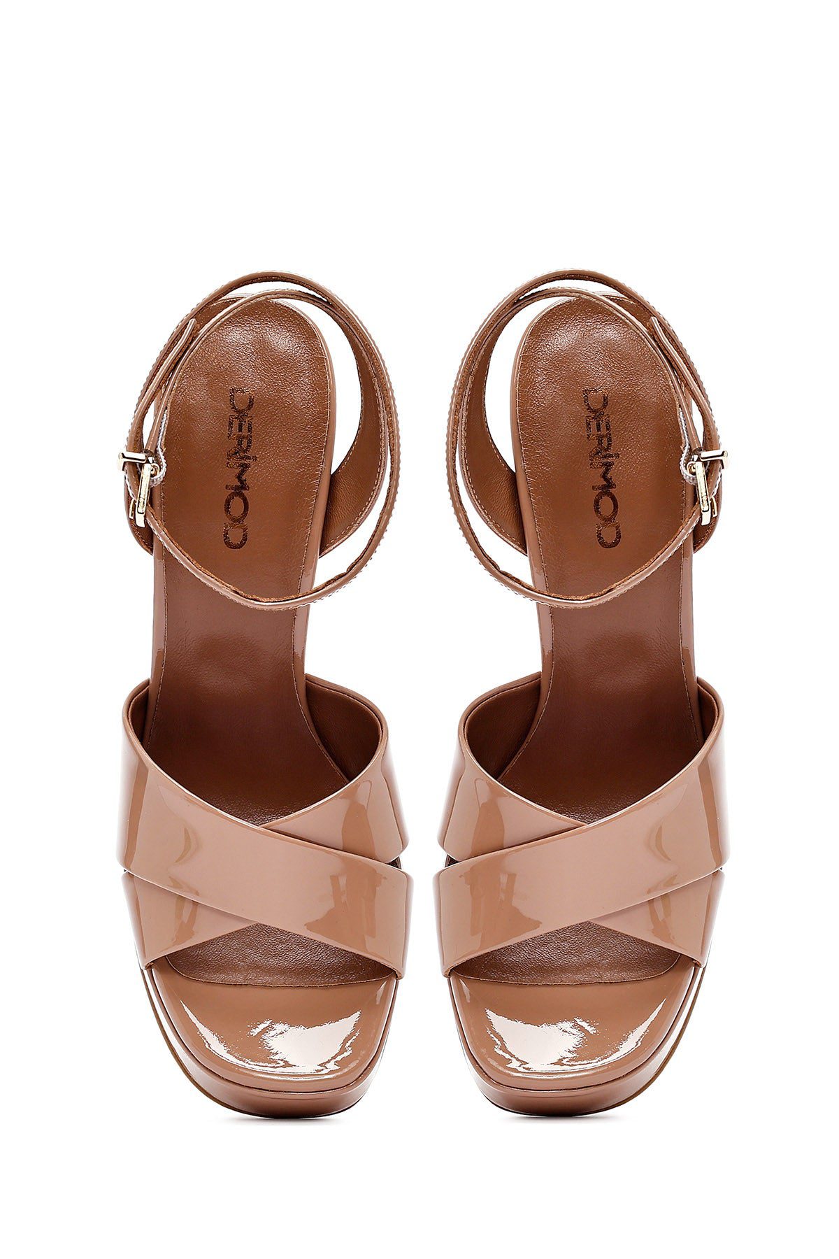 صندل زنانه بژ چرم ورنی پلتفرم پاشنهضخیم بلند بنددار دری مد