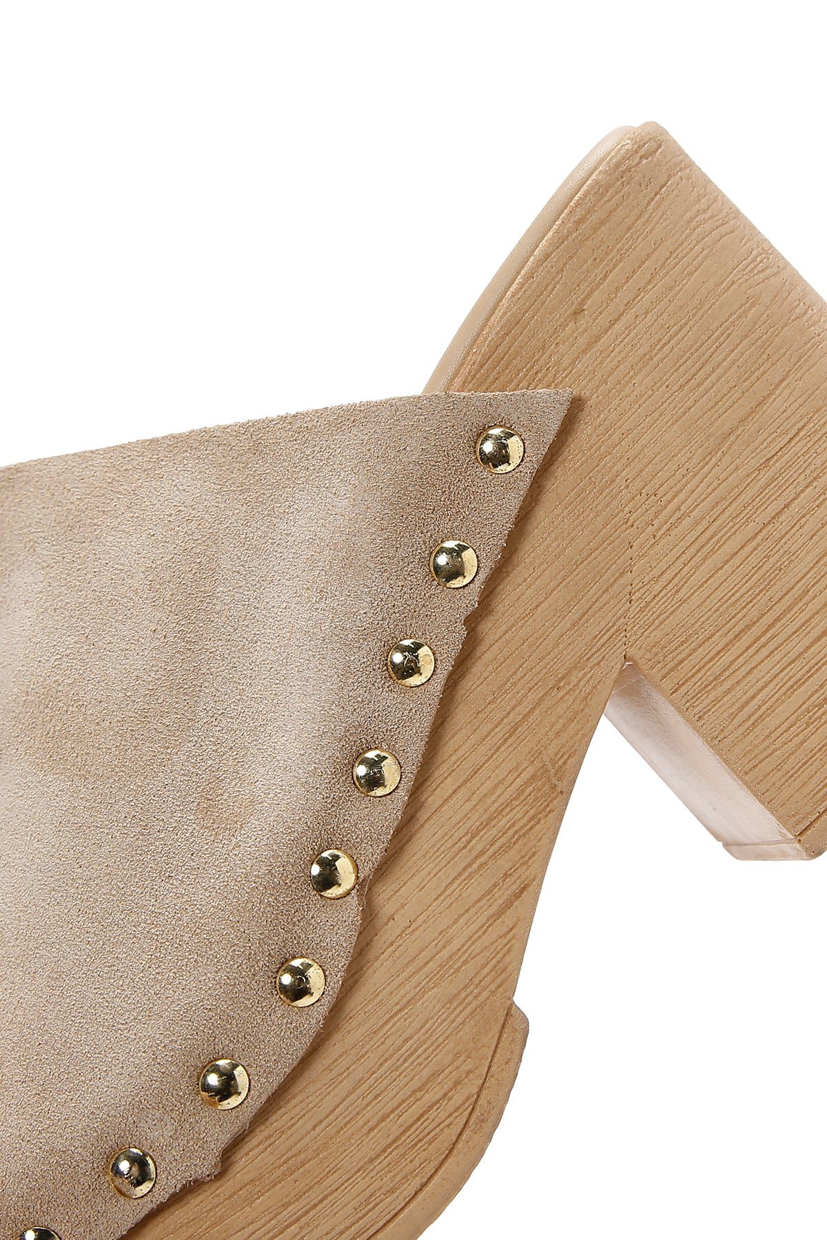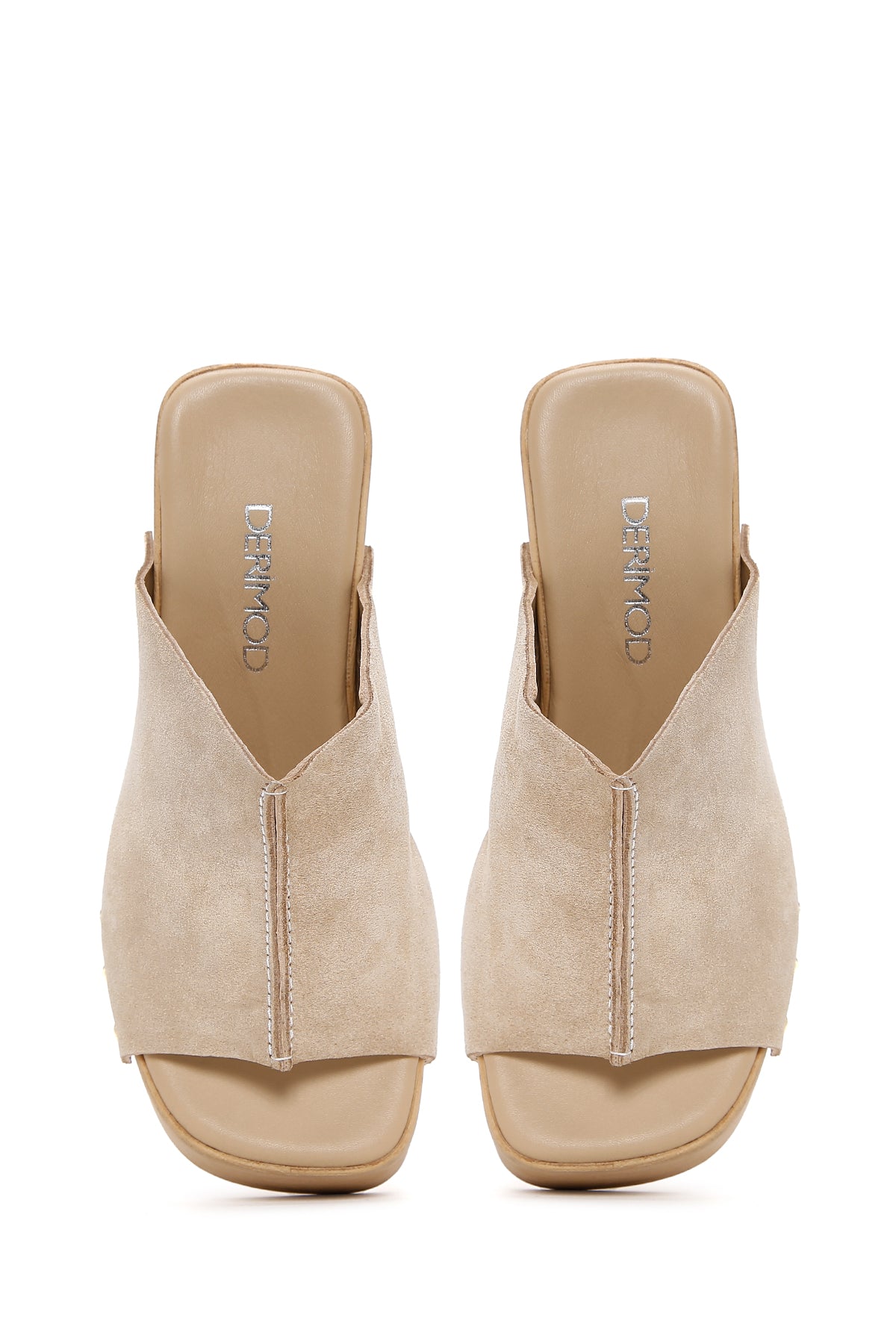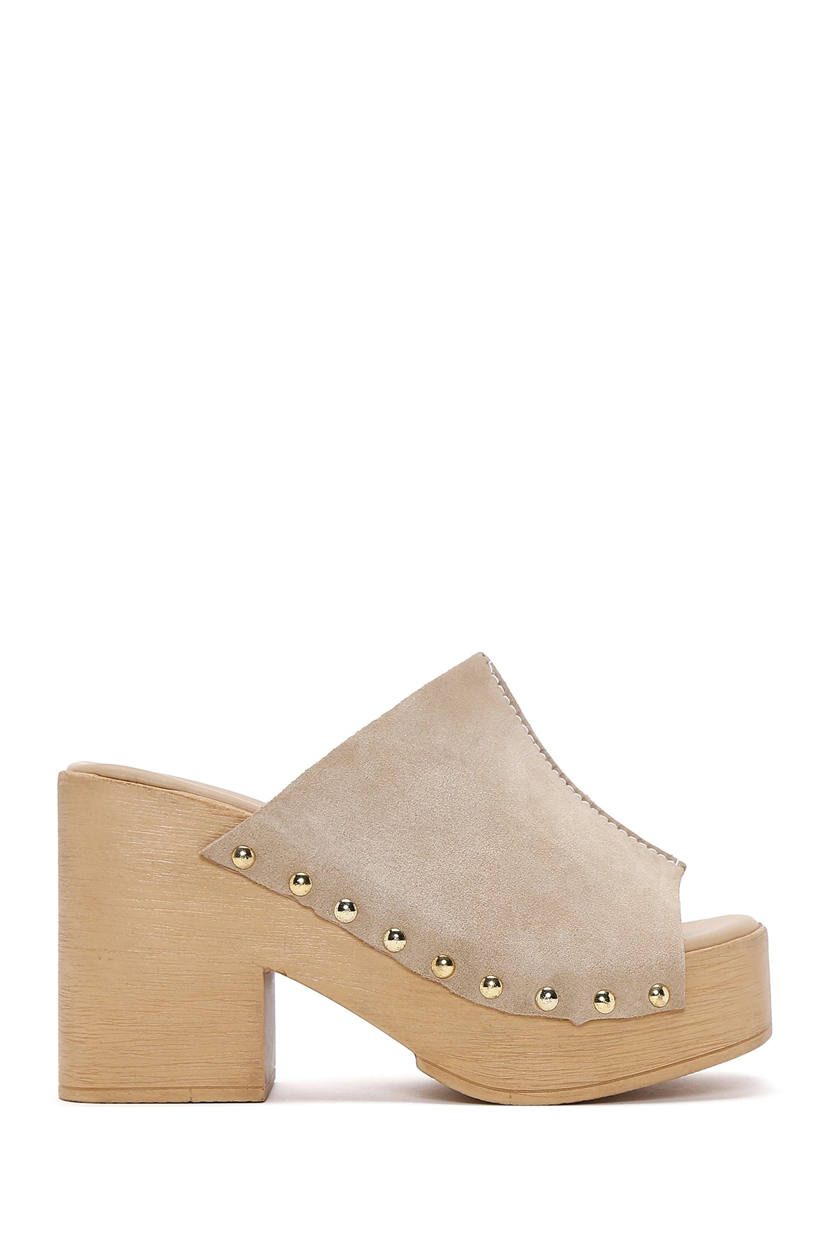 Kadın Bej Yüksek Kalın Topuklu Süet Deri Terlik