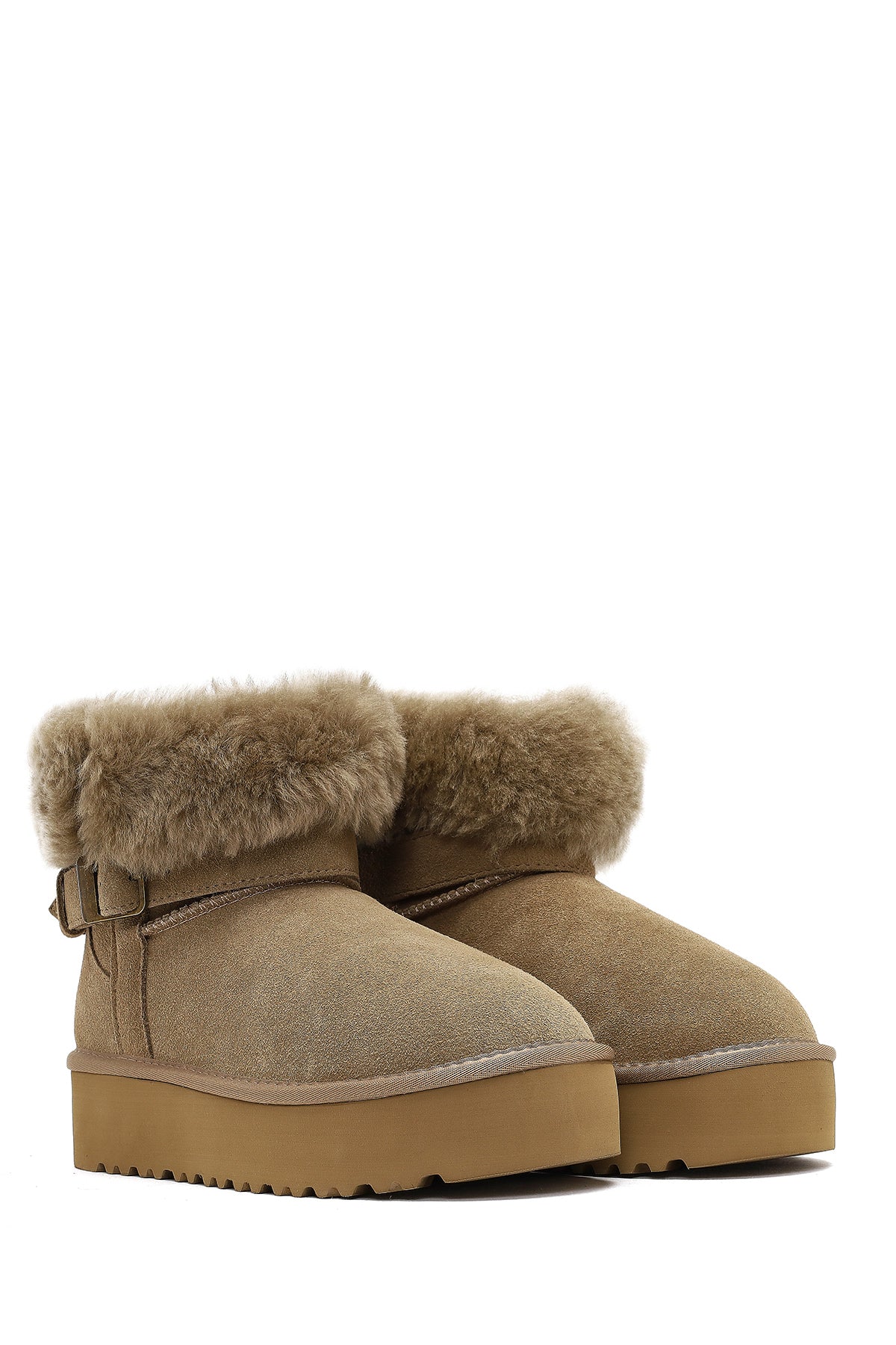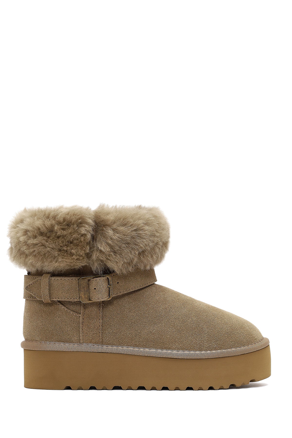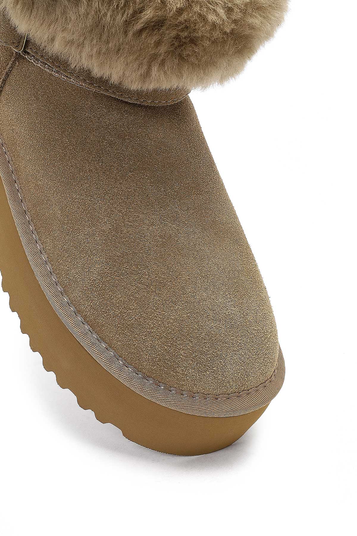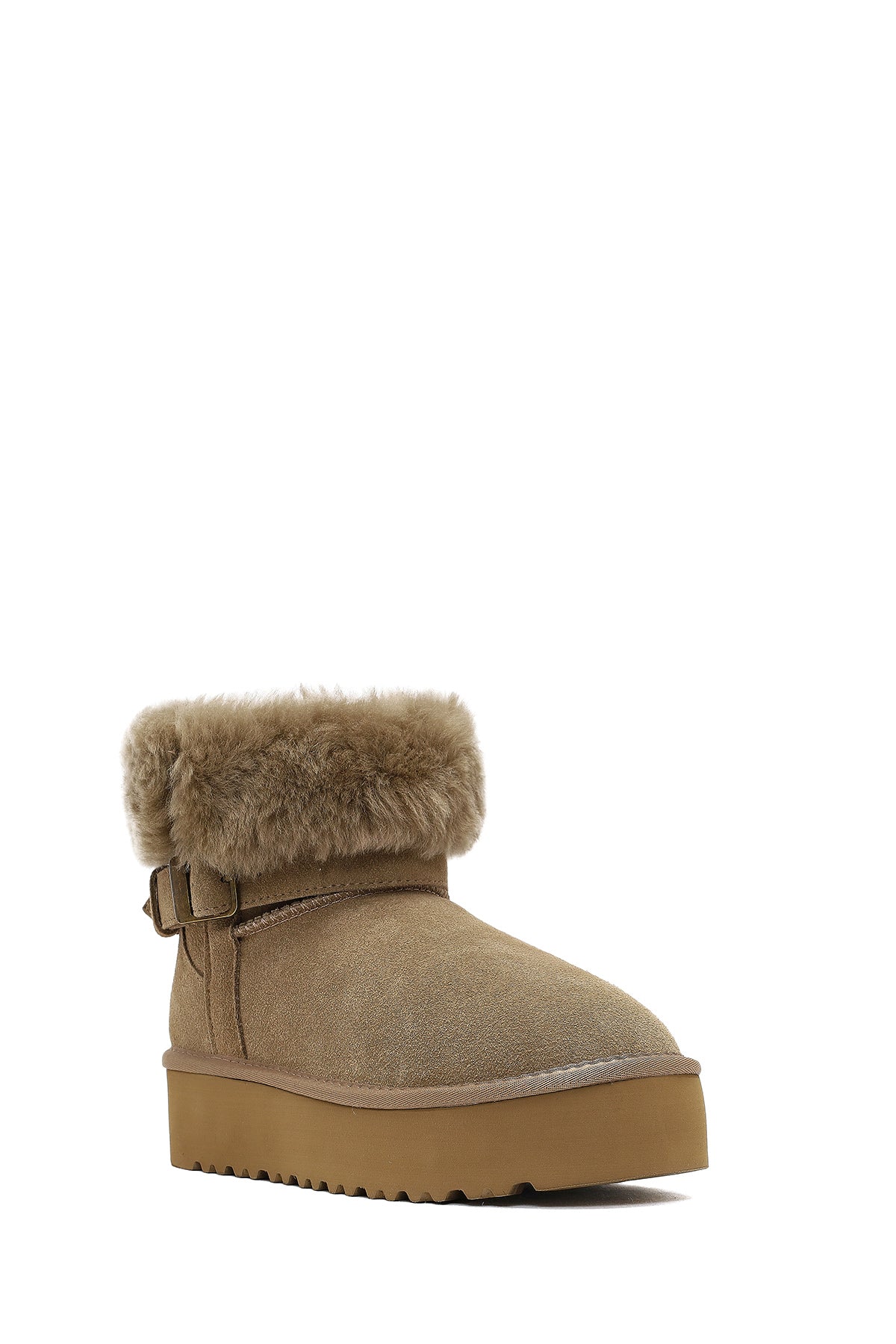 Kadın Bej Kalın Tabanlı Kürk Detaylı Süet Deri Teddy Bot