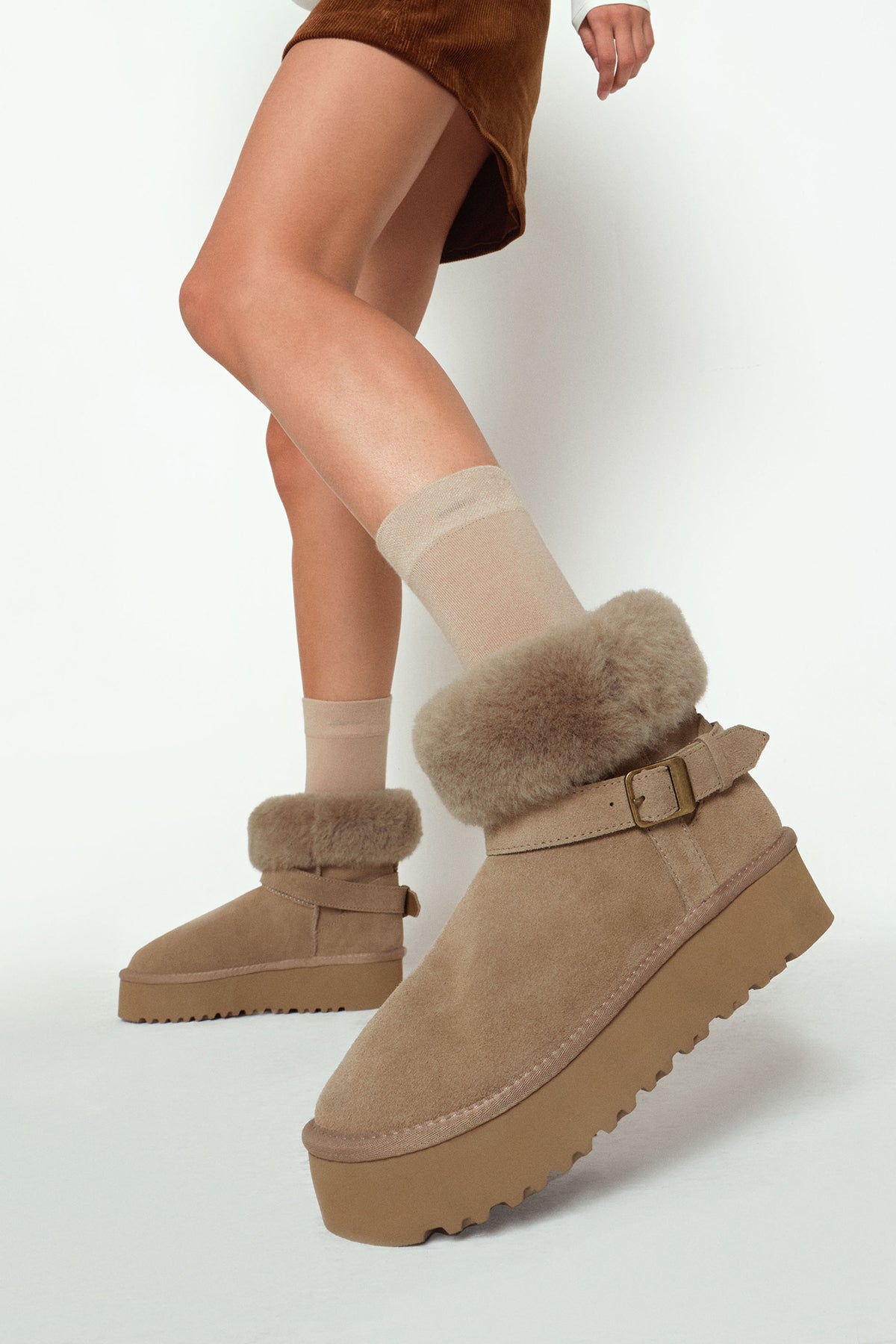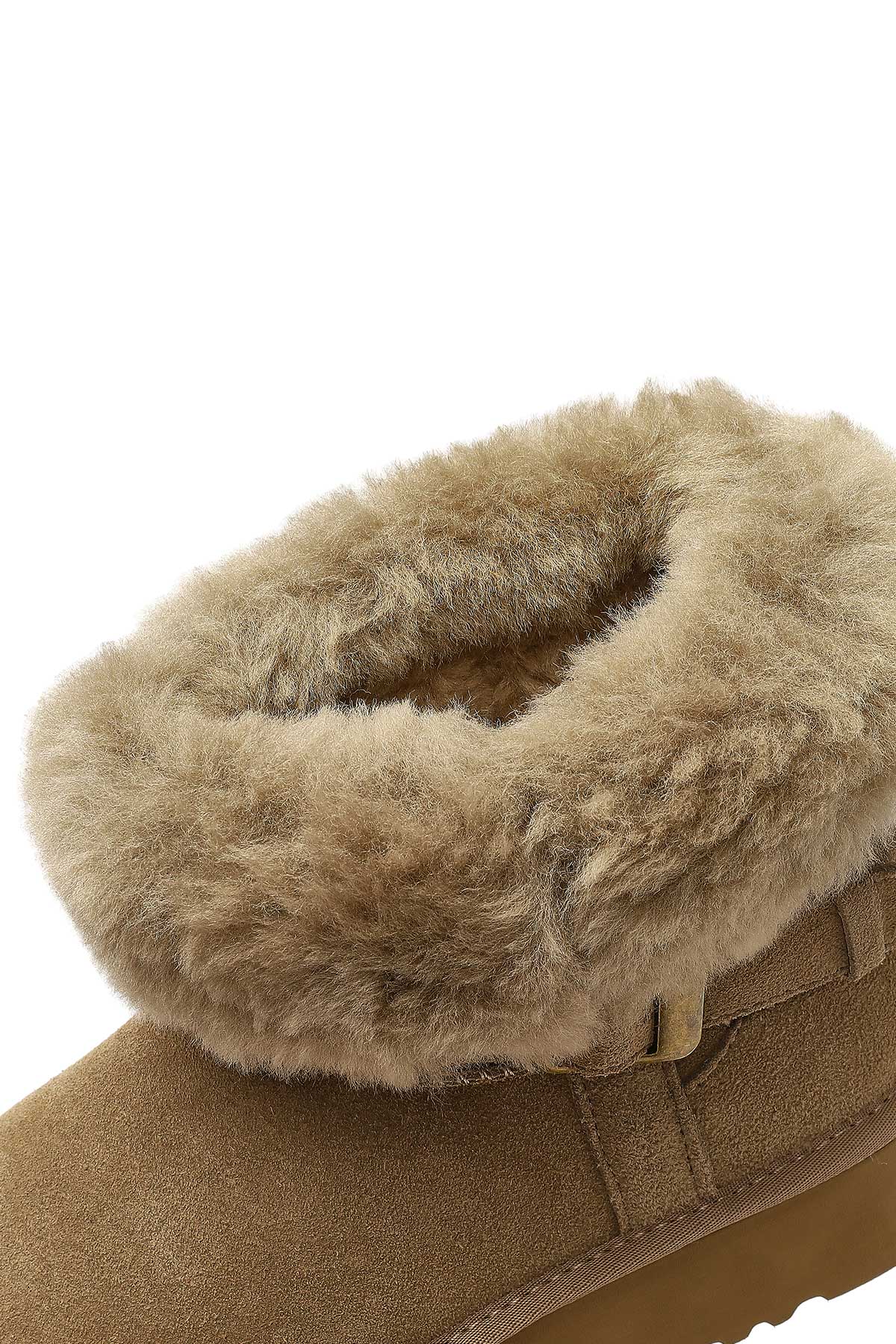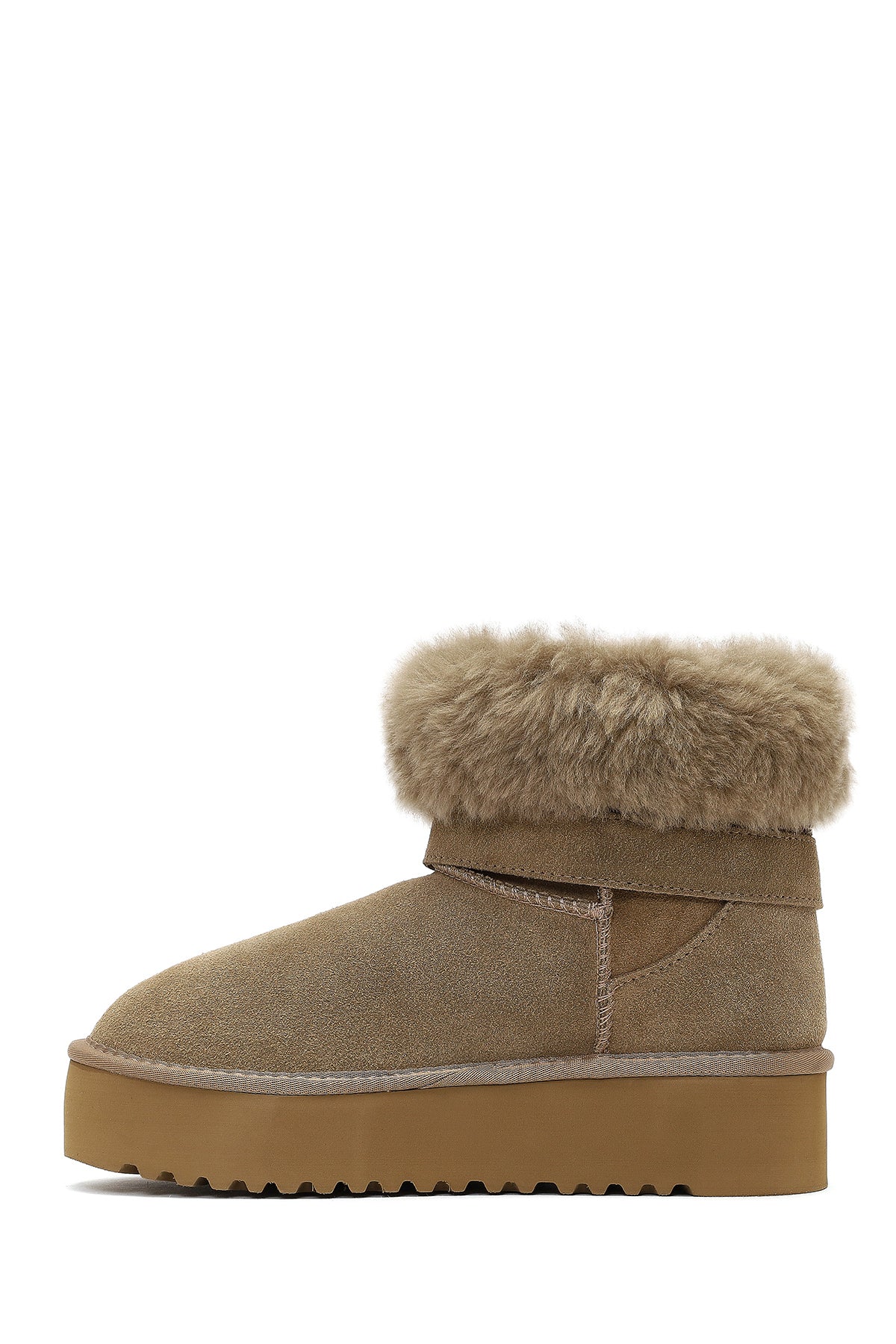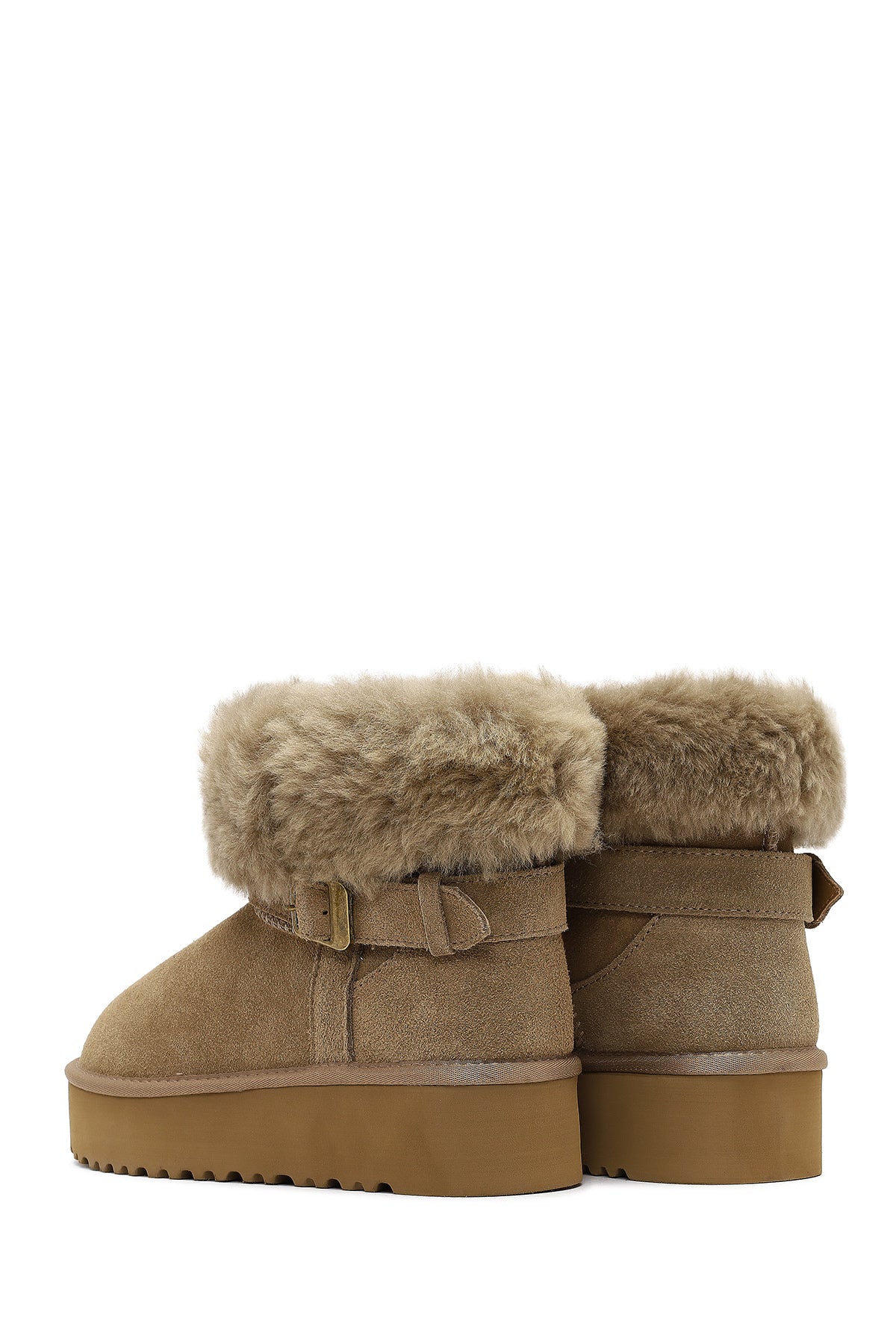 Kadın Bej Kalın Tabanlı Kürk Detaylı Süet Deri Teddy Bot