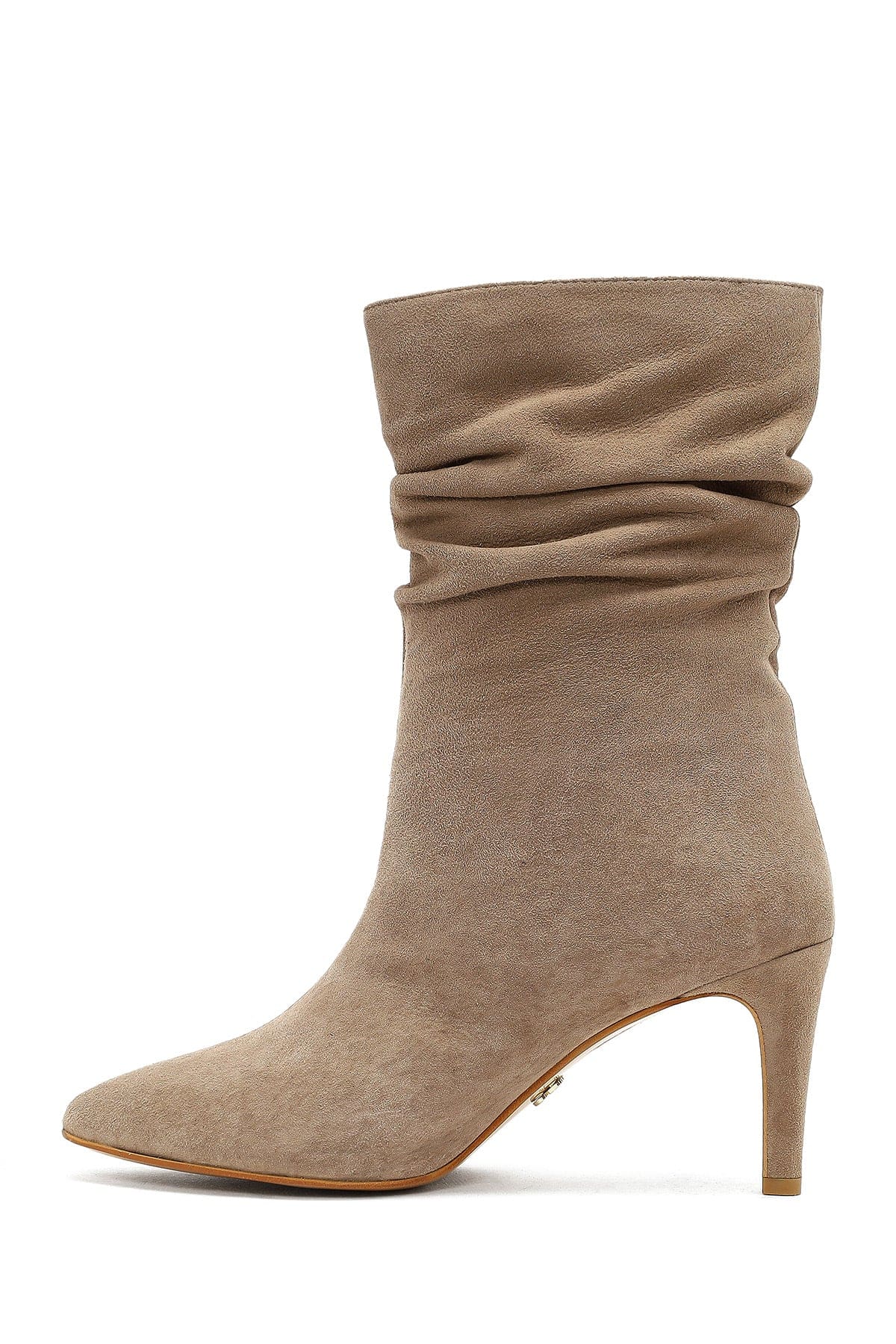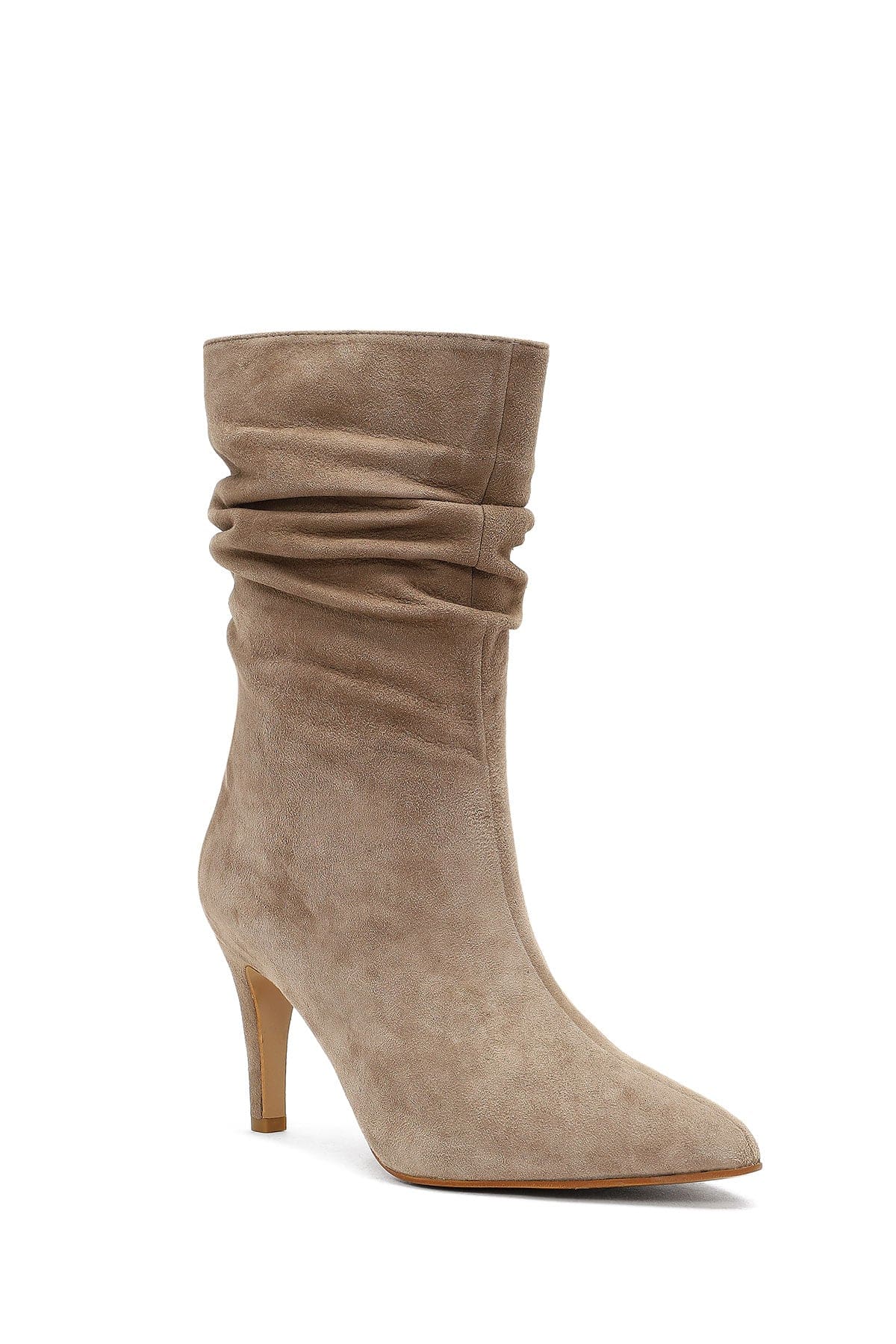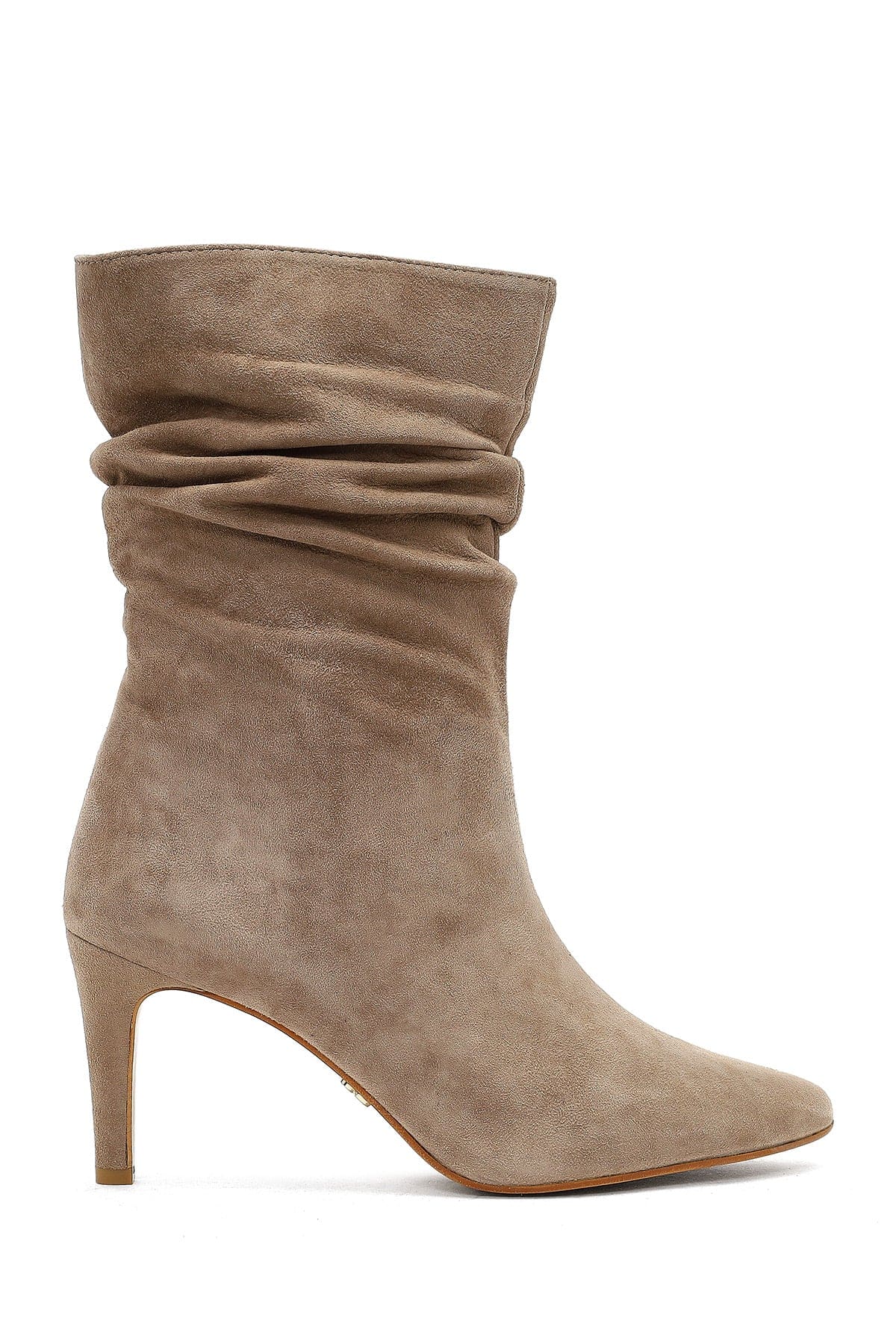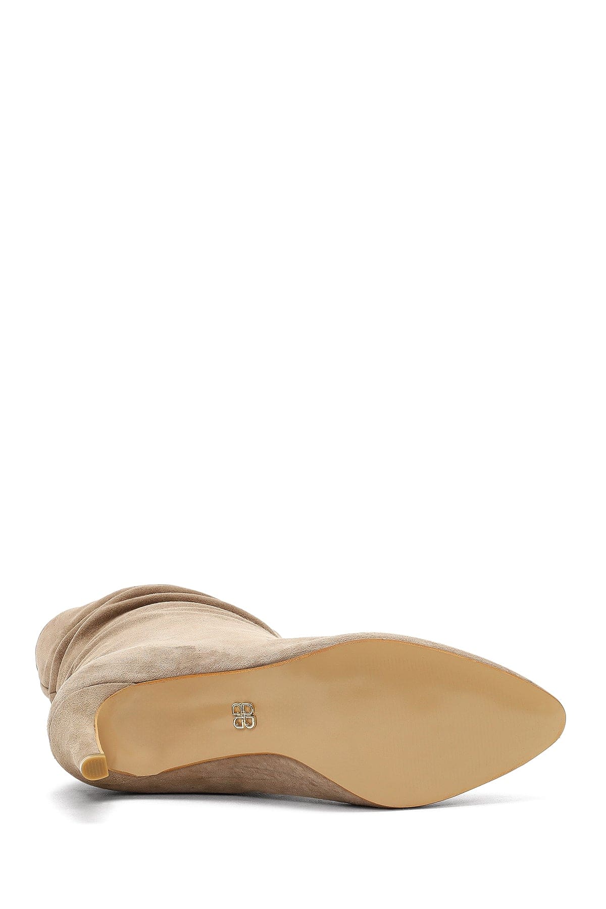 Kadın Bej İnce Topuklu Süet Deri Bot