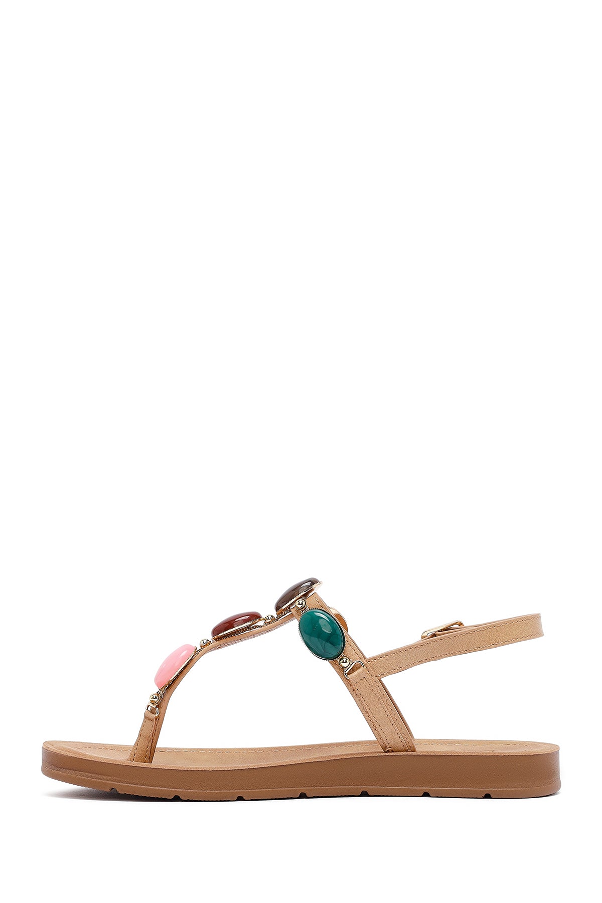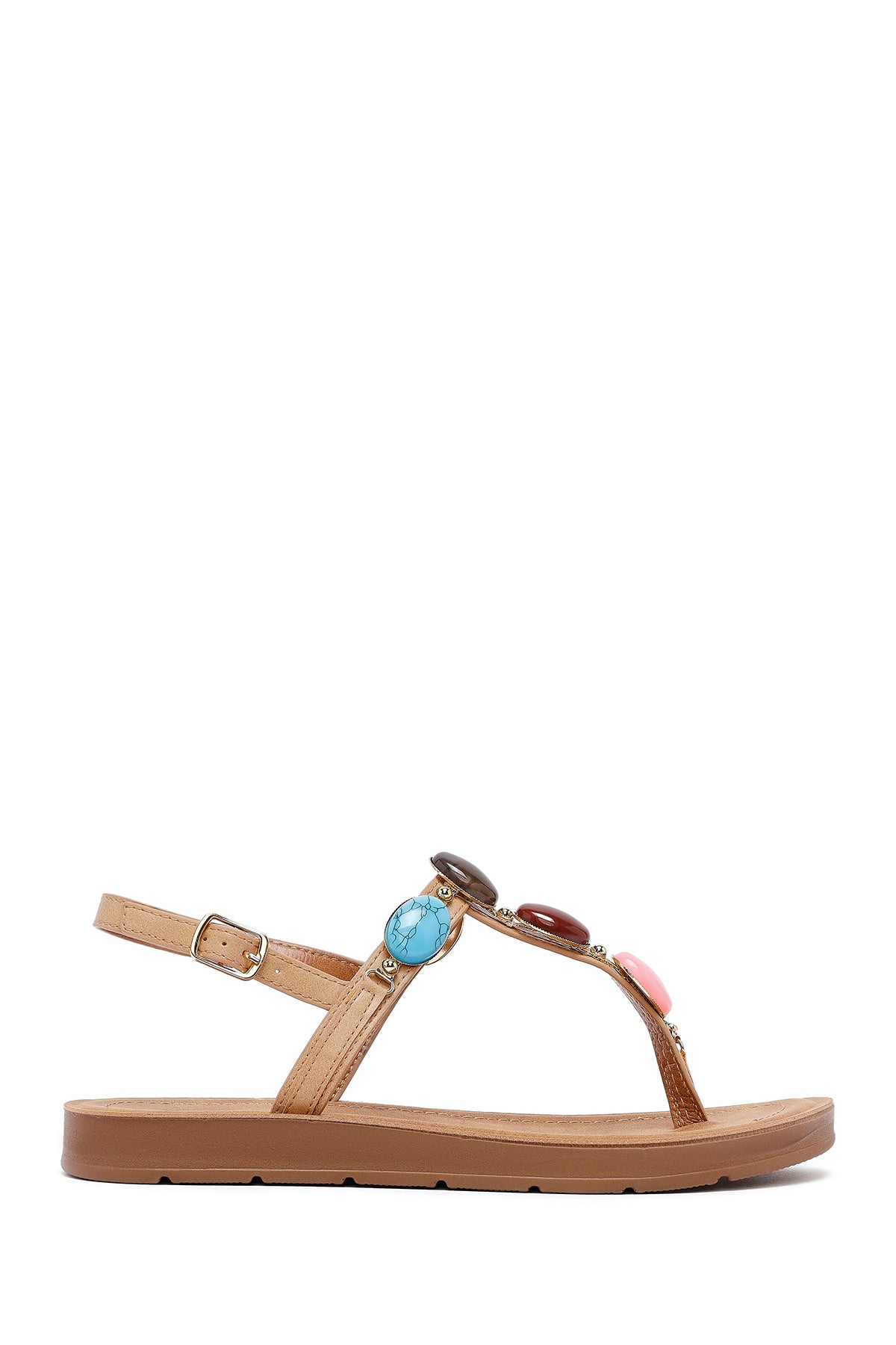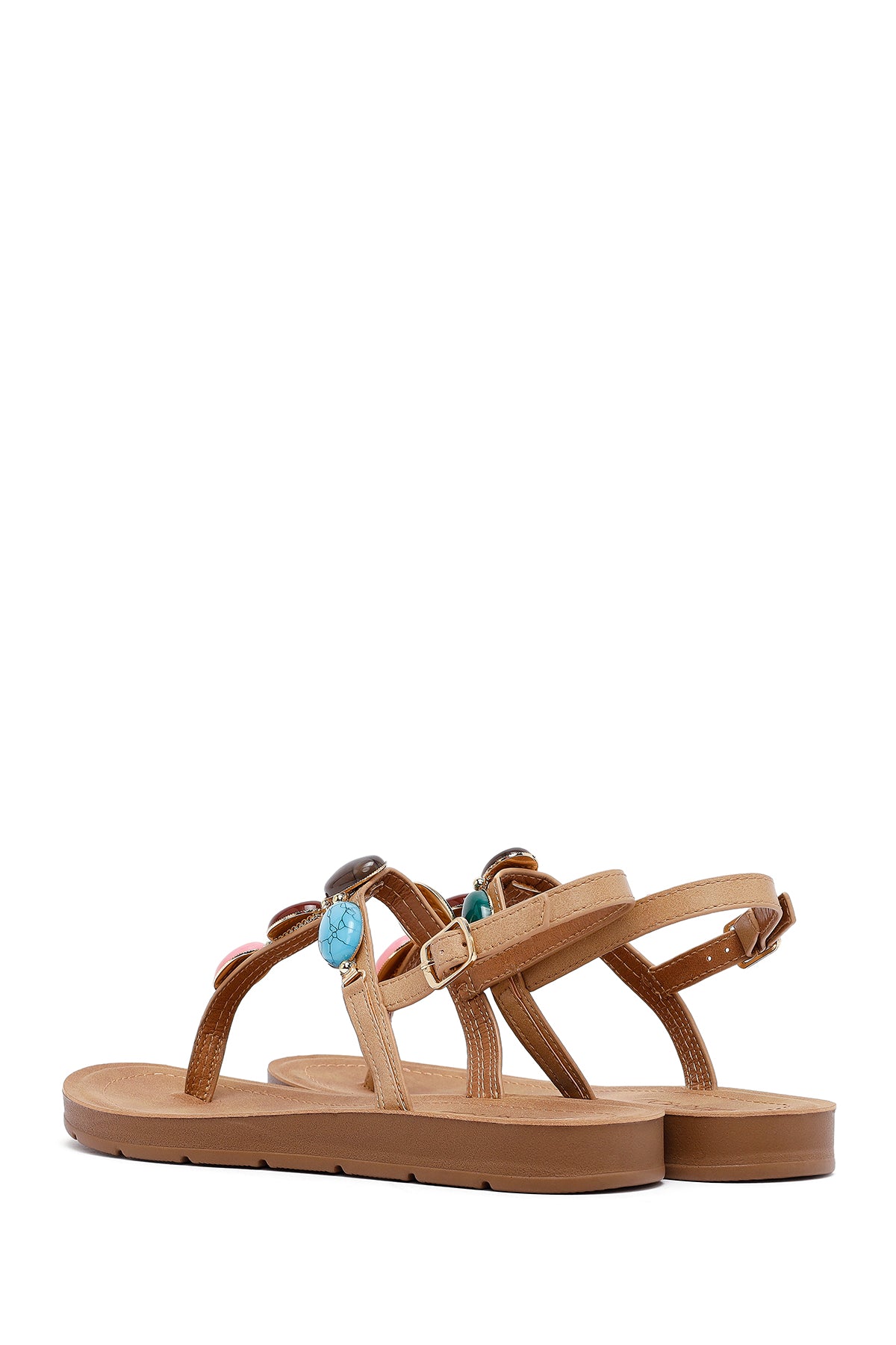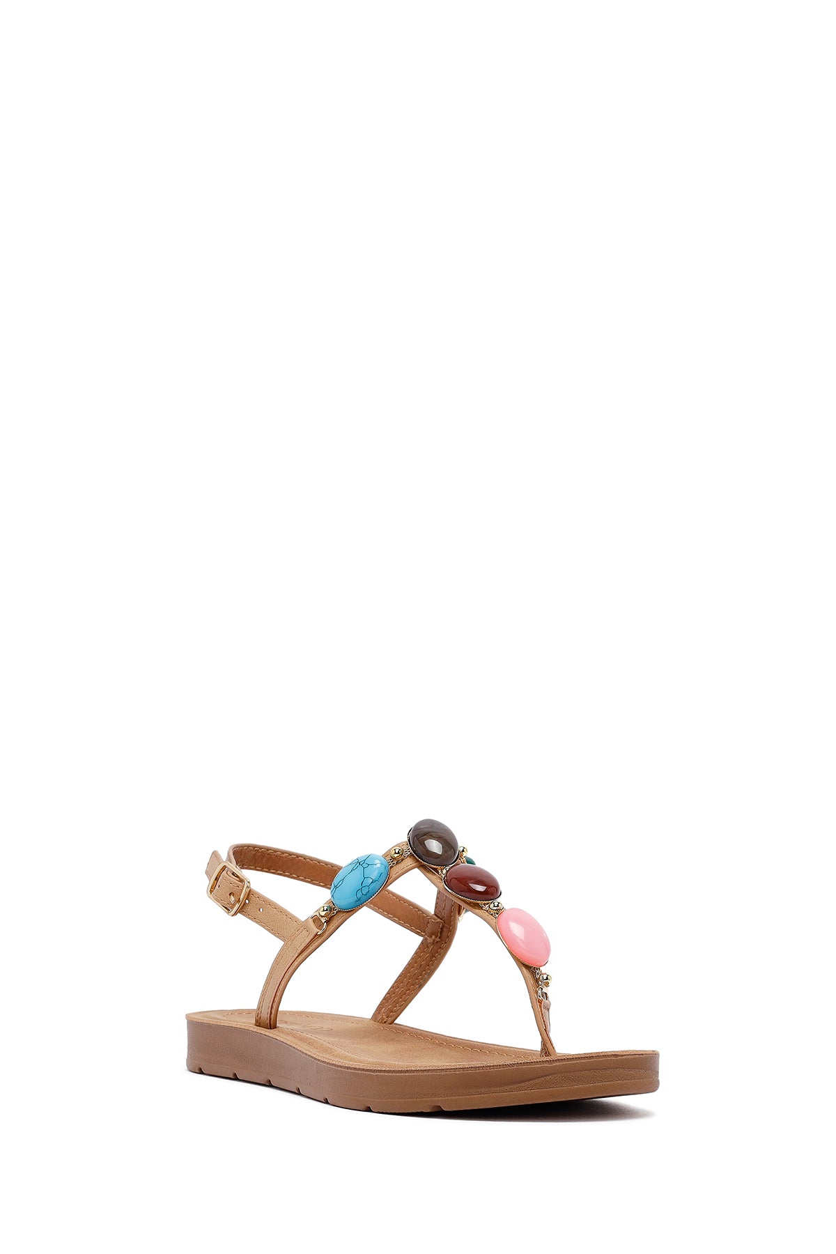Kadın Bej Parmak Arası Taşlı Sandalet
