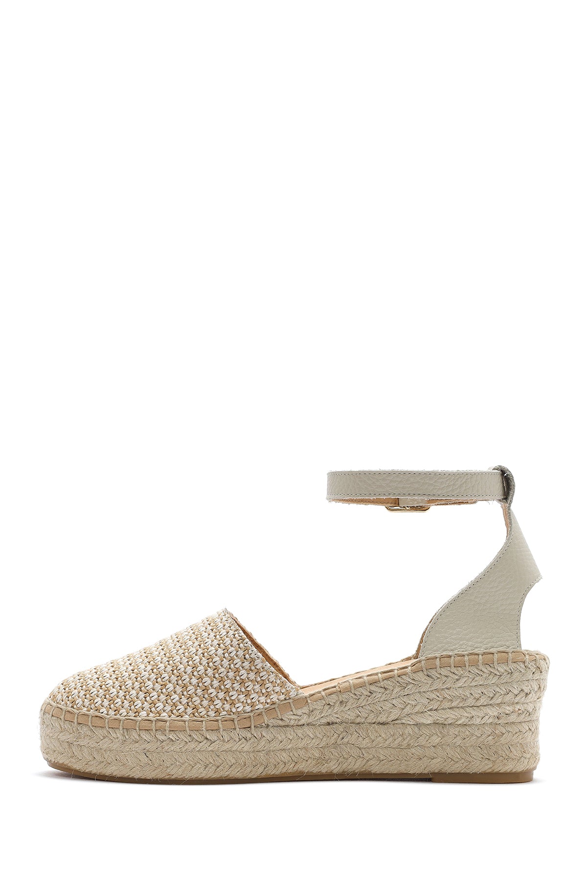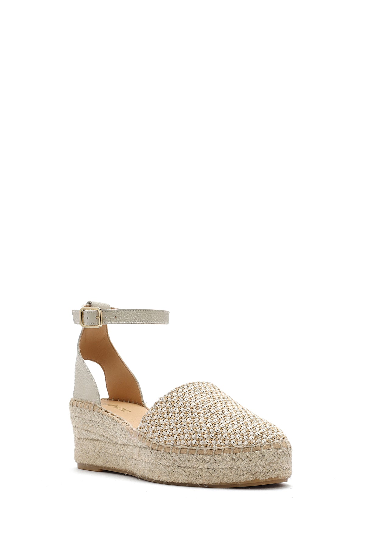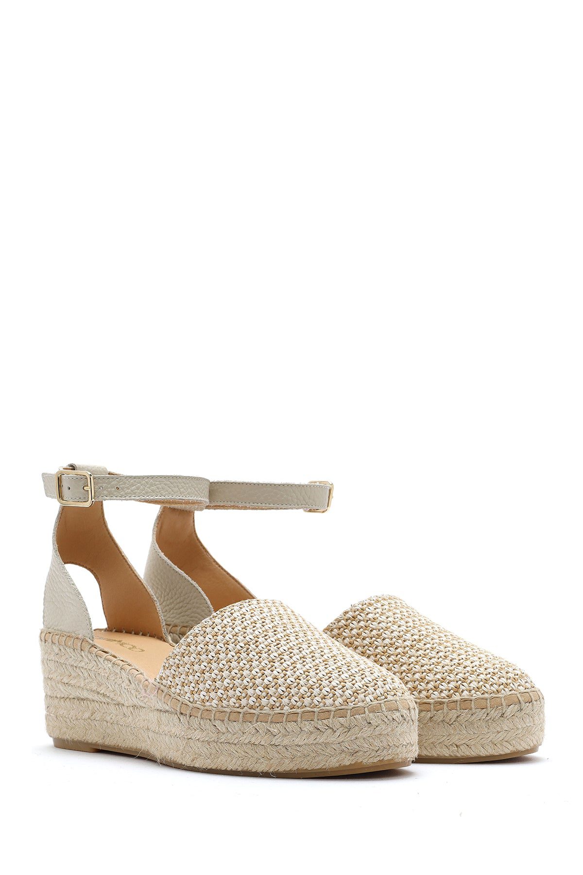 Kadın Bej Bilekten Tokalı Dolgu Topuklu Hasır Deri Espadril Sandalet